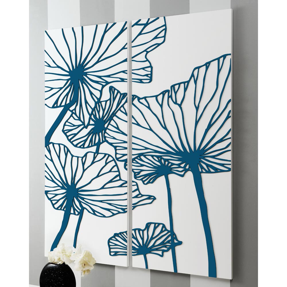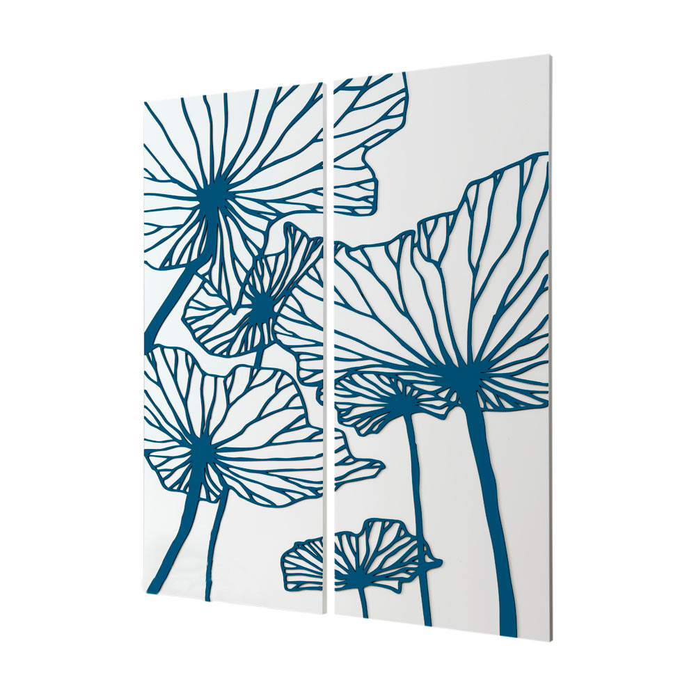 Sammansättning av två paneler i matt vitlackerat trä med applicering av bensinfärgade trädekorationer föreställande jätteblommor.