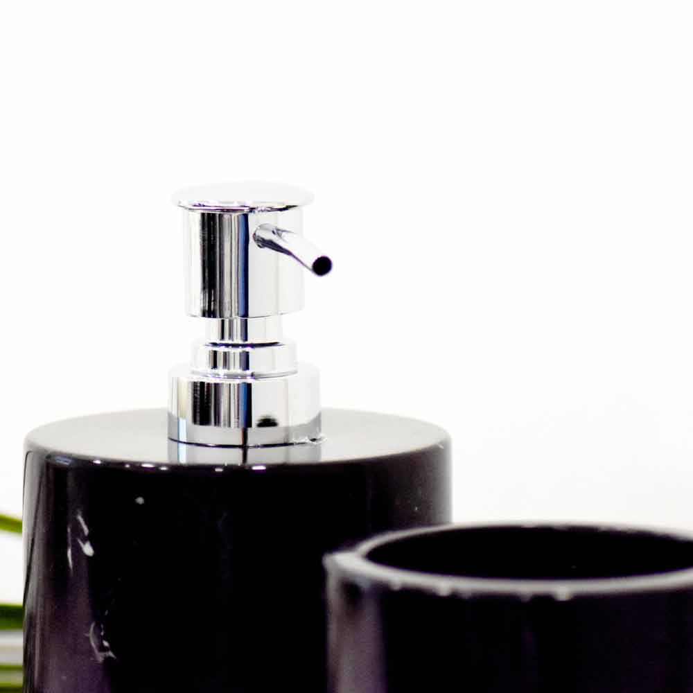 3 badrumstillbehör : en tandborstehållare, en flytande tvålautomat och en tvålfat.