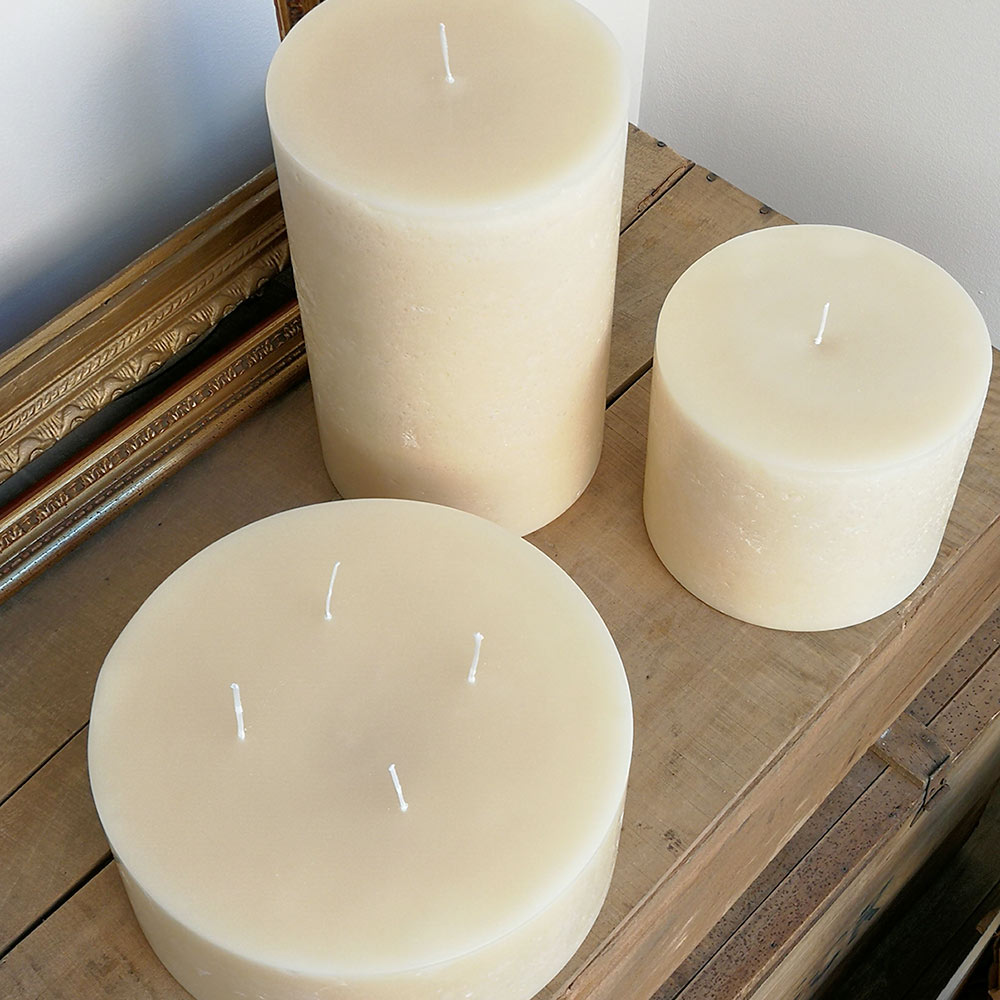 Modern komposition som innehåller tre vaxljus i olika storlekar designade och
