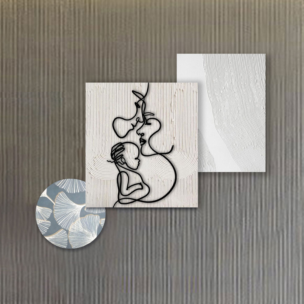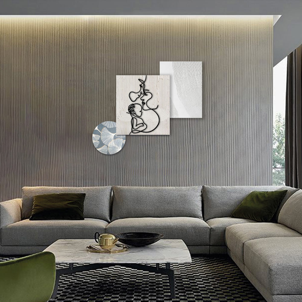 Sammansättning av tre paneler i olika former och storlekar som kombinerar laser- och tryckdekorationer . Består av tre paneler i tryckt trä : en rund med vita kronblad, en rektangulär som stiliserar kärleken till en familj och en rektangulär med linjer i hög relief.