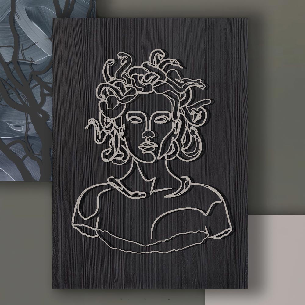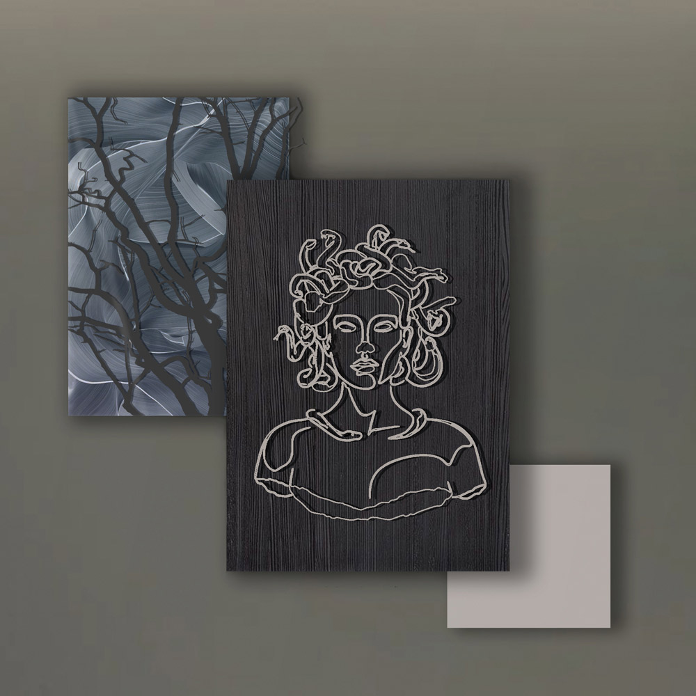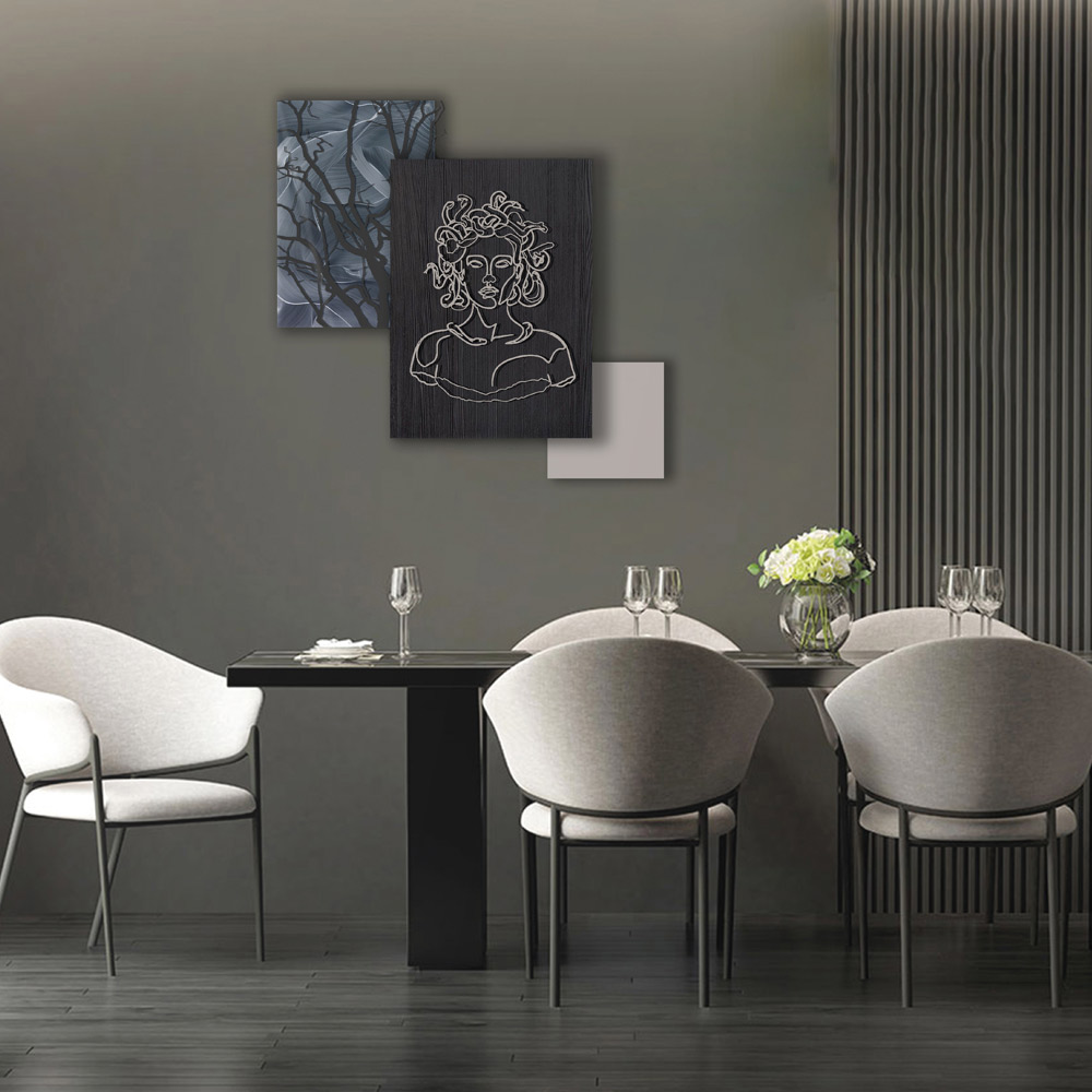 Sammansättning av tre tryckta träpaneler föreställande Medusa Made in Italy