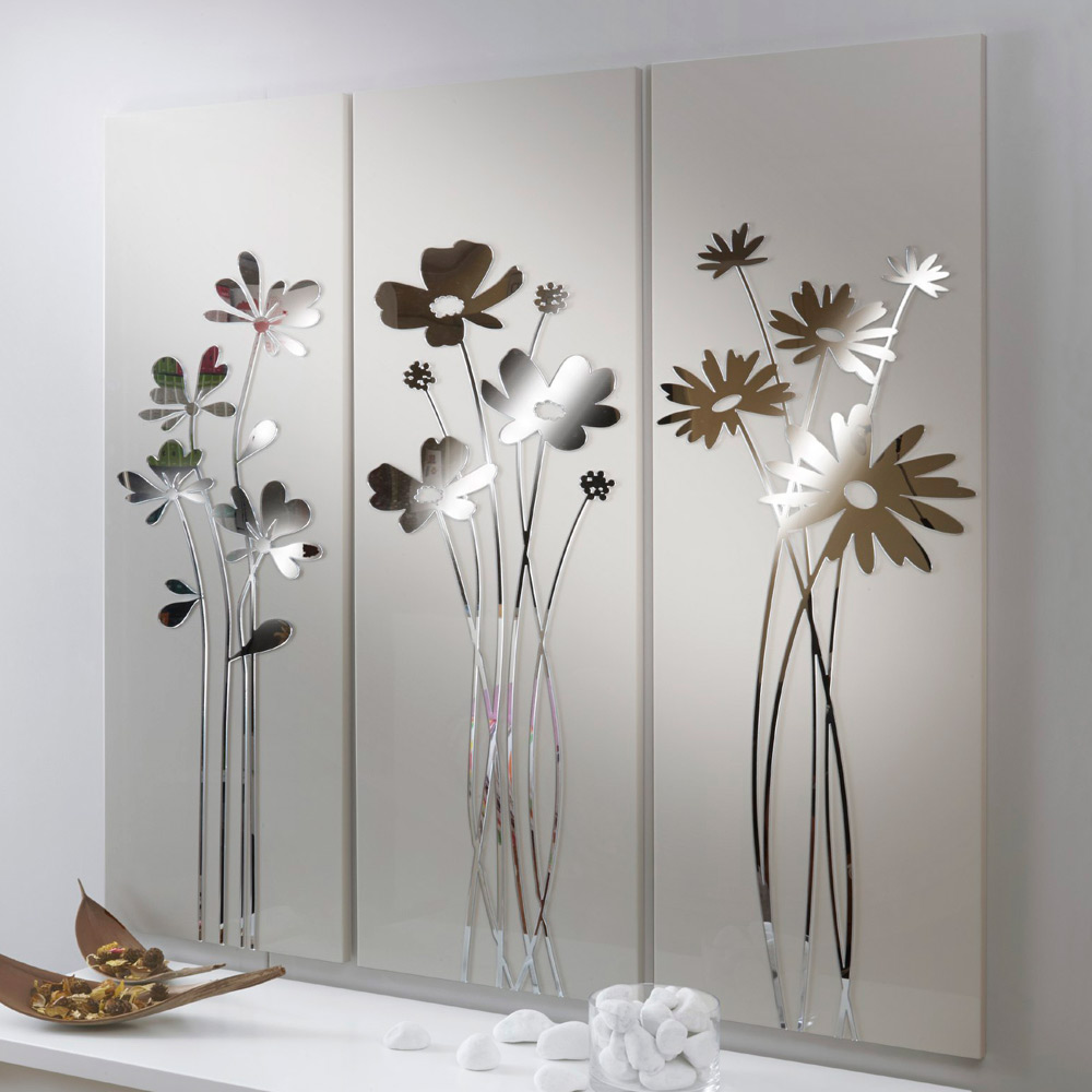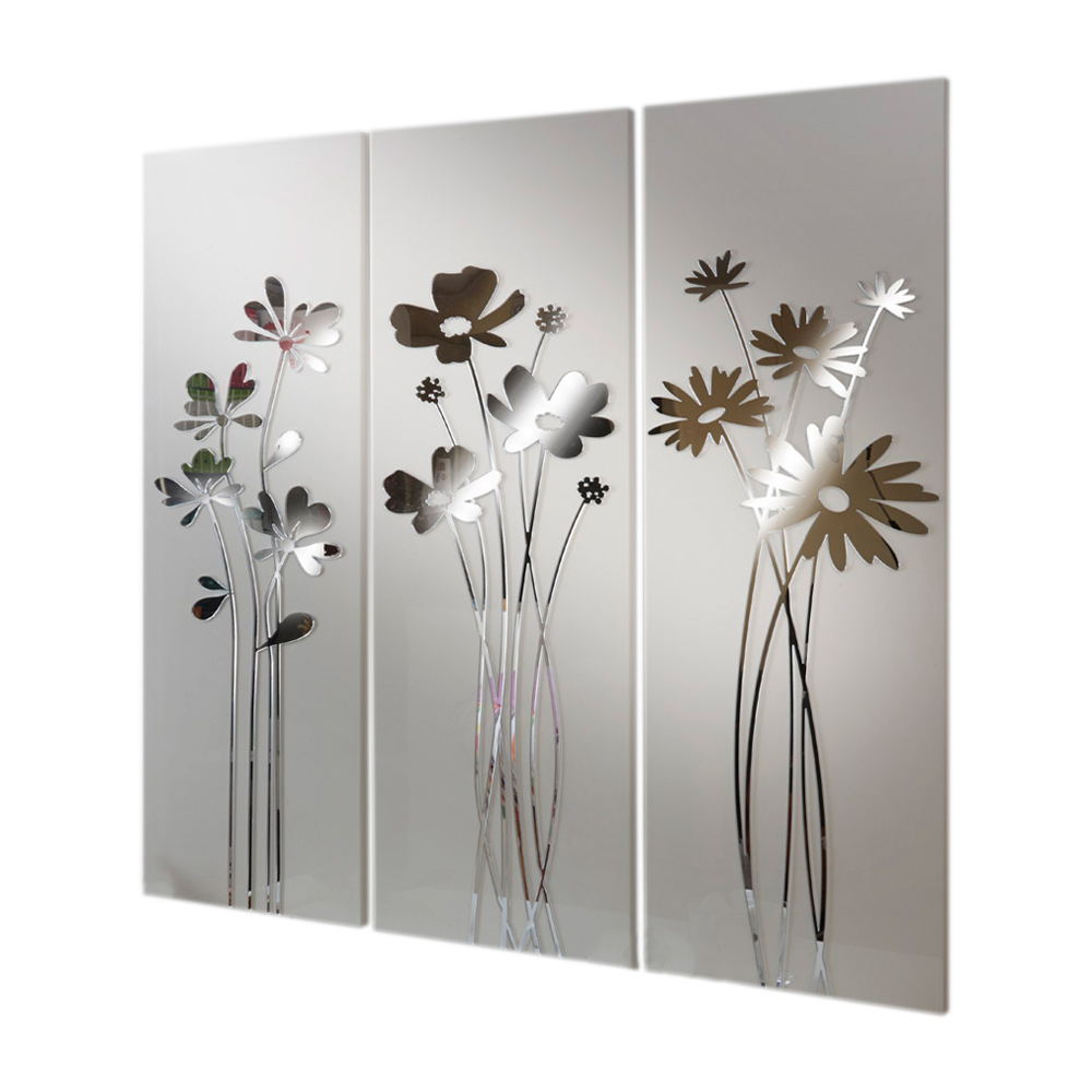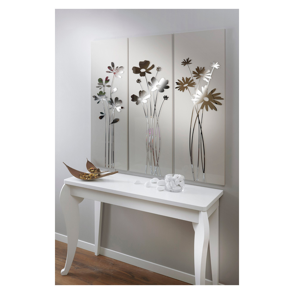 Sammansättning av 3 paneler att hänga individuellt i blankt sandlackerat trä med applicering i spegelplexiglas föreställande buketter av blommor.