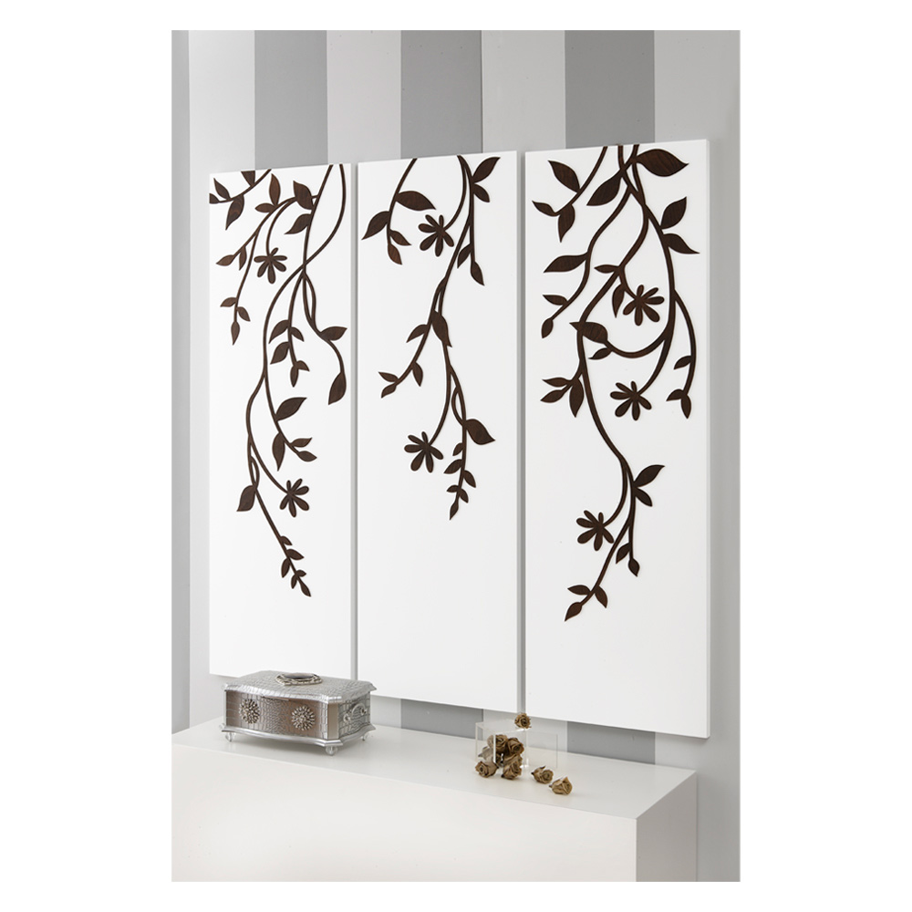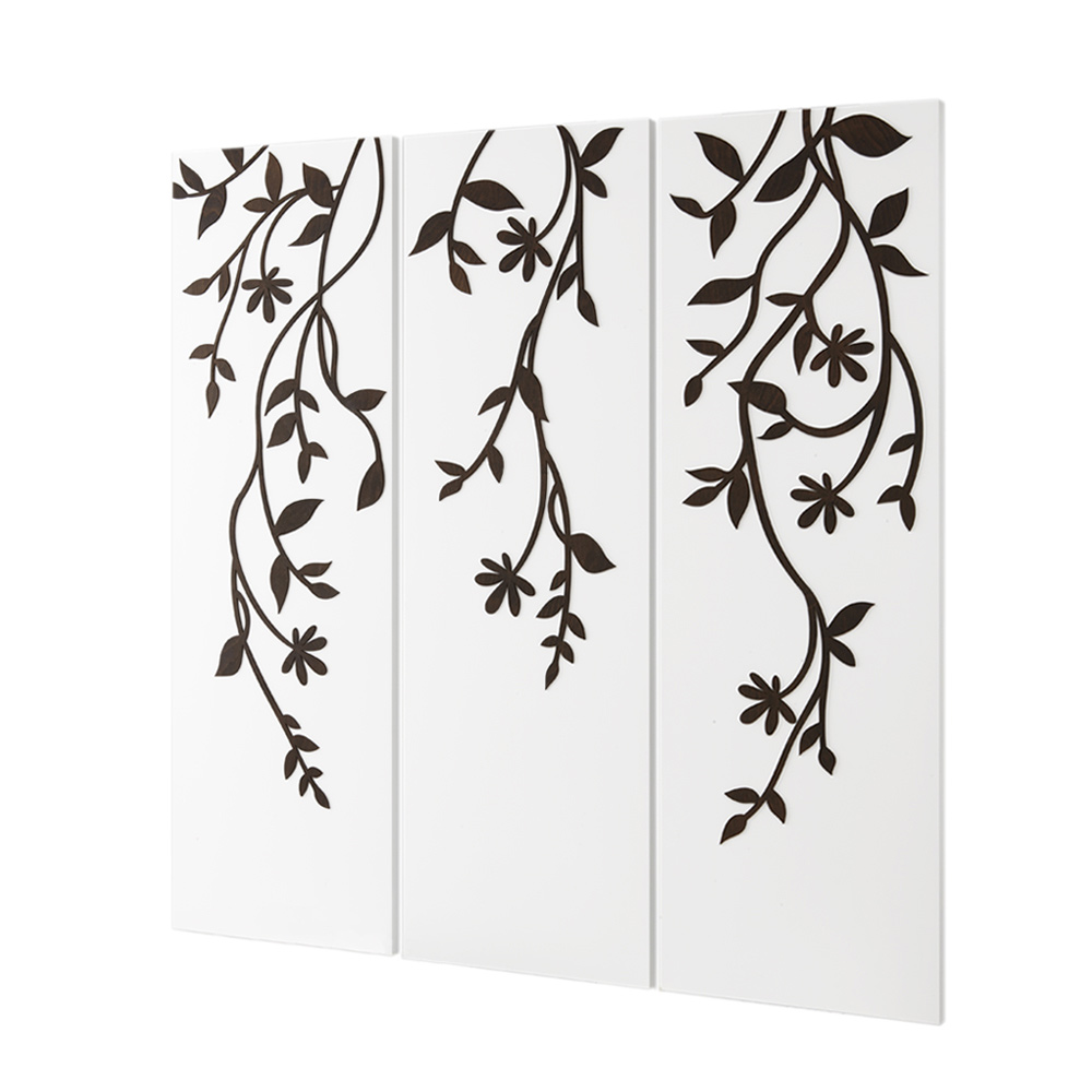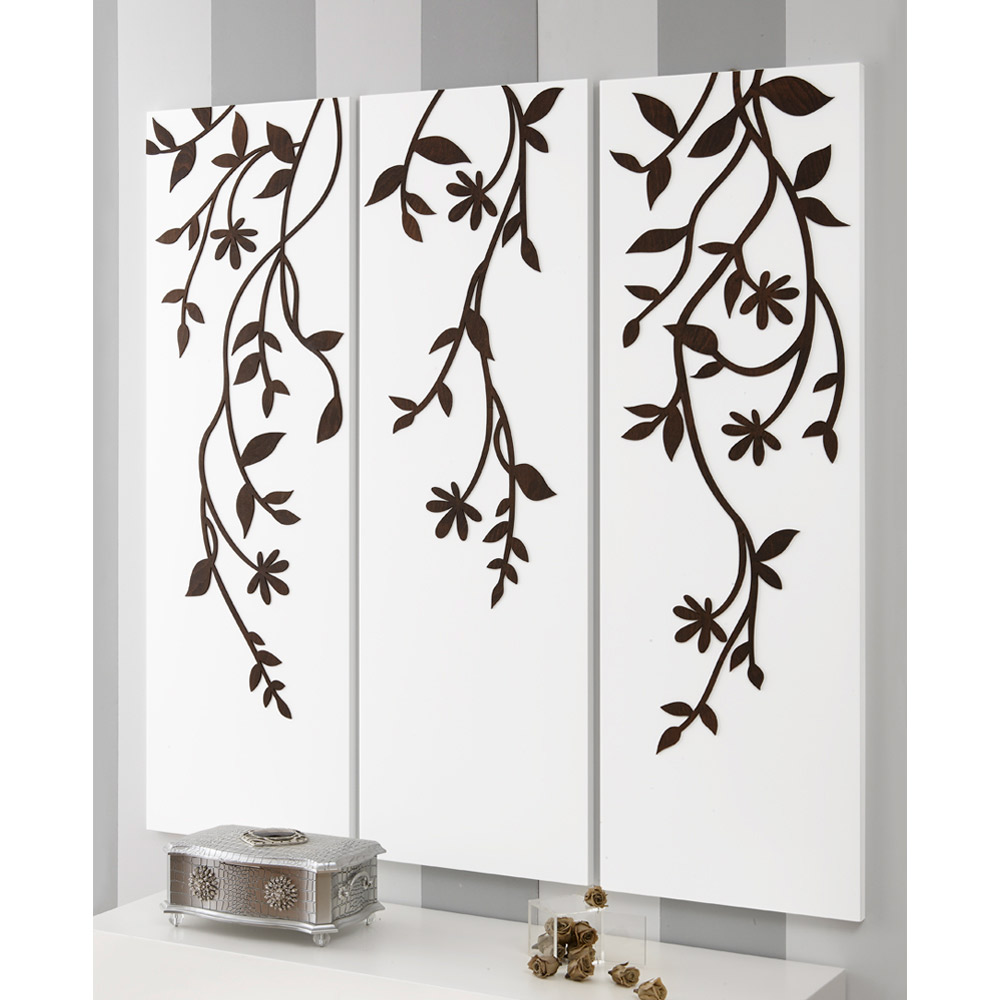Sammansättning av 3 paneler att hänga individuellt i matt vitlackerat trä med wengéträapplikation som representerar grenar med löv som faller uppifrån.