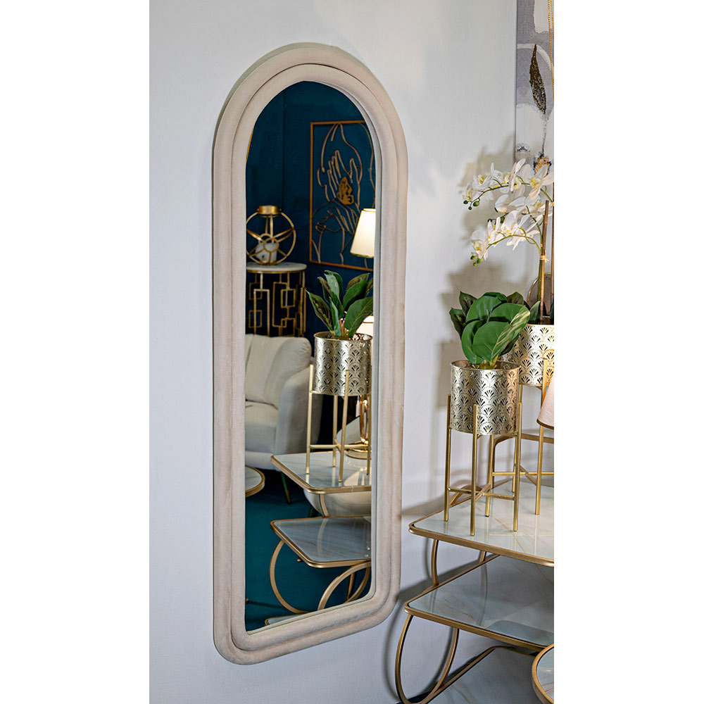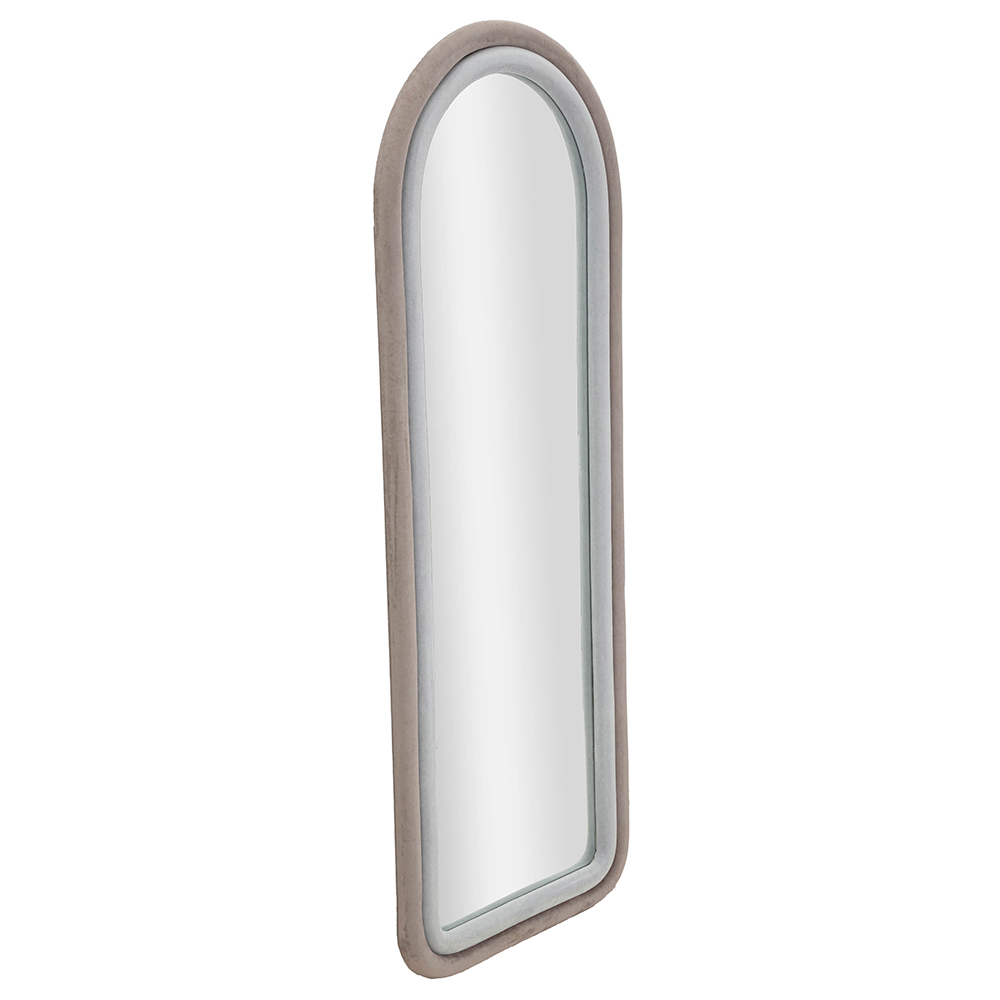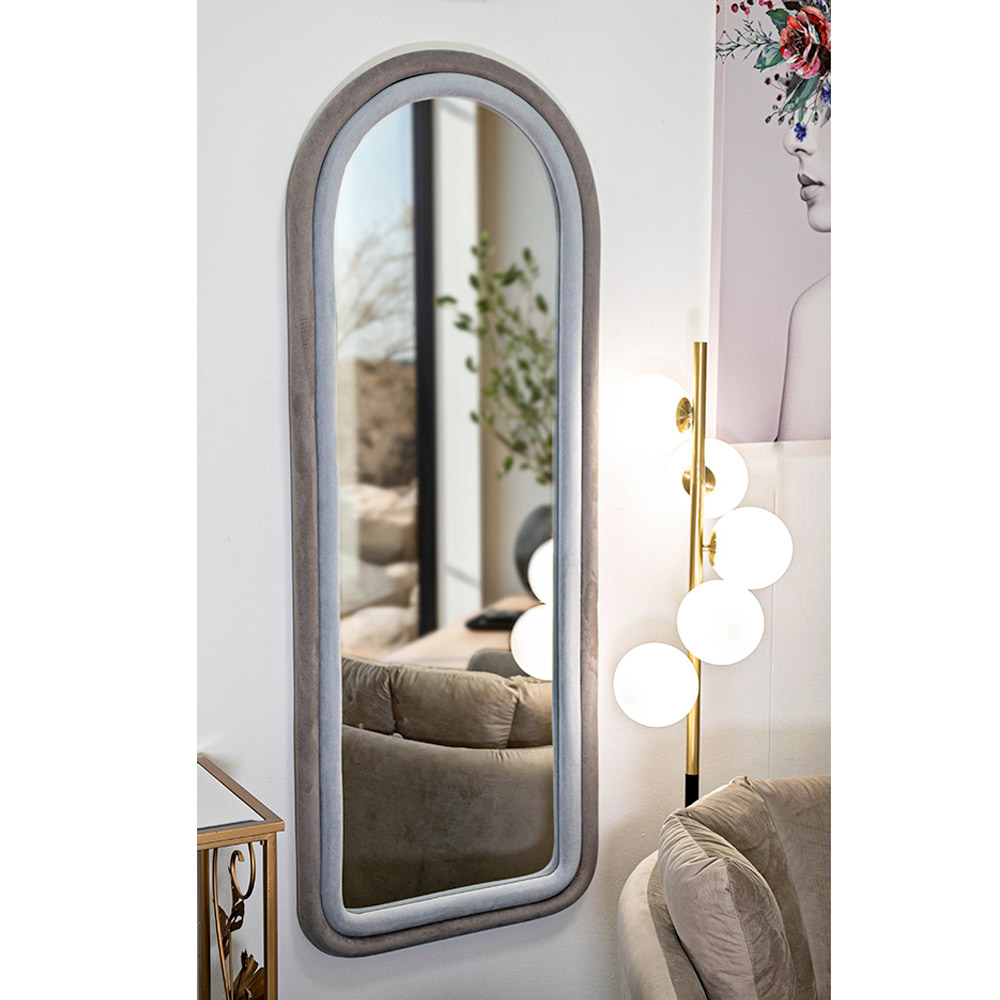Denna inramade spegel förkroppsligar essensen av modern sofistikering och gör ett uttalande som en mittpunkt i alla rum. Ramen, med mjuka och omslutande kurvor , har en design som påminner om gamla ogivala fönster, vilket för med sig en smak av klassisk elegans omtolkad i en modern tonart. Finishen på ramen smälter harmoniskt in i alla miljöer och skapar en kontrast av färger som är ett rent nöje för ögonen.