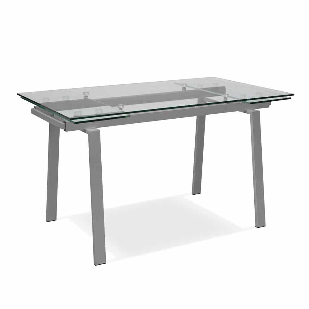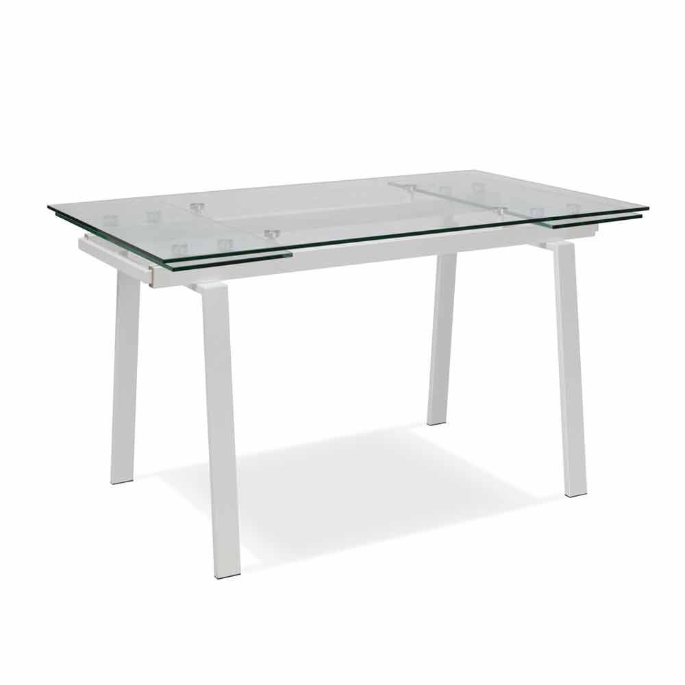 Utdragbart designbord med lackerad metallbas. Topp och förlängningar i genomskinligt härdat glas.