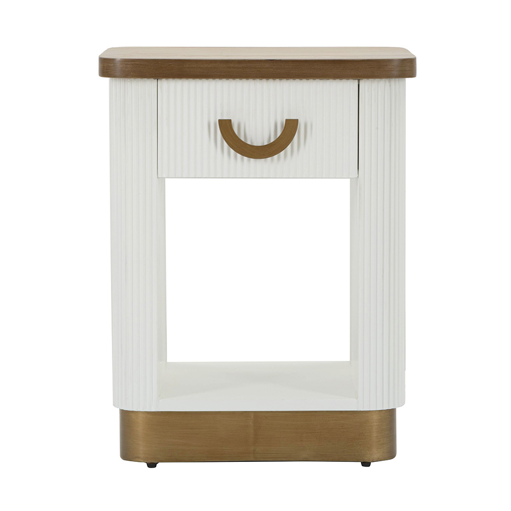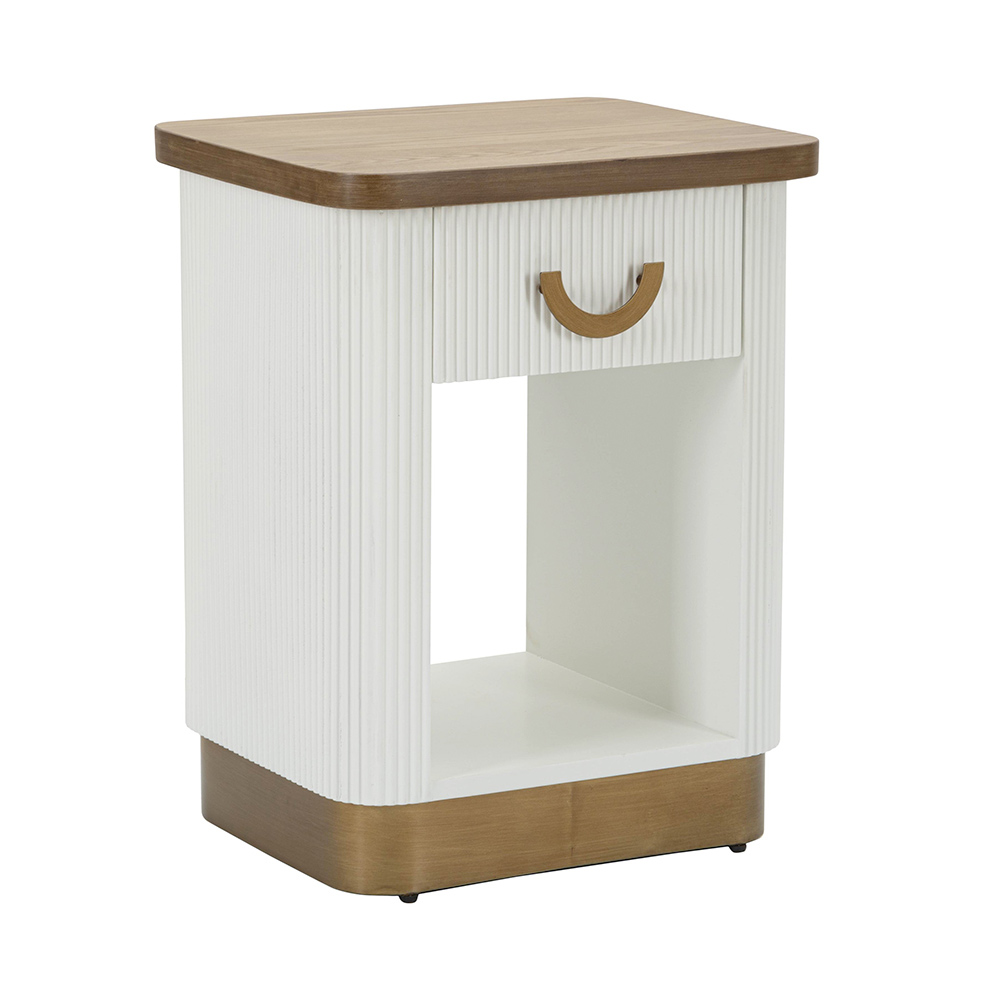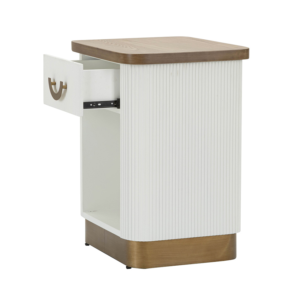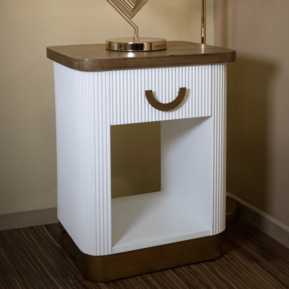 Sängbordets räfflade vita bas är ett uttryck för modern elegans , med sina rena linjer och vertikala struktur som ger djup och visuellt intresse. Detaljen på handtaget smälter perfekt in i basen, vilket ger en vintage men ändå modern look.