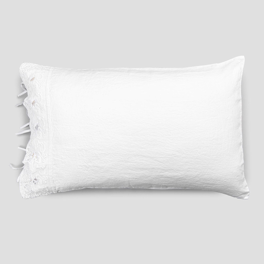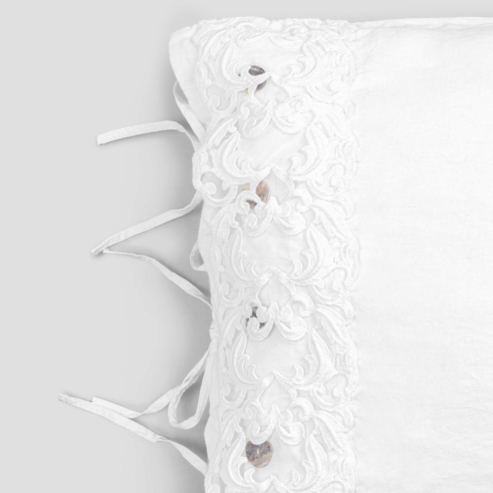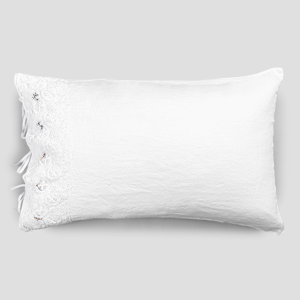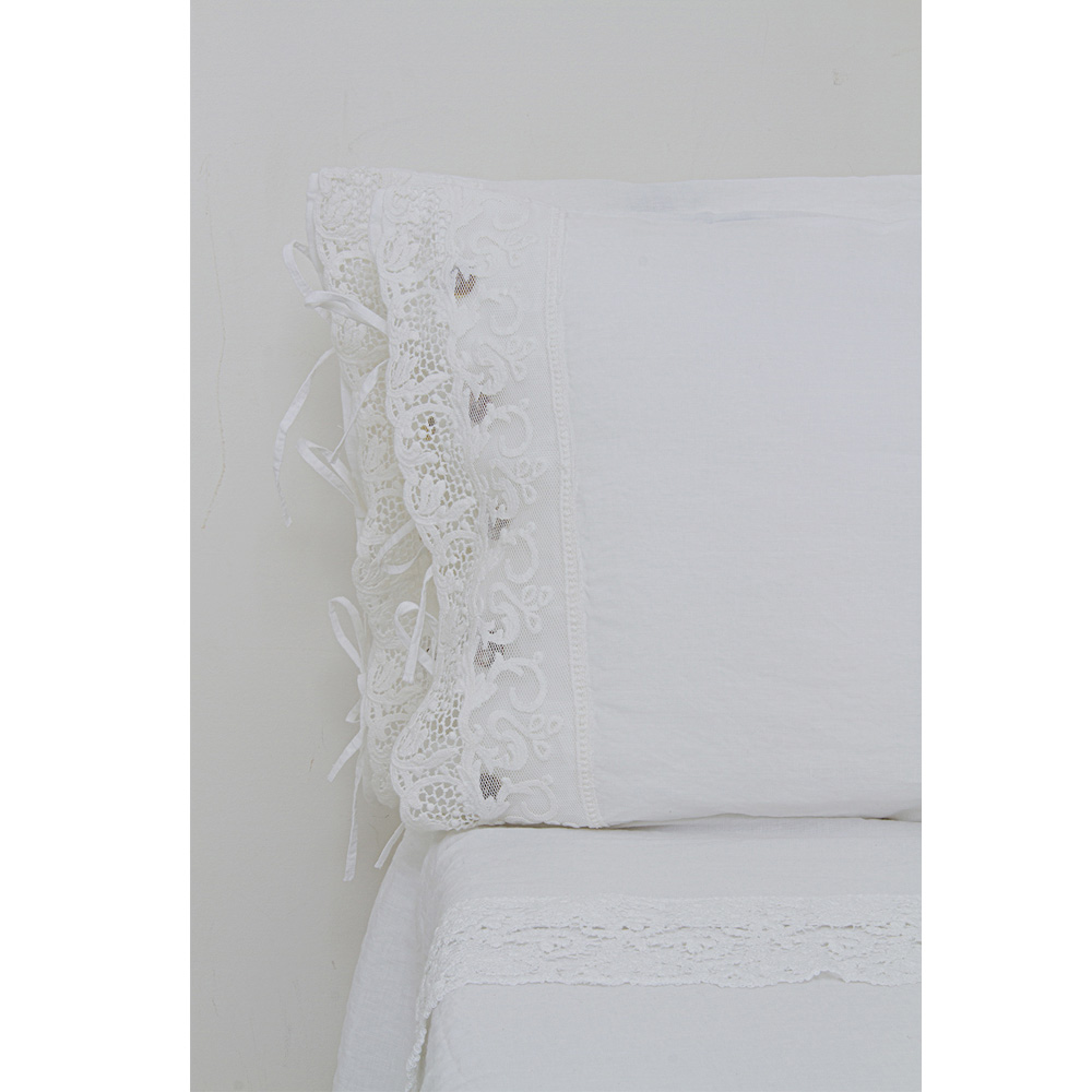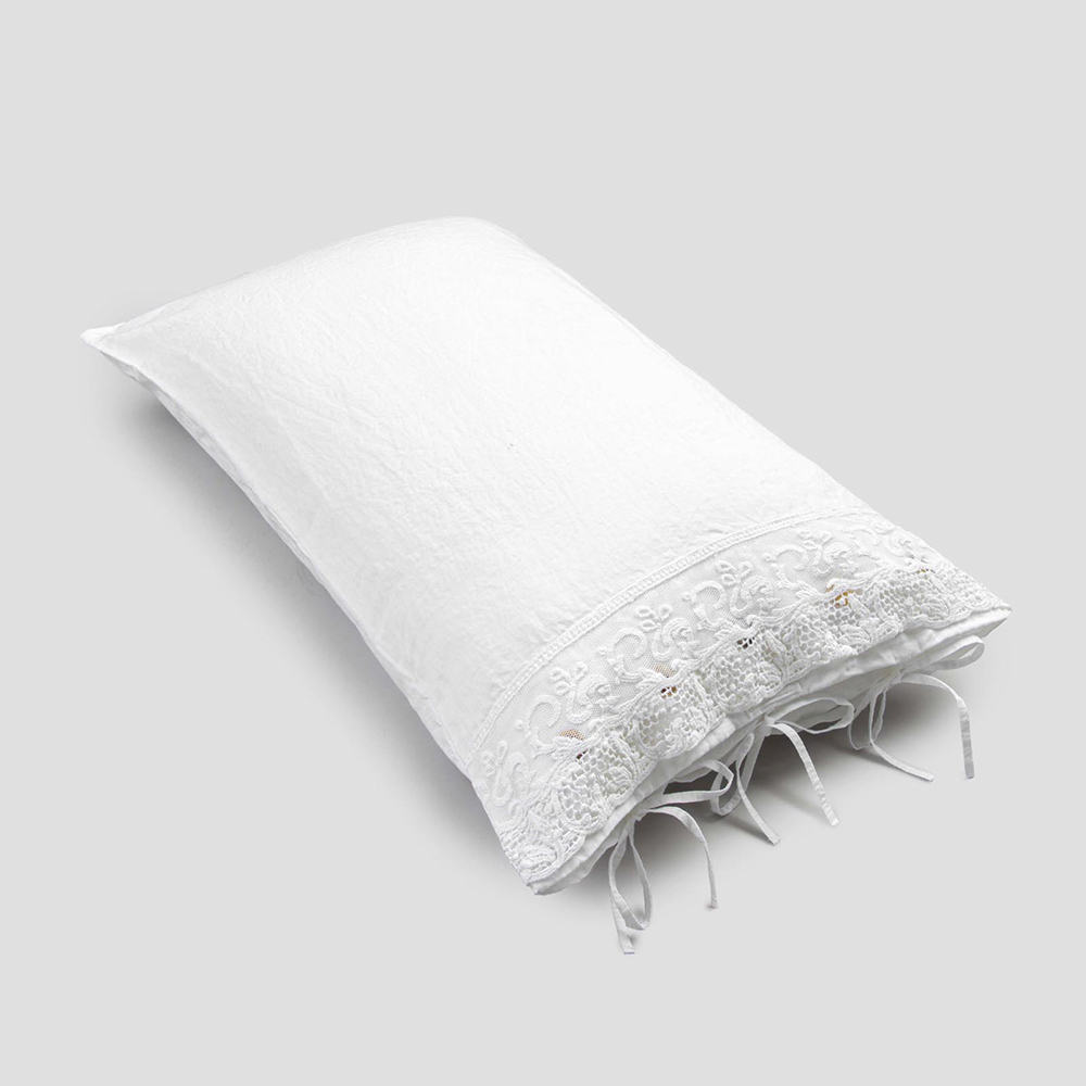 Ren vitt linne säng örngott med olika typer av spetsar, knappar och spetsar stängning, lyxig handgjord design tillverkad i Italien.