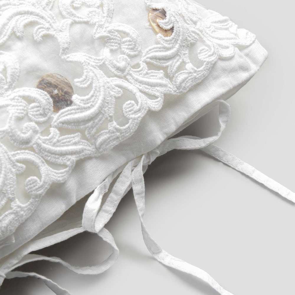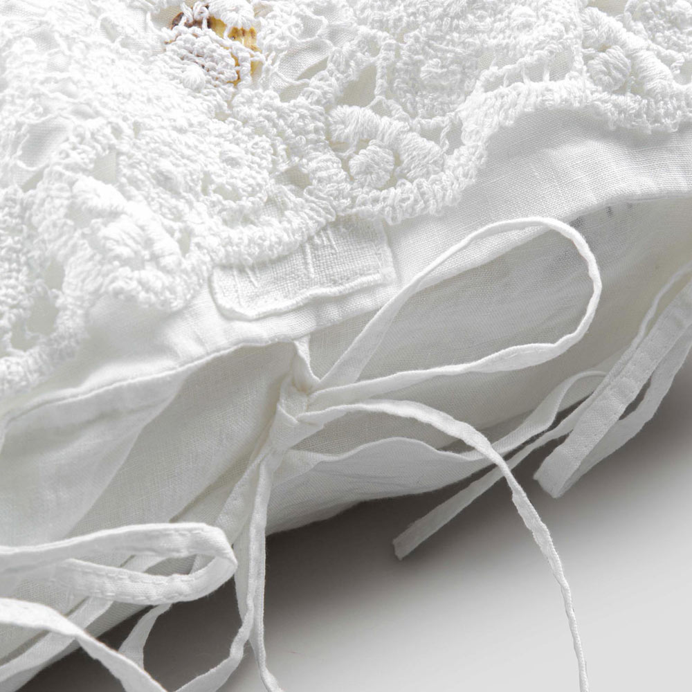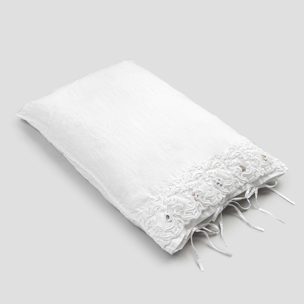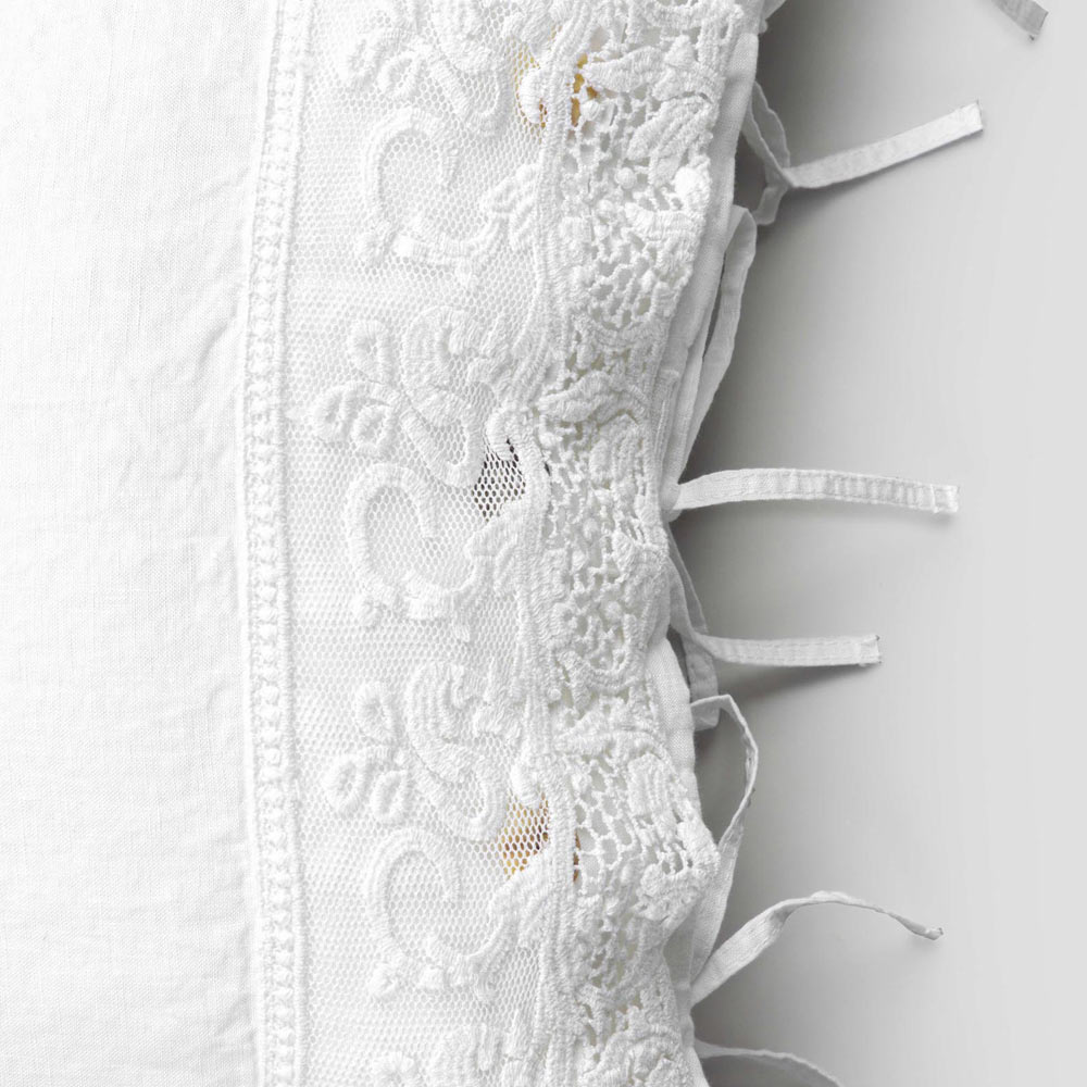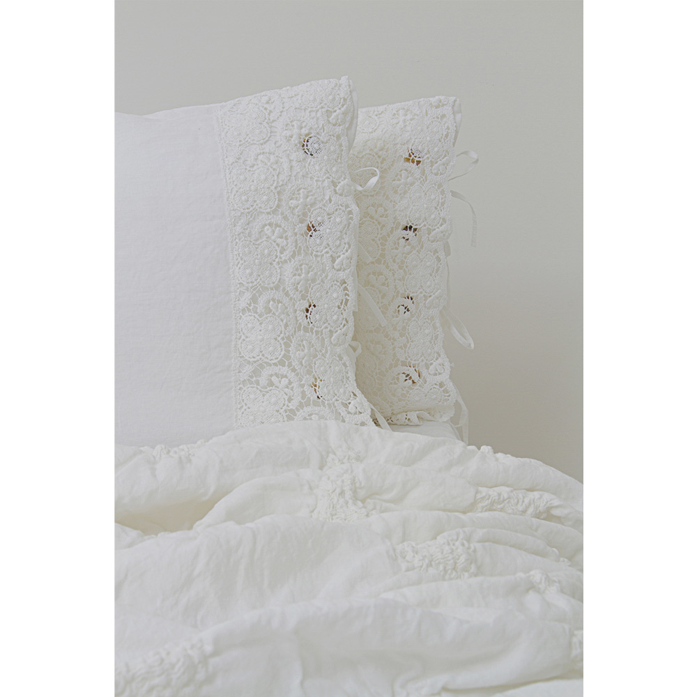 Ren vitt linne säng örngott med olika typer av spetsar, knappar och spetsar stängning, lyxig handgjord design tillverkad i Italien.