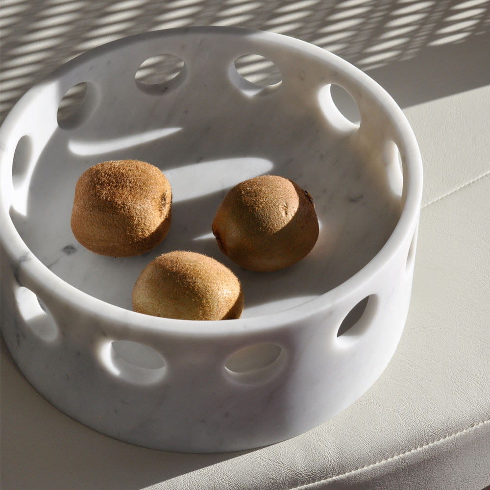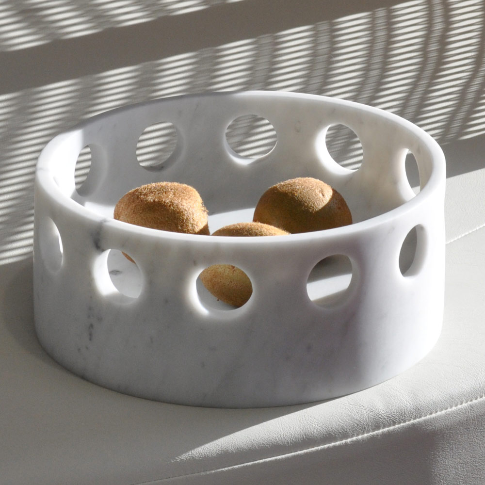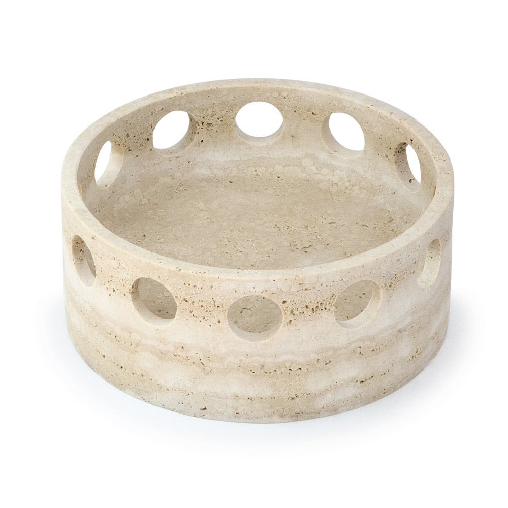 Tillför en touch av raffinerad elegans till ditt hem med denna mittdel/ficka i marmor . Den runda designen och symmetriska perforeringarna gör den till ett unikt och stilrent föremål, perfekt för att enkelt berika alla bord eller konsoler. Kvaliteten på marmor, ett hållbart och ädelt material, hyllar det bästa av italienska hantverk .