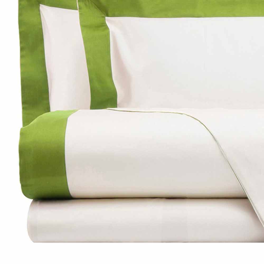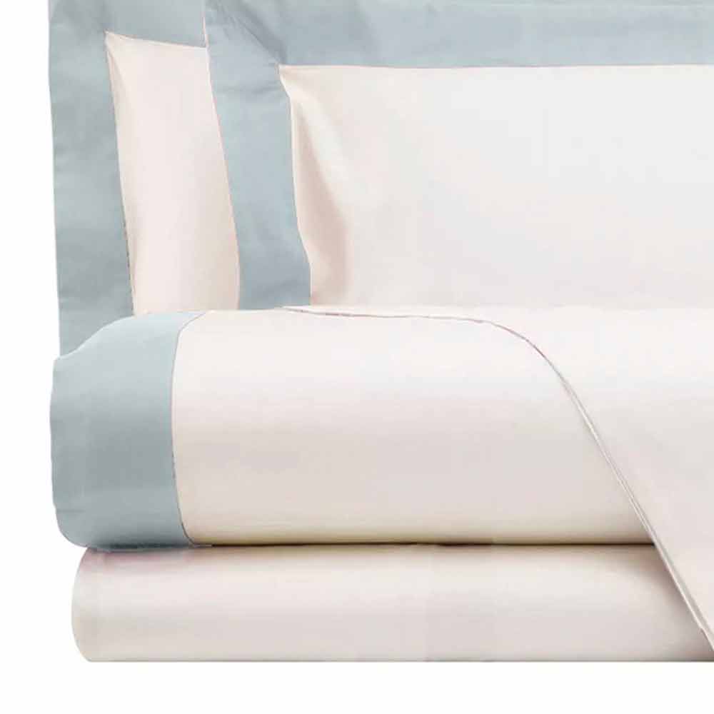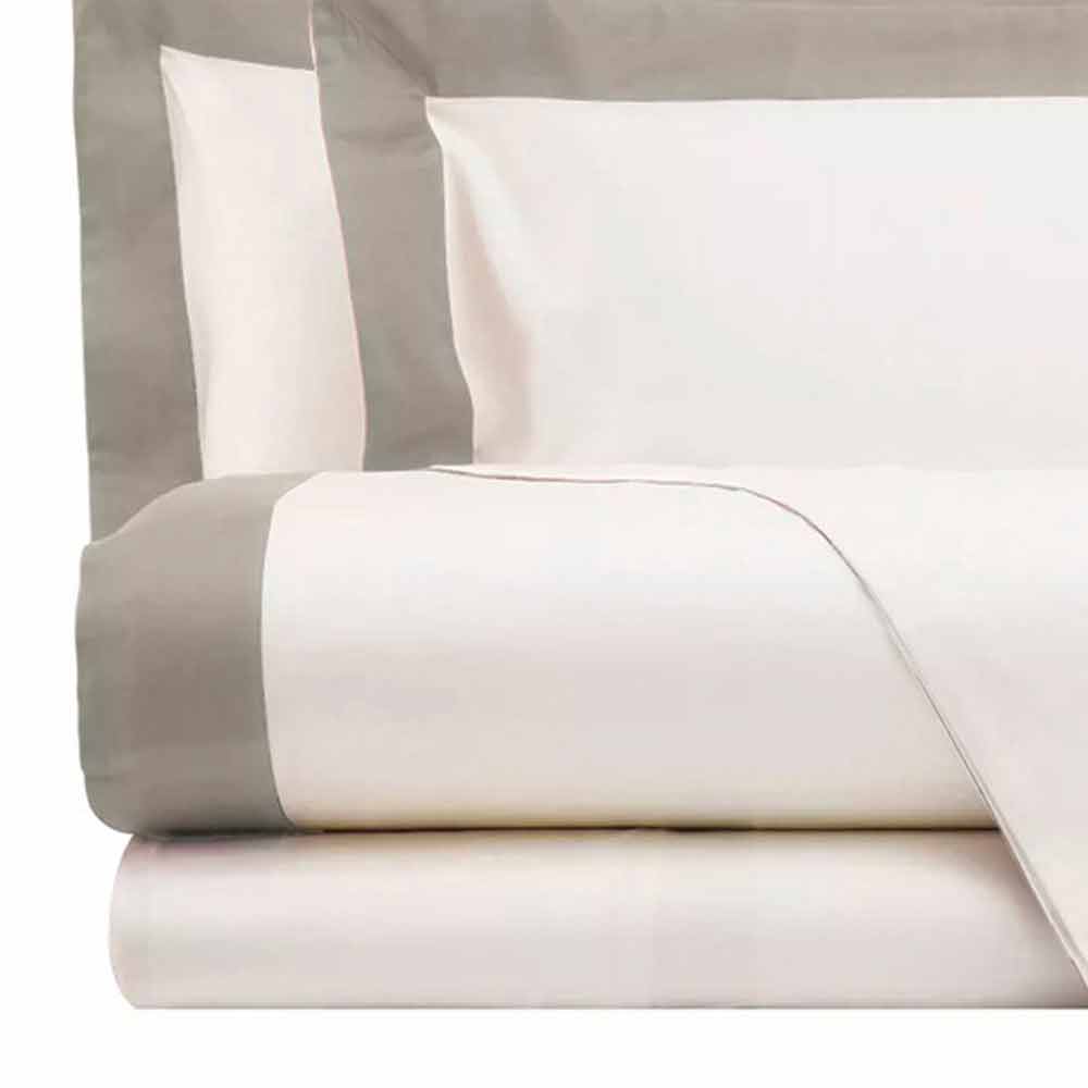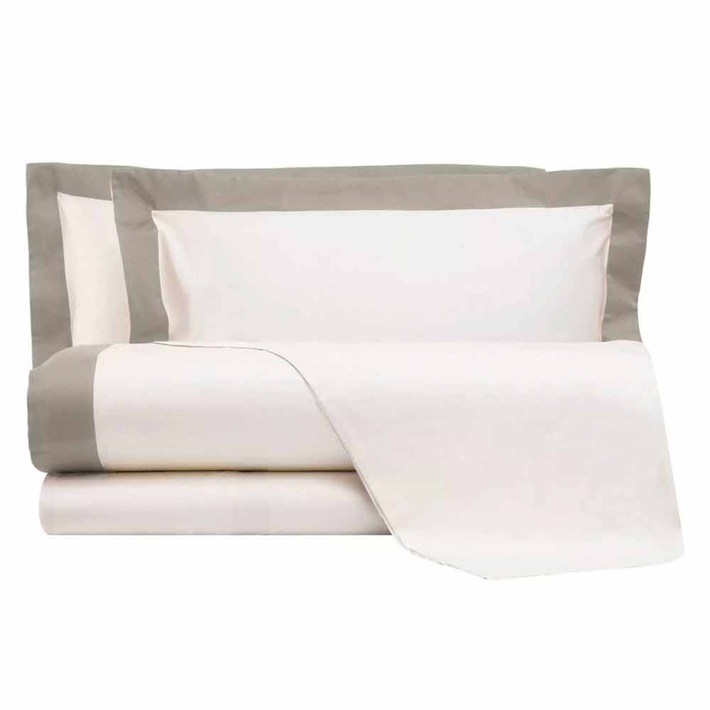 Komplett med elfenbenskivor med kontrasterande kant i olika färger för dubbelsäng i satin 200 TC tillverkad i Italien.