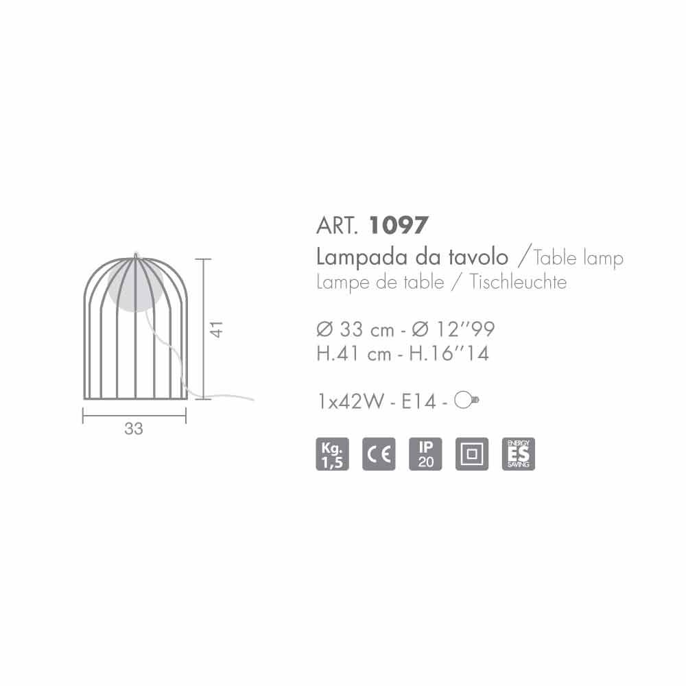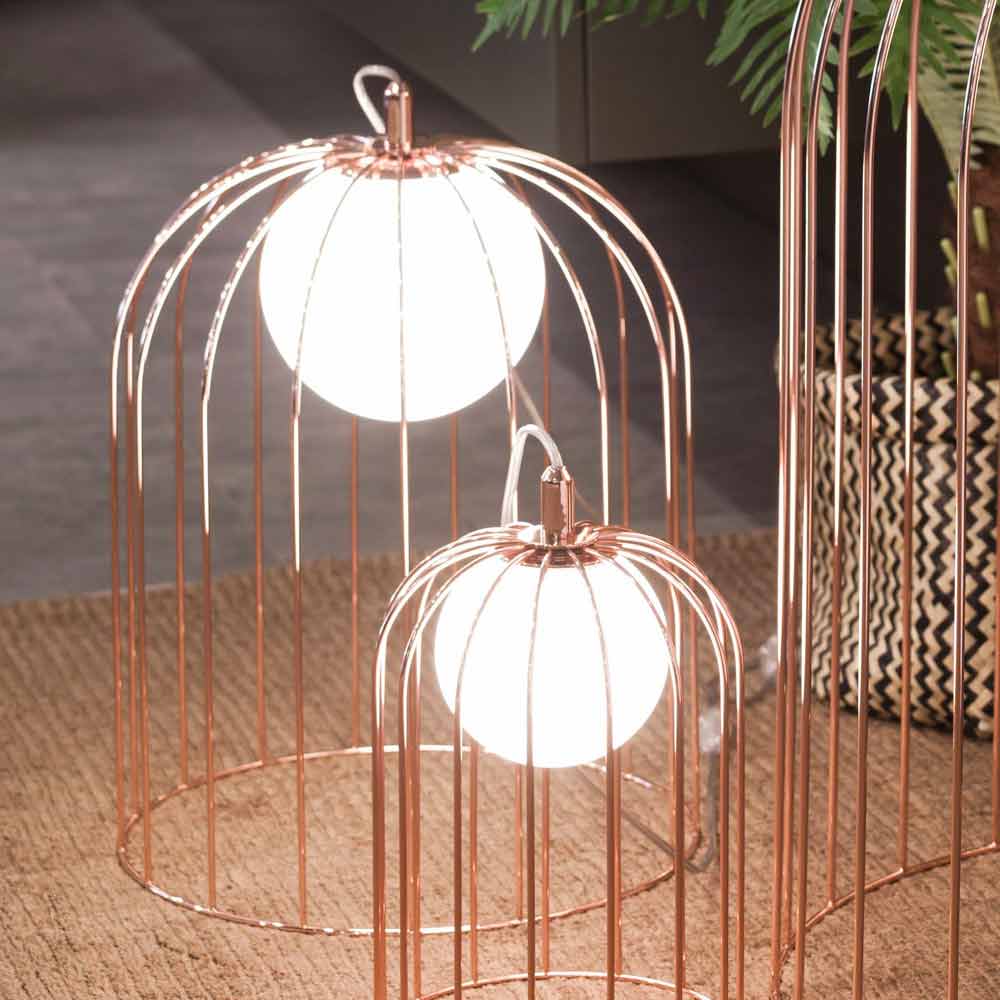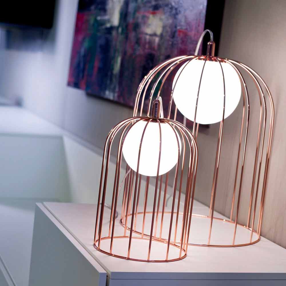 Kluvì är en bordslampa består av en metallbur och en sfär i mjölkvit blåst glas. Finish: polerad koppar; förberedd för 'utiizzo en glödlampa 42W - E14.