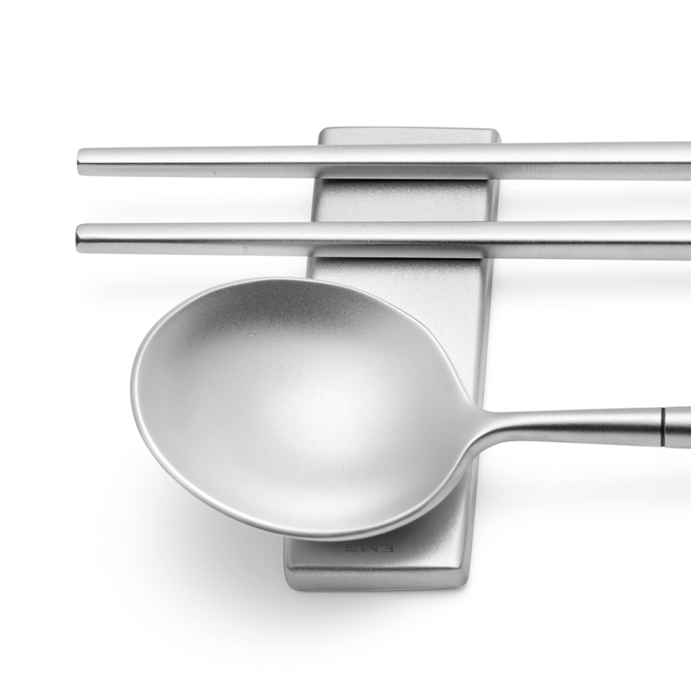 De långa, smala ätpinnarna är designade för bekväm användning och ett säkert grepp, samtidigt som skeden har ett optimalt djup för att lätt dricka buljonger och såser. Det utmärkande elementet är den fyrkantiga basen som fungerar som ett stöd för bestick, vilket säkerställer att det alltid förblir rent och väl presenterat när det inte används.