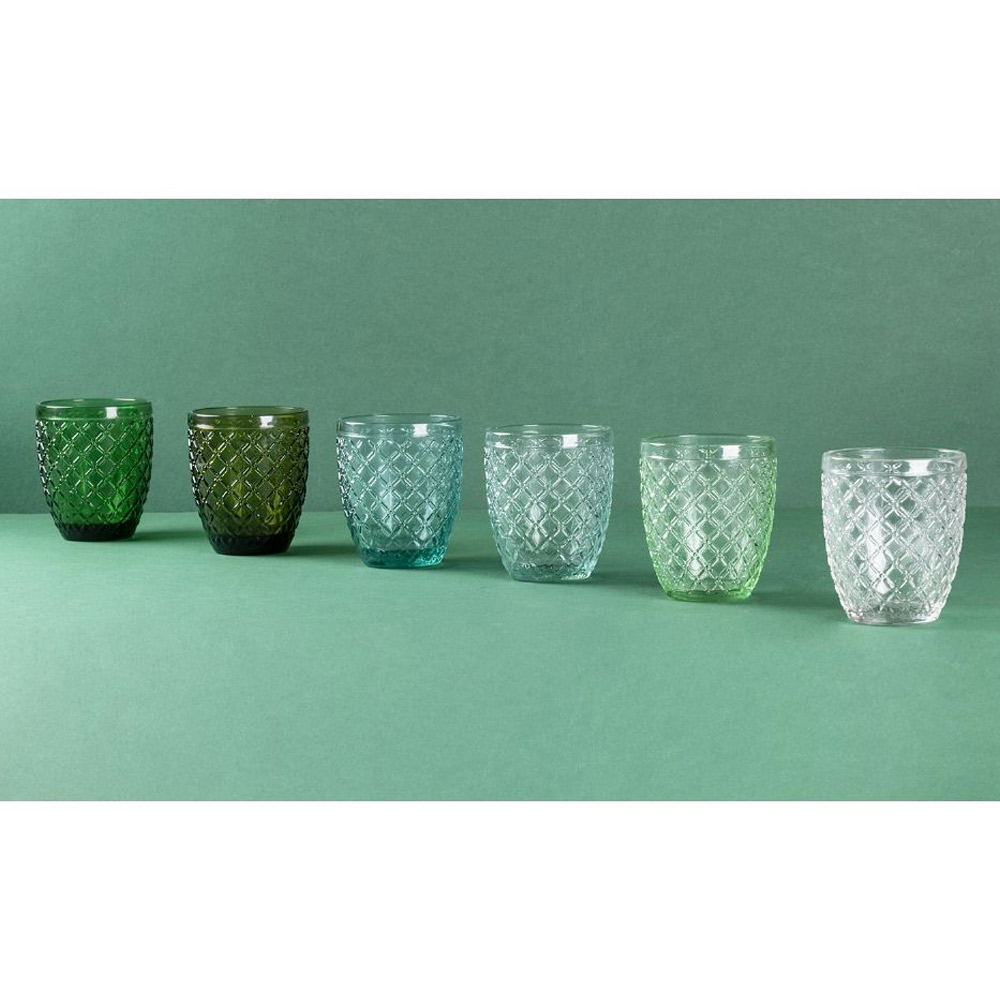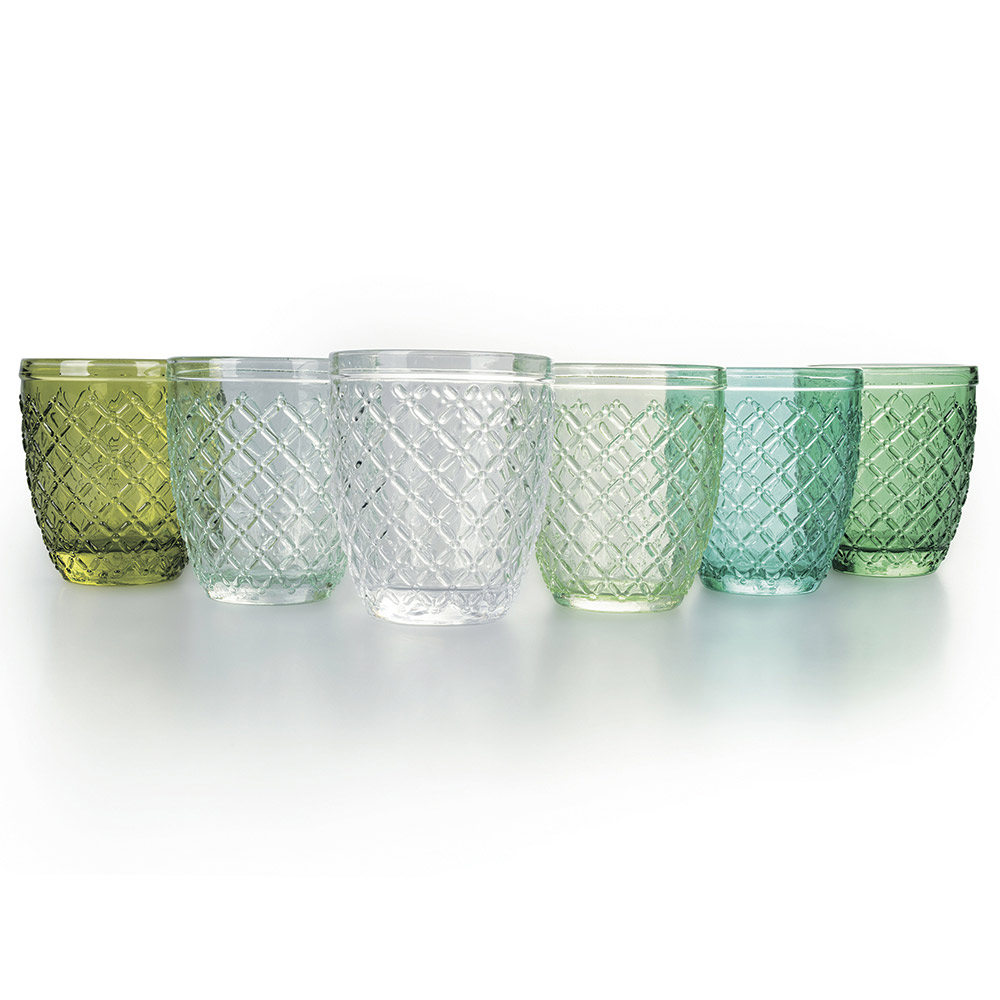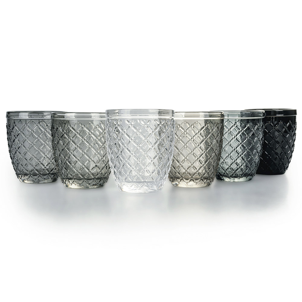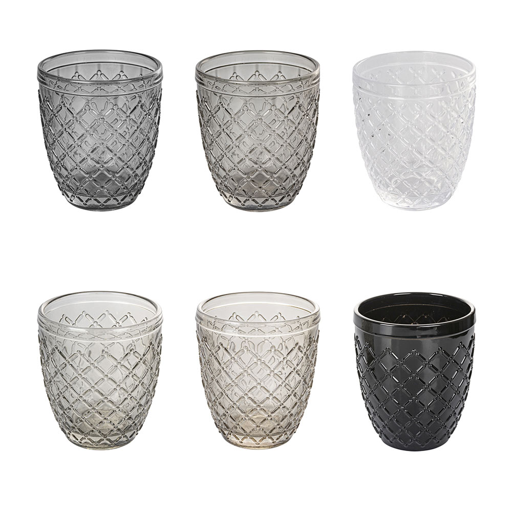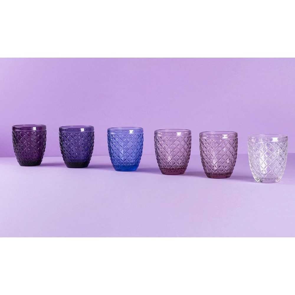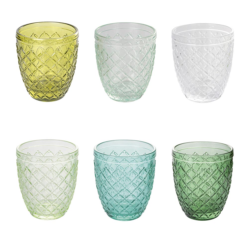 Utforska en värld av färg med denna uppsättning med 12 glas , som vart och ett fångar essensen av en atmosfär eller en tid på dagen. Setet innehåller glas i nyanser av morgonsolens gyllene bärnsten, den intensiva röda av en festlig kväll och den frodiga gröna som minner om frodiga betesmarker. Serien fortsätter med eftermiddagshimlens fridfulla blå , den stjärnklara nattens sofistikerade lila och månskenets kristallina vita . Varje glas är prydt med ett vattendroppsmönster , inte bara för en tilltalande visuell effekt, utan också för en unik taktil upplevelse. De är perfekta för alla tillfällen, från frukost till brunch till en kvällsaperitif, vilket ger en touch av stil och förfining till varje bord. Välj den här uppsättningen för att ge varje ögonblick liv med en touch av elegans .