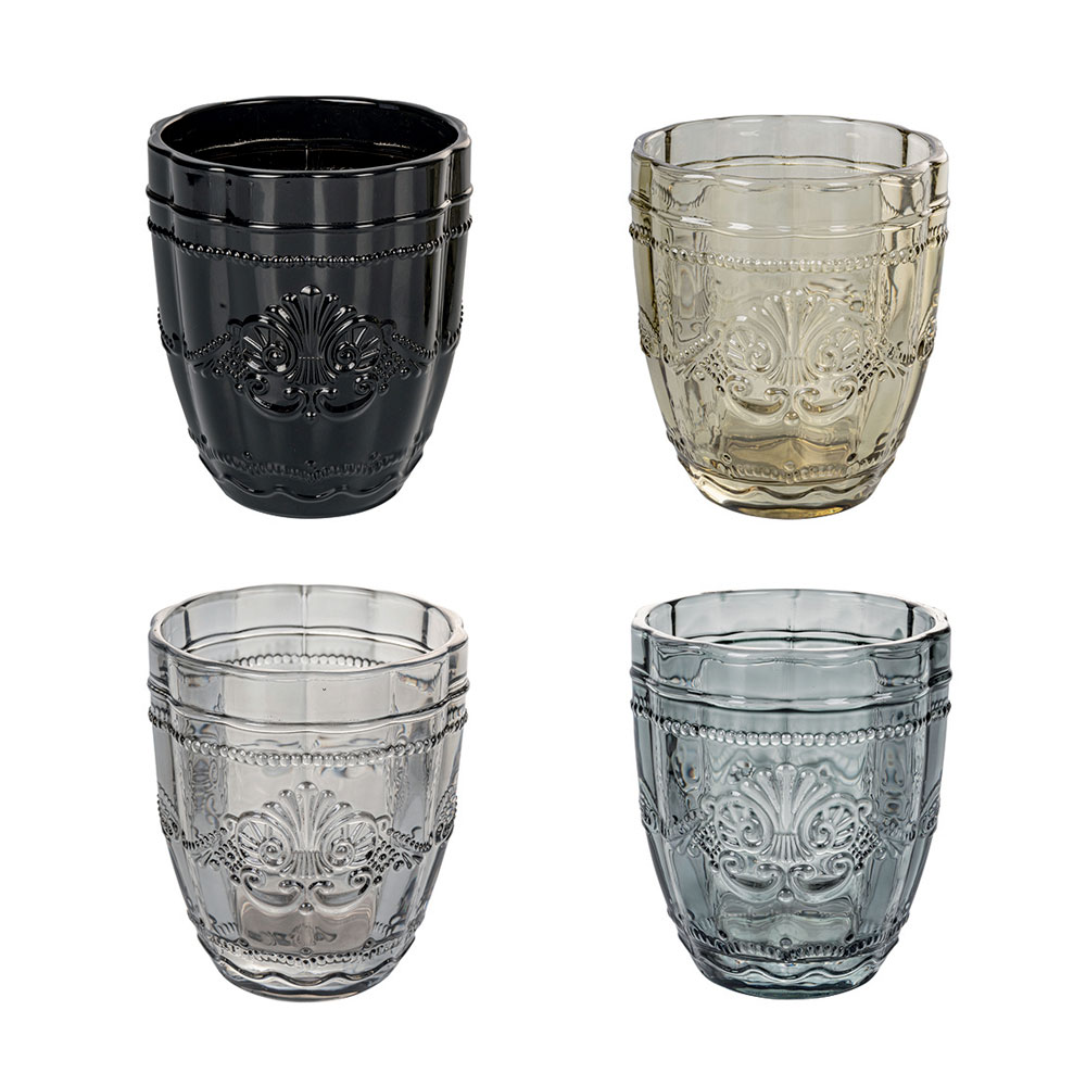 Denna uppsättning med 12 glas är en triumf av ljus och färg , med varma nyanser som påminner om naturens underverk och höstlandskap. Varje glas är ett litet konstverk som för med sig färgens värme. Graverade med mönster som frammanar blommiga ornament från svunna epoker, ger dessa glasögon en touch av klassisk elegans till alla bord, och hyllar designtraditionen .