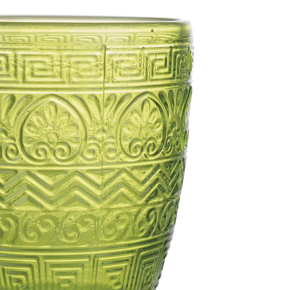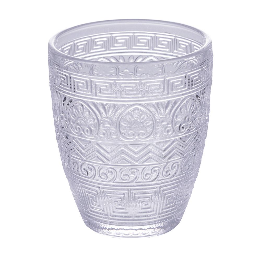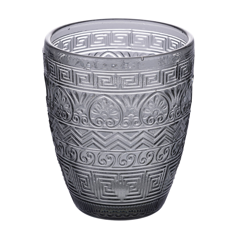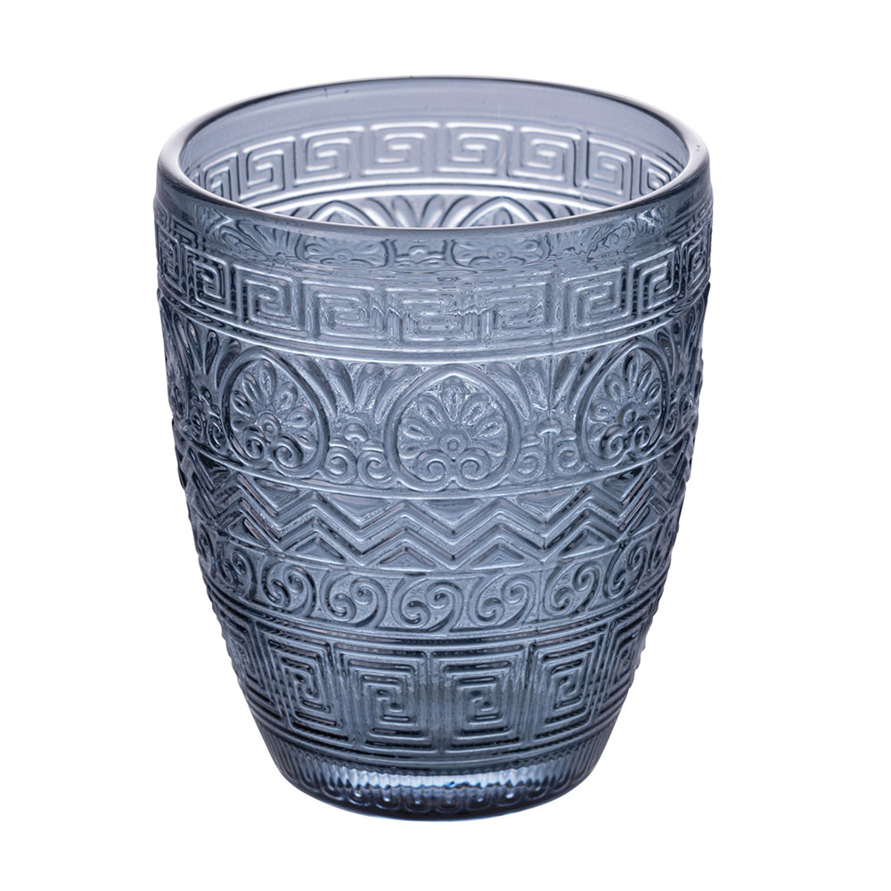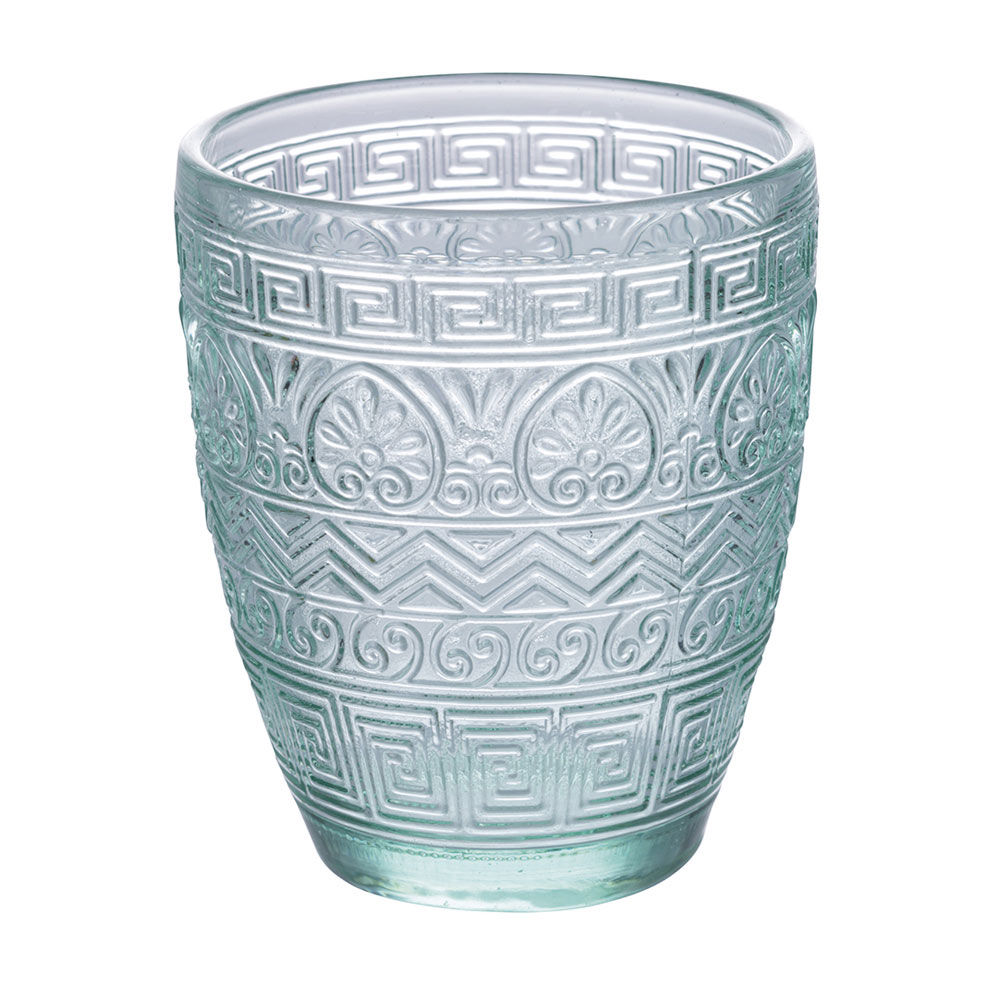 Denna uppsättning med 12 glas är en sann ode till hantverk och färg. Graverade med ett antikt grekiskt motiv erbjuder de ett dyk in i historien med en modern twist. Färgutbudet, från den nedgående solens bärnsten till det gröna i den frodiga naturen , som passerar genom stenens sofistikerade grå och havets djupblå , inbjuder dig till en sensorisk resa genom Medelhavspaletten . Varje glas är designat för att inte bara vara ett föremål för estetisk skönhet utan också för funktionellt nöje , perfekt för alla tillfällen, från vardag till fest.