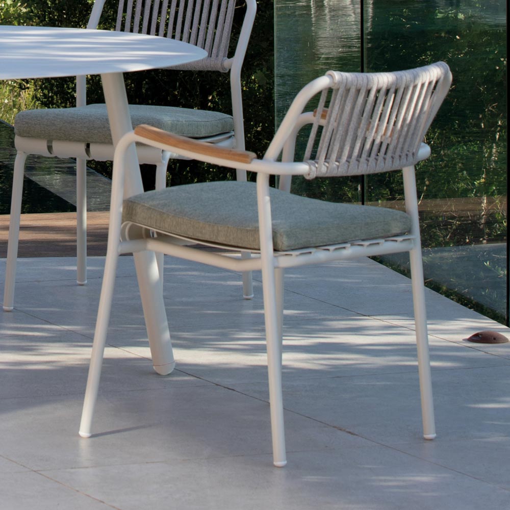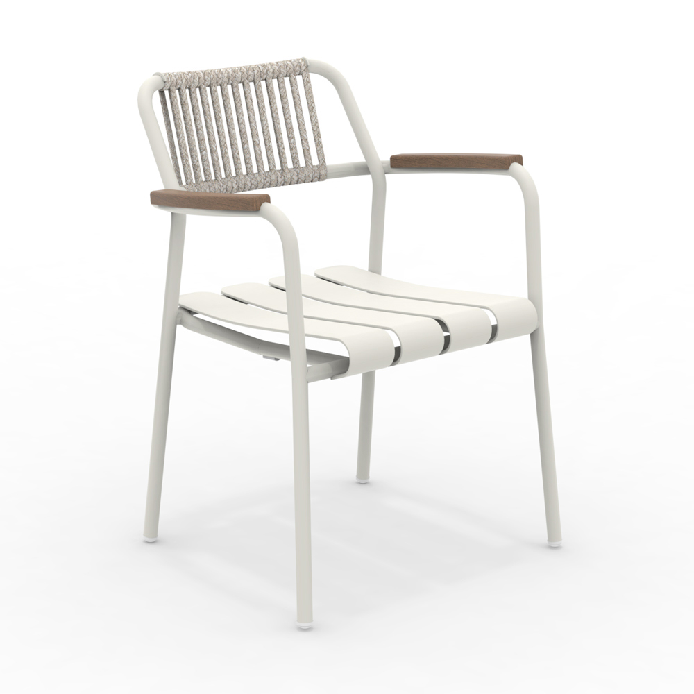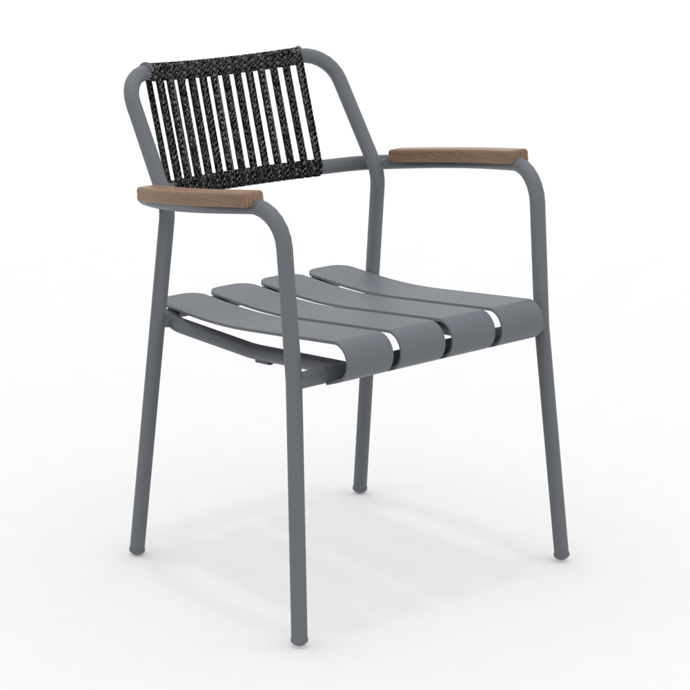Den lätta men robusta strukturen är utformad för att erbjuda bästa möjliga komfort, med en ergonomisk sits och ett format ryggstöd i rep , vilket säkerställer ett bekvämt och avkopplande stöd. Aluminiumlamellerna ger ett dynamiskt och modernt utseende, medan finishen tillför en touch av elegans och förfining.