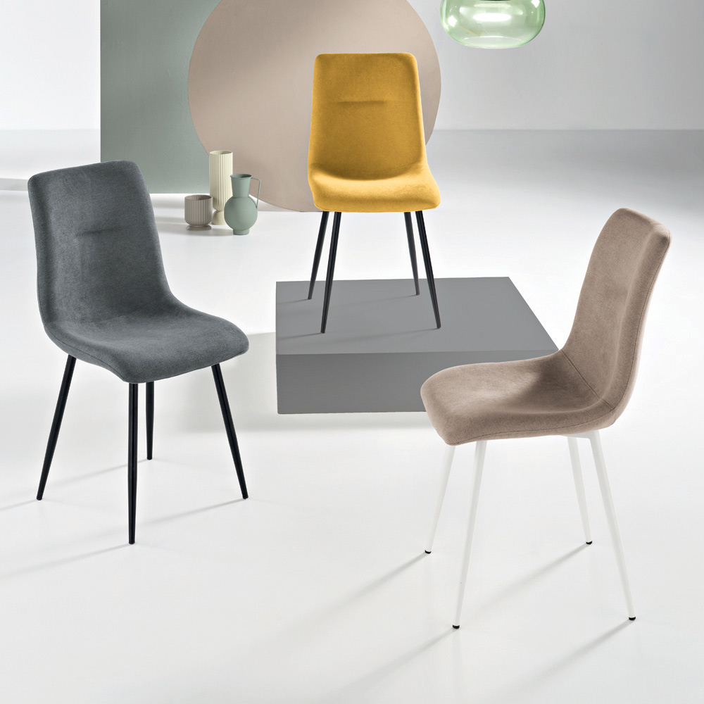 Elegant set med fyra moderna stolar designade för att elegant inreda din matsal , kök eller vardagsrum . Den tygklädda sitsen med mjuk stoppning garanterar komfort och en välkomnande känsla, medan den målade metallramen garanterar soliditet och hållbarhet.