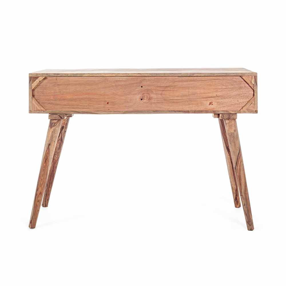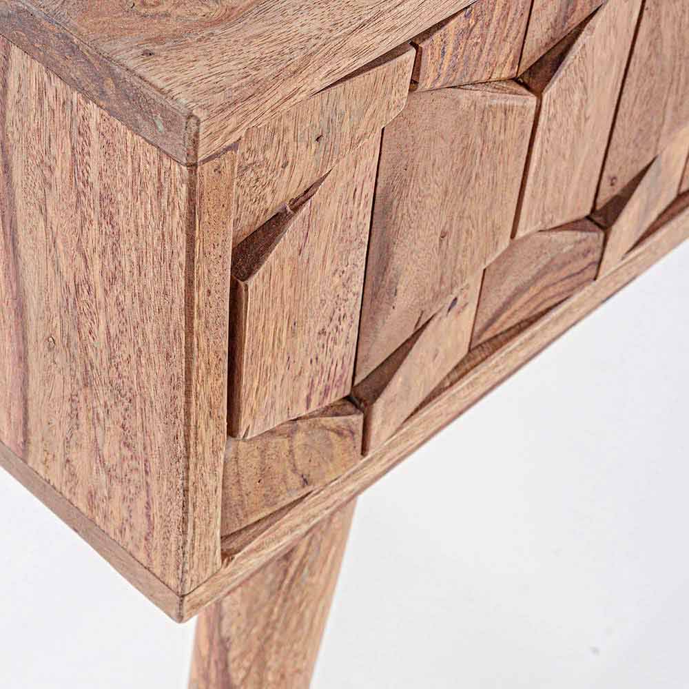 Denna designkonsol är gjord av fint sheesham-trä med en naturlig finish. Det är ett medelstort trä som är känt för sin naturliga lyster . för detta och för sin hållbarhet över tid är det idealiskt vid tillverkning av möbler. Designad med två lådor från baksidan och botten i plywood med en naturlig finish, medan fronten är dekorerad. De eleganta stålknopparna kompletterar scenen.