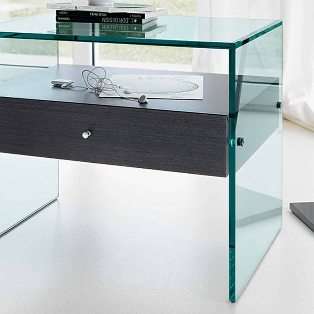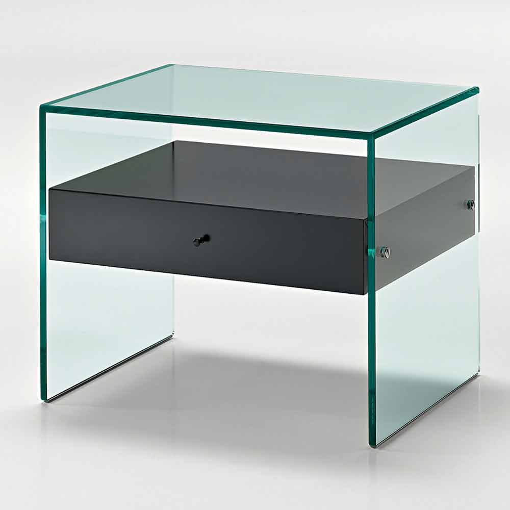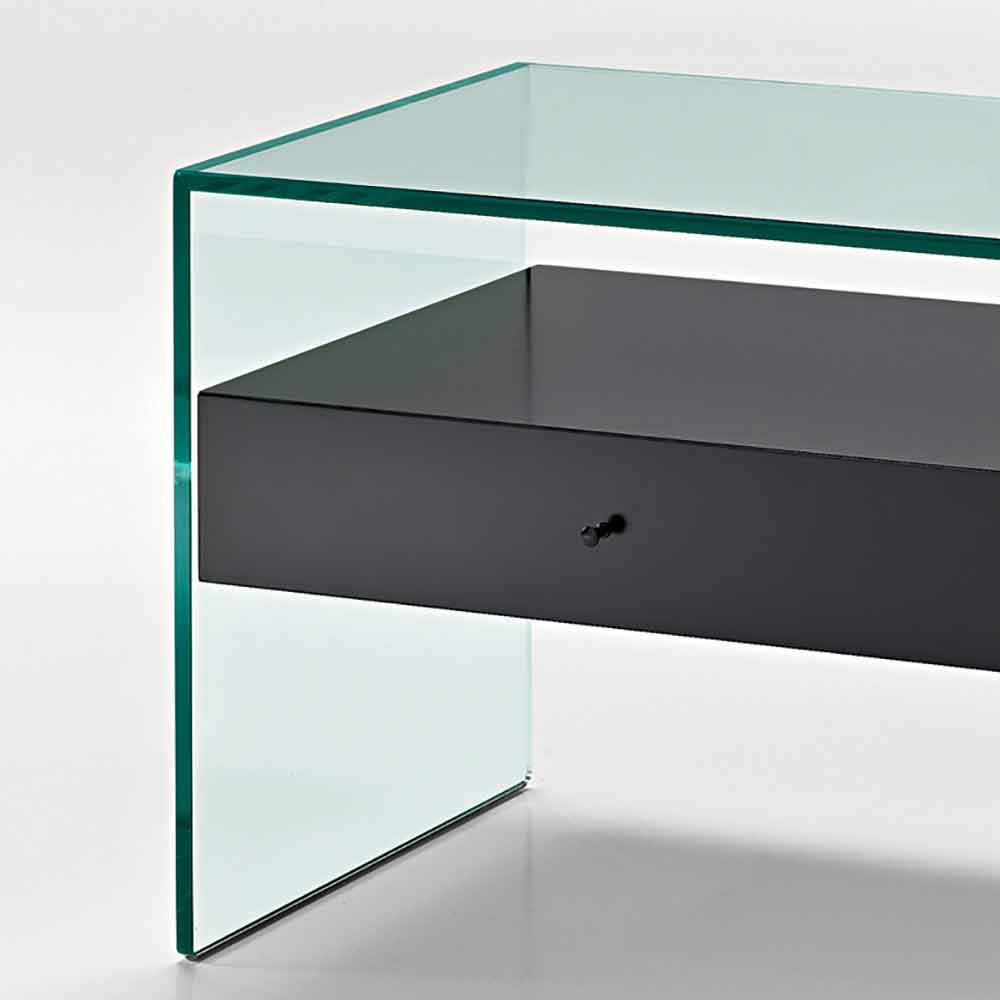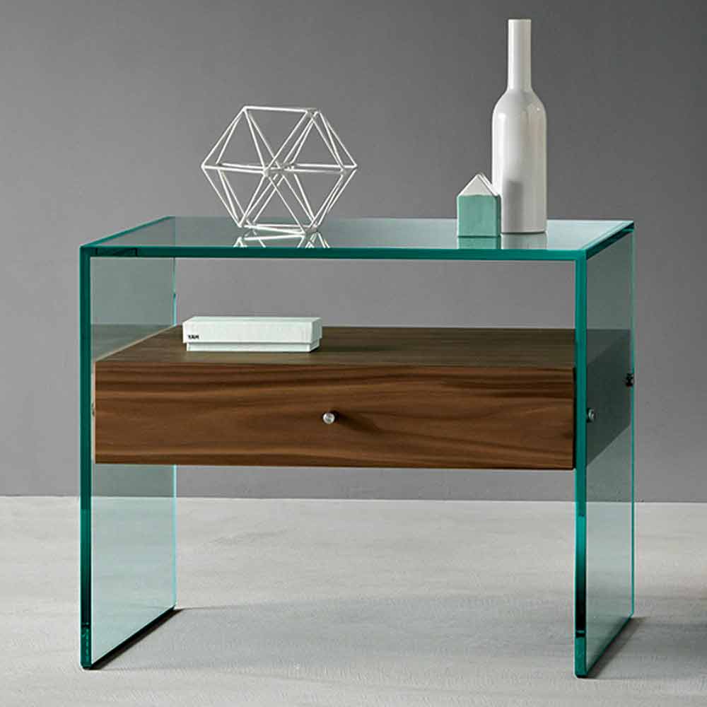 Sidobord för modern design i extraclear glas med trälåda, realiserad i Italien för hand.