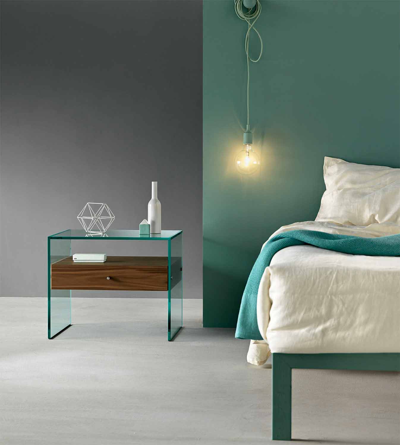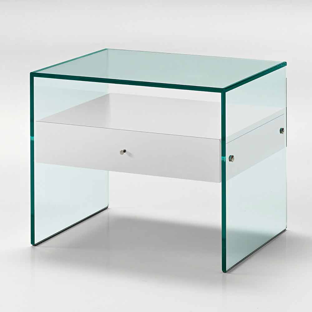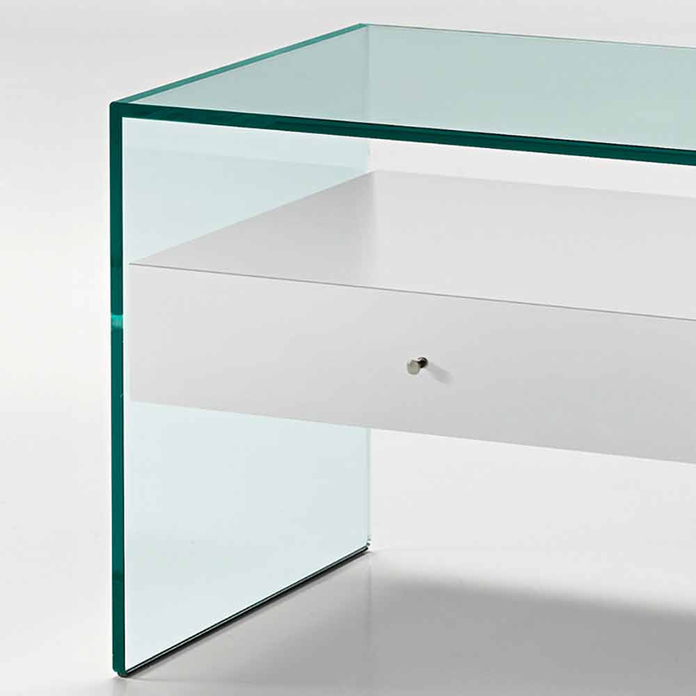 Sidobord för modern design i extraclear glas med trälåda, realiserad i Italien för hand.