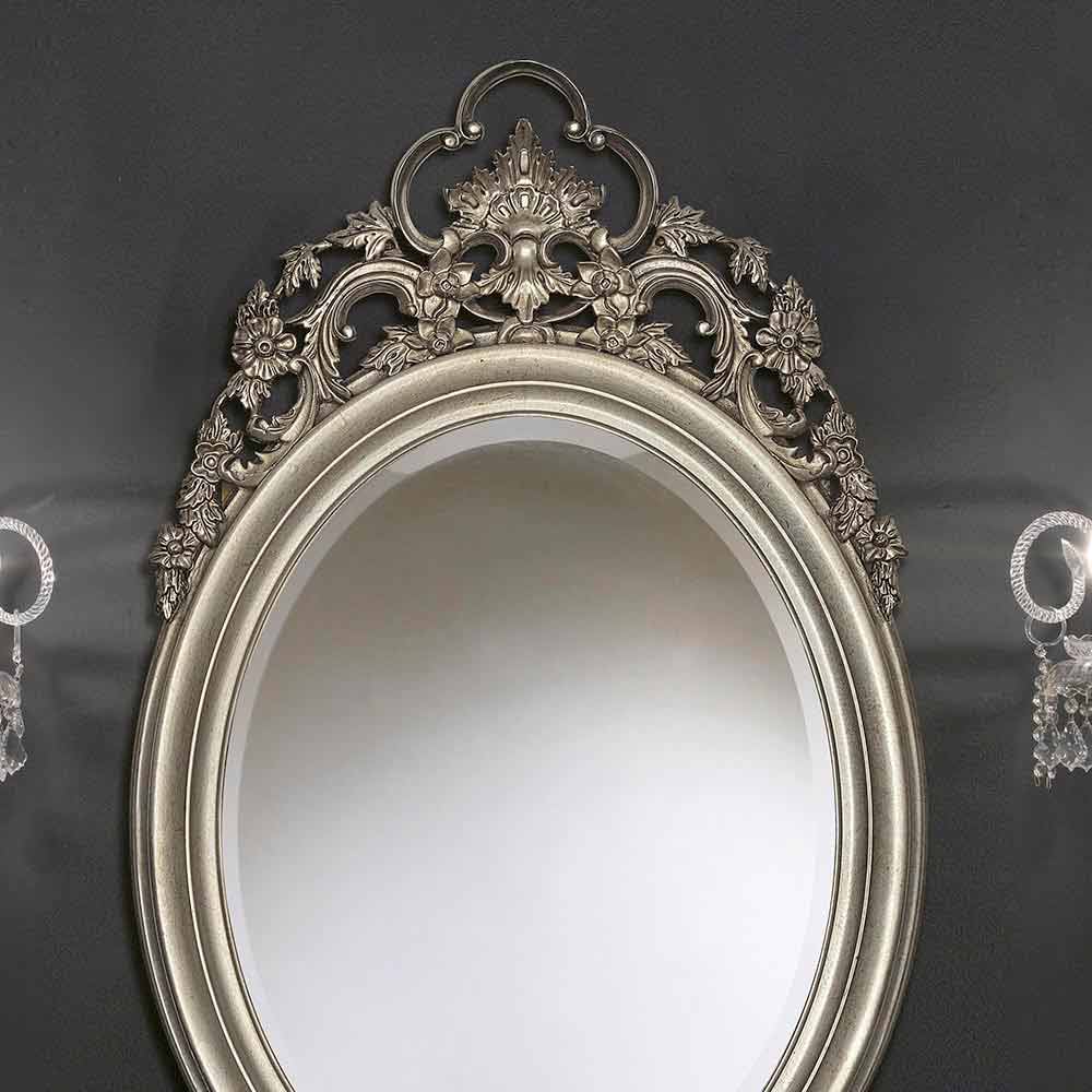 Dess kungliga design är toppad med en intrikat prydnad som kröner spegeln, vilket ger en punkt av visuellt intresse och en känsla av höjd och storhet till väggen som den hänger på. Den ovala formen på den reflekterande ytan erbjuder en mjuk och välkomnande vision, perfekt för utrymmen där du vill lägga till en känsla av intimitet och förfining.