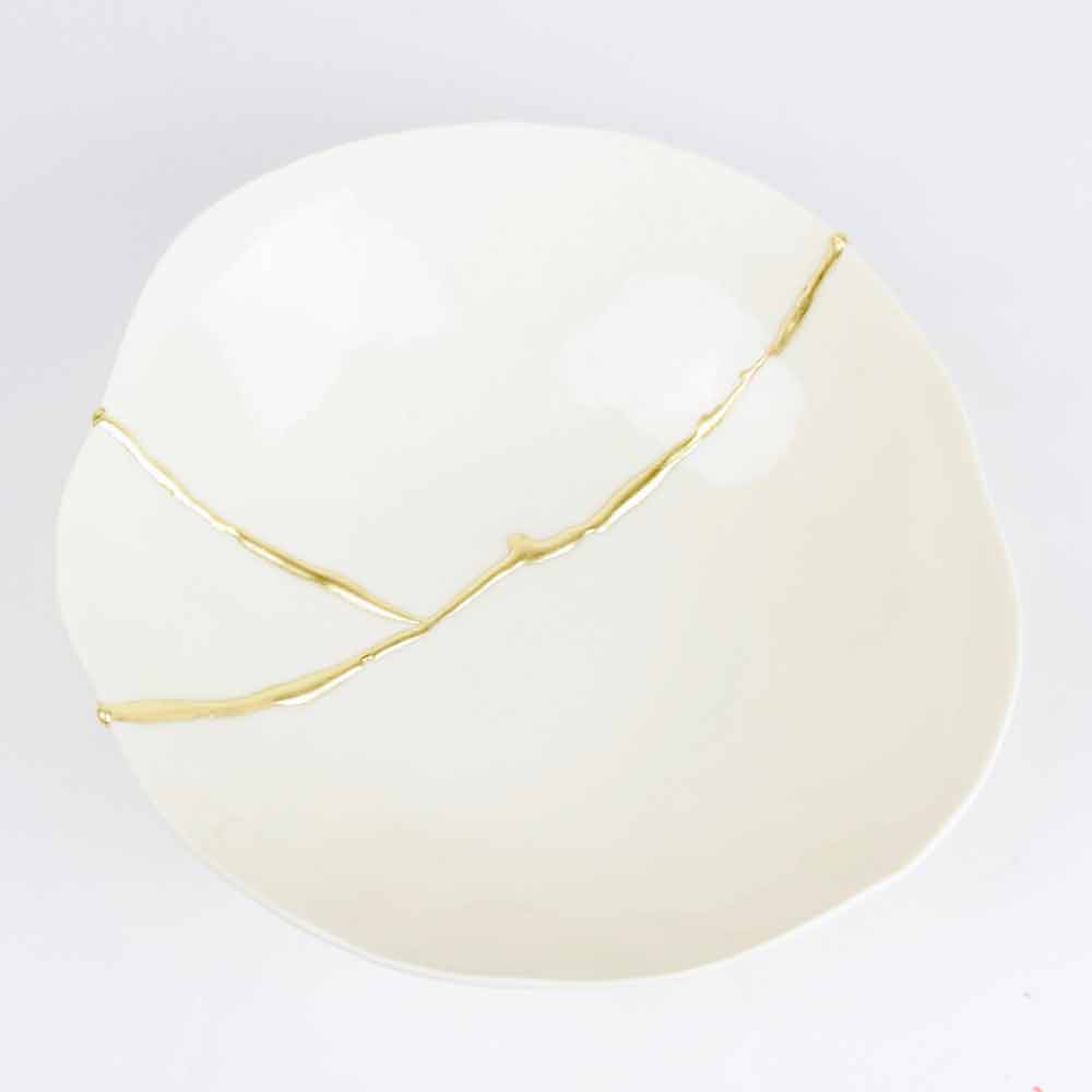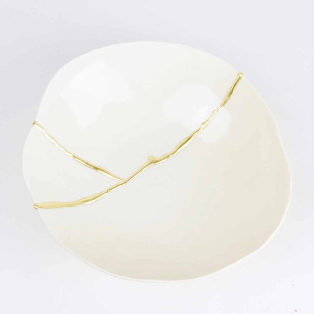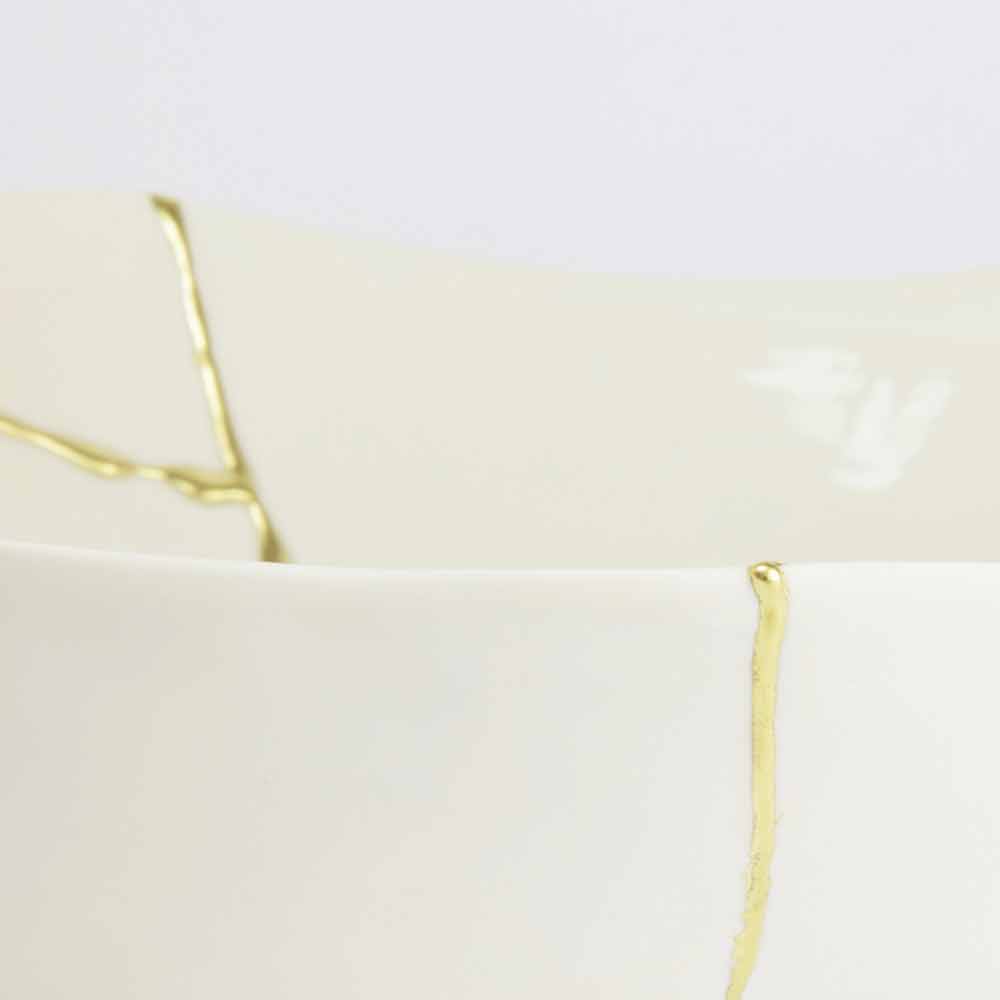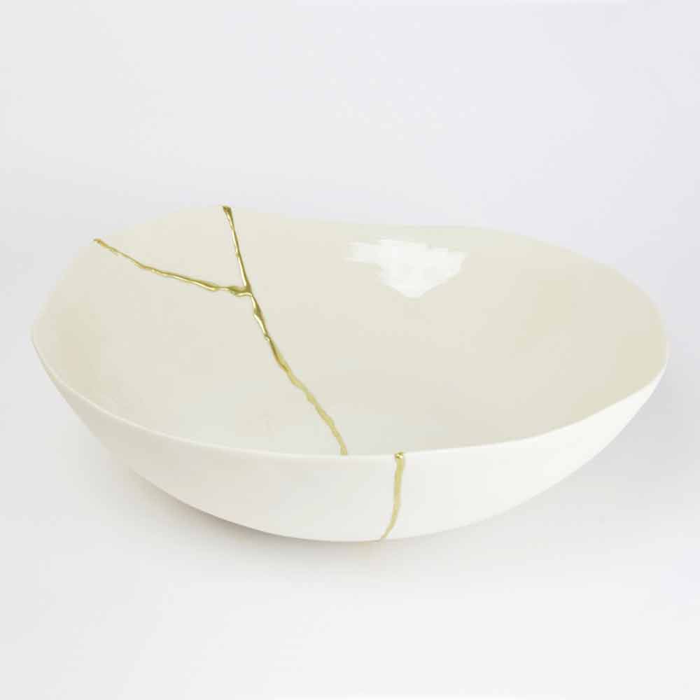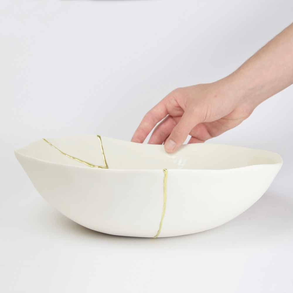 Dessa skålar är gjorda av det finaste vita porslinet och speglar den japanska filosofin om kintsugi som består i att förbättra, inte dölja, livets sår eftersom de är en del av vår historia och bidrar till att göra oss till de människor vi är idag. Således repareras varje föremål som skadas av matlagning i ugnen med 22-karats guldblad som lim, vilket skapar ett underbart värdefullt ärr.