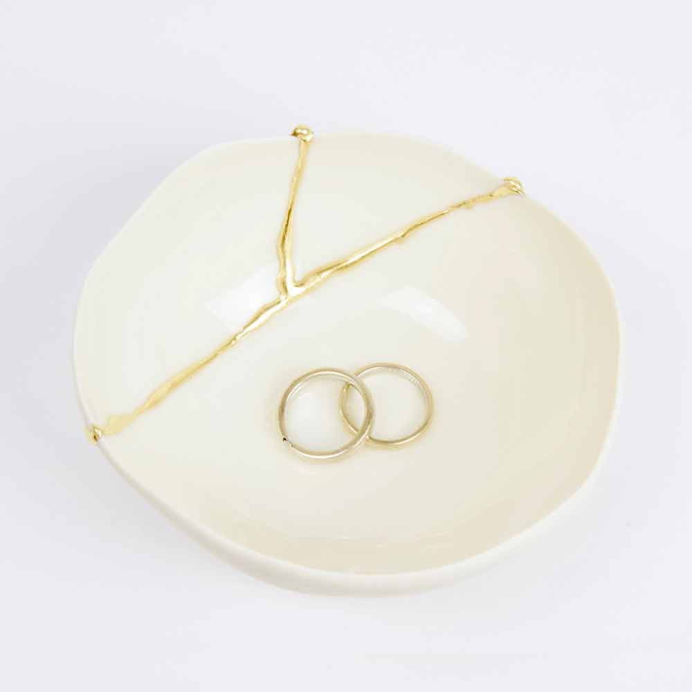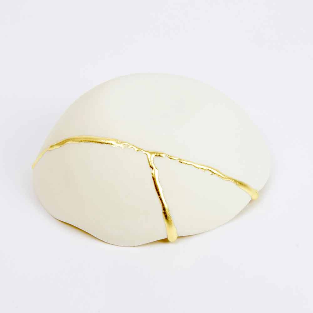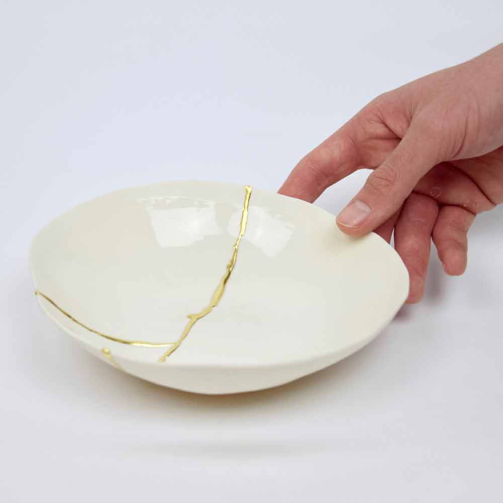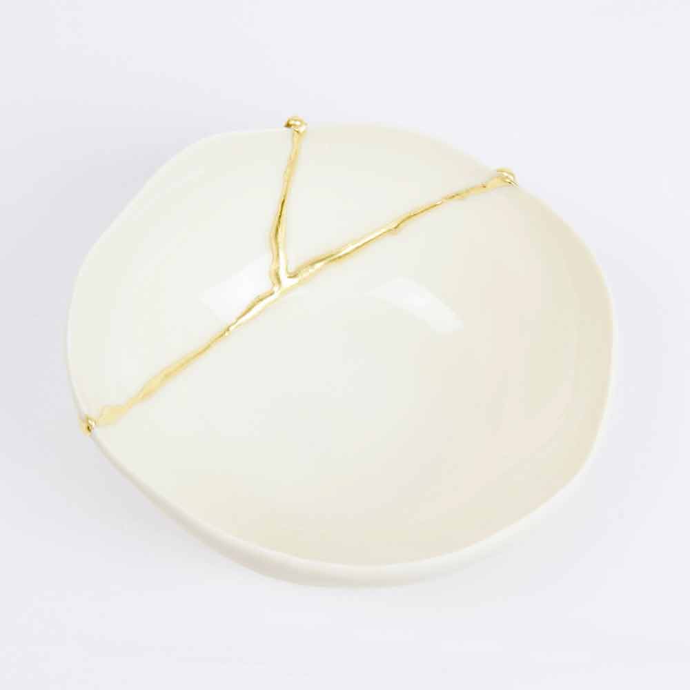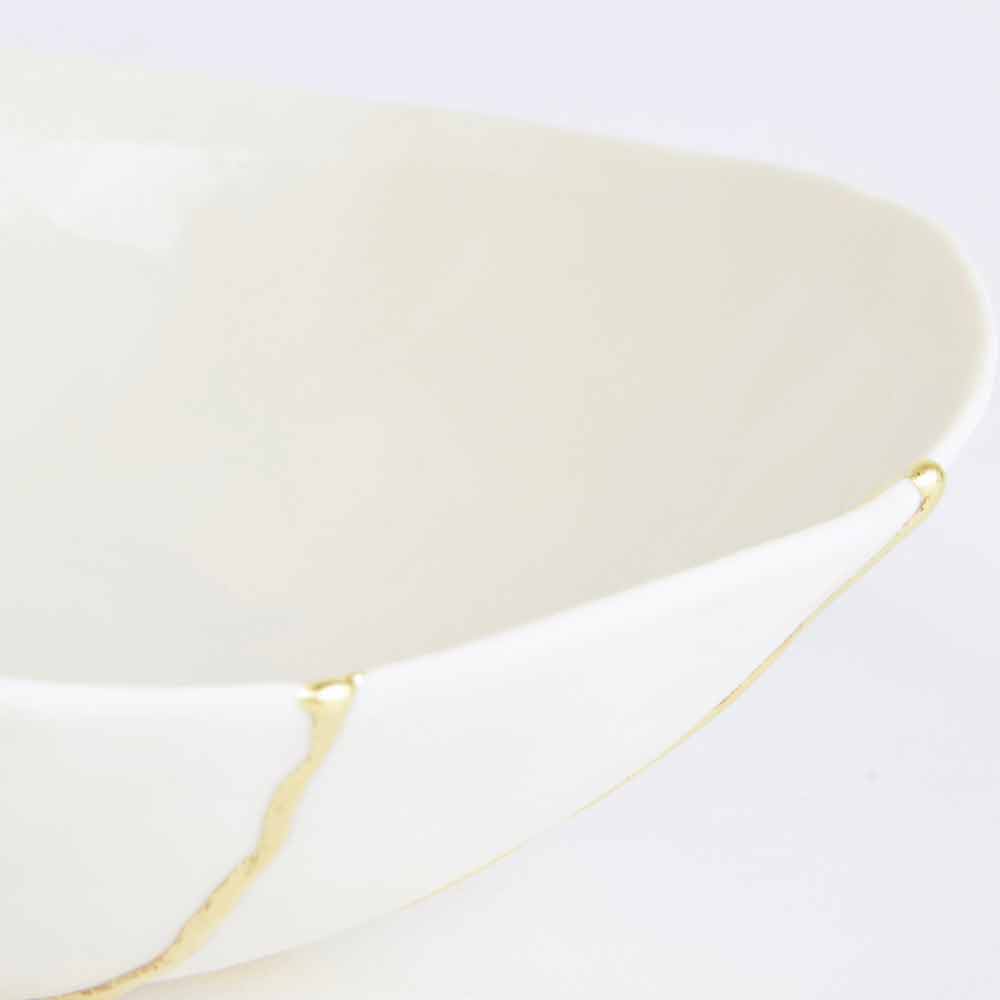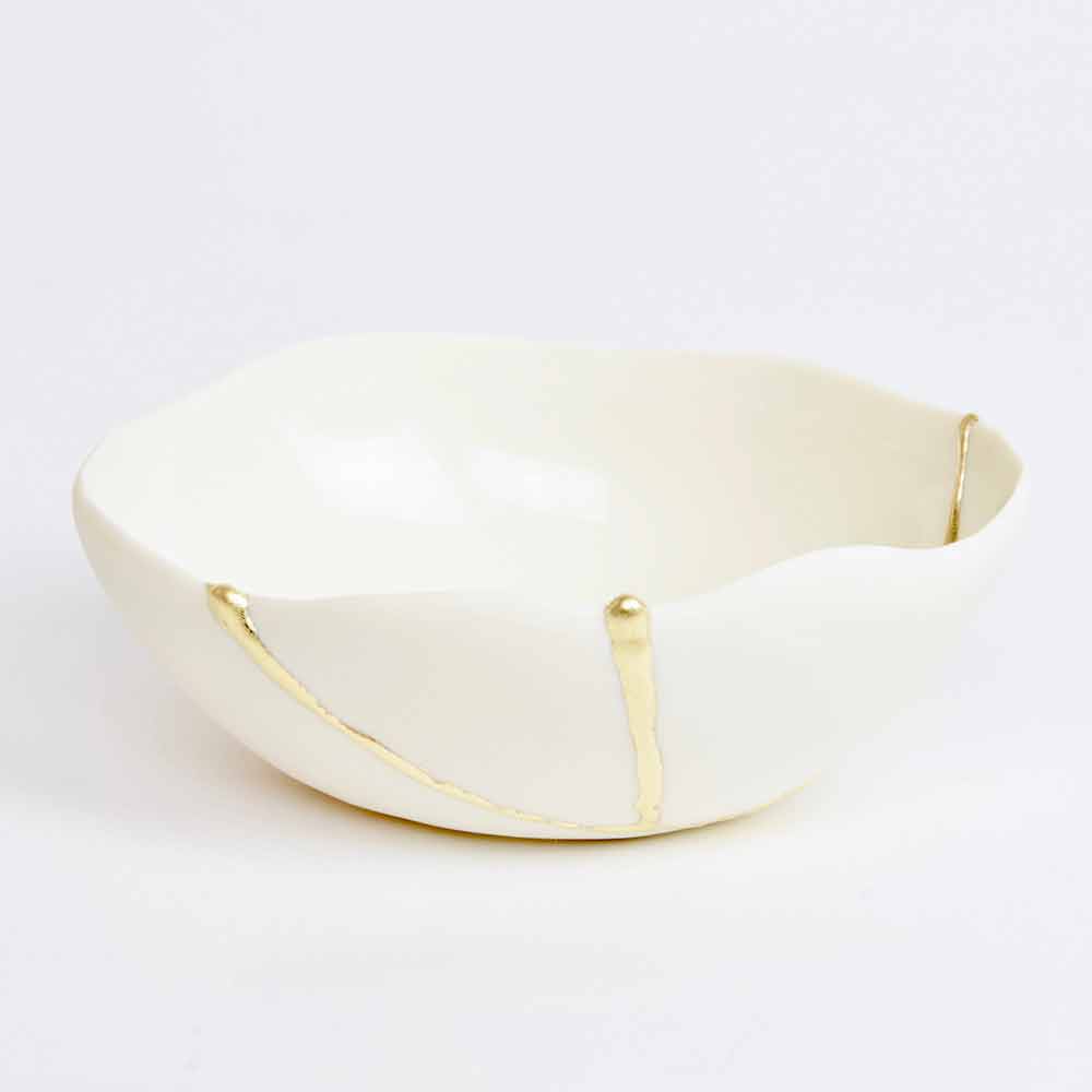 Dessa skålar är gjorda av det finaste vita porslinet och speglar den japanska filosofin om kintsugi som består i att förbättra, inte dölja, livets sår eftersom de är en del av vår historia och bidrar till att göra oss till de människor vi är idag. Således repareras varje föremål som skadas av matlagning i ugnen med 22-karats guldblad som lim, vilket skapar ett underbart värdefullt ärr.