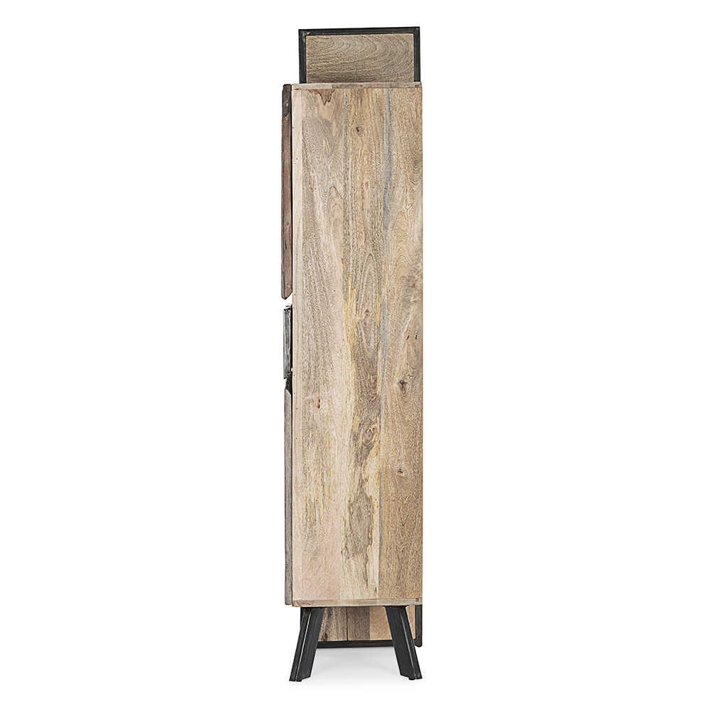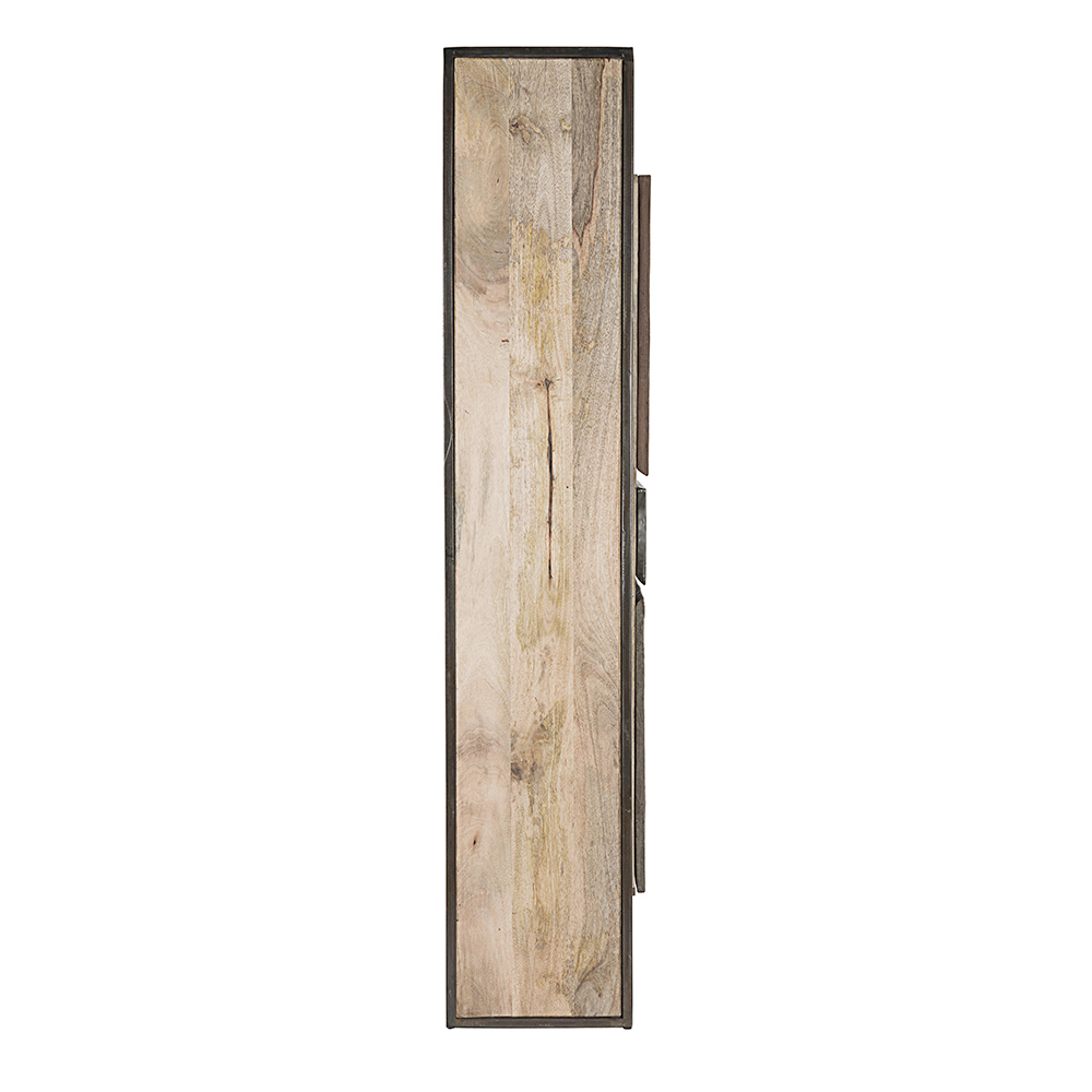 Denna designskänk för vardagsrummet har en struktur av mangoträ och stål med baksida i plywood.