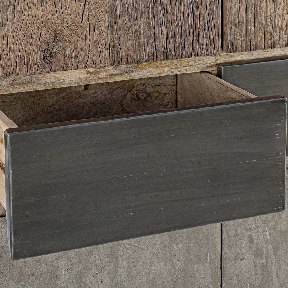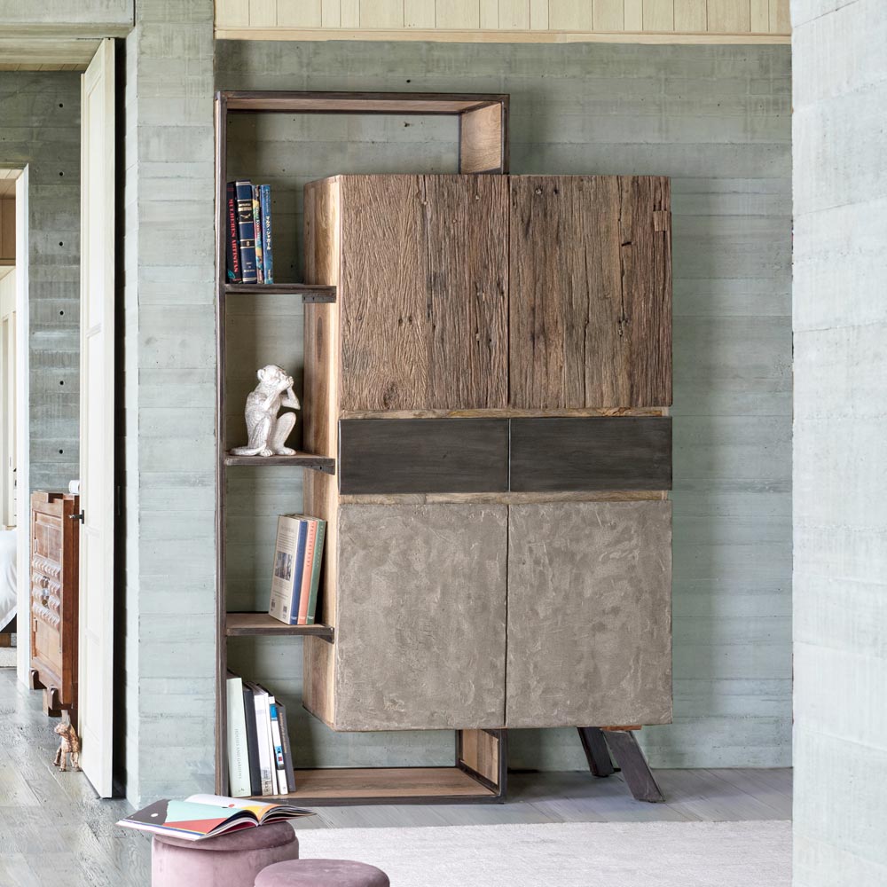 De fyra dörrarna och de två lådorna är gjorda av återvunnet trä , stålplåt och cementfiberfinish : möbelns egenhet består just i närvaron av träpinnar av olika arter och färger.