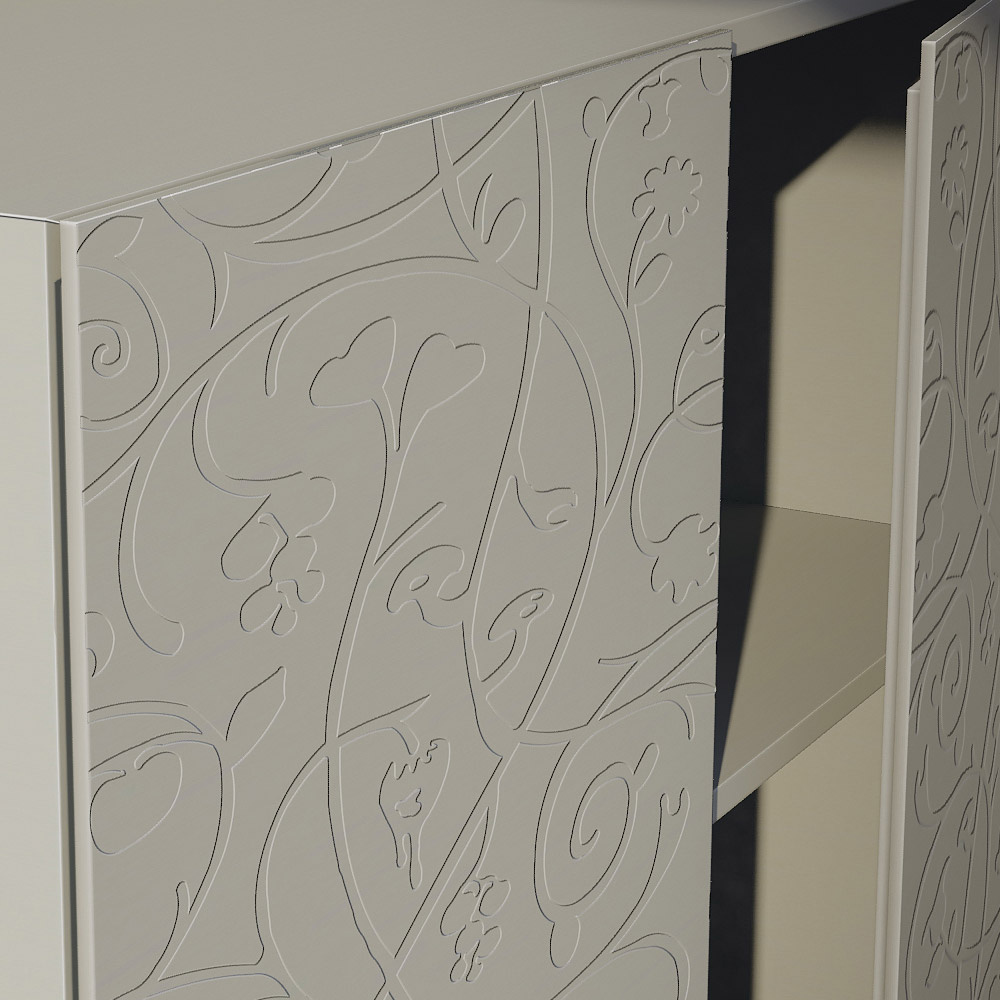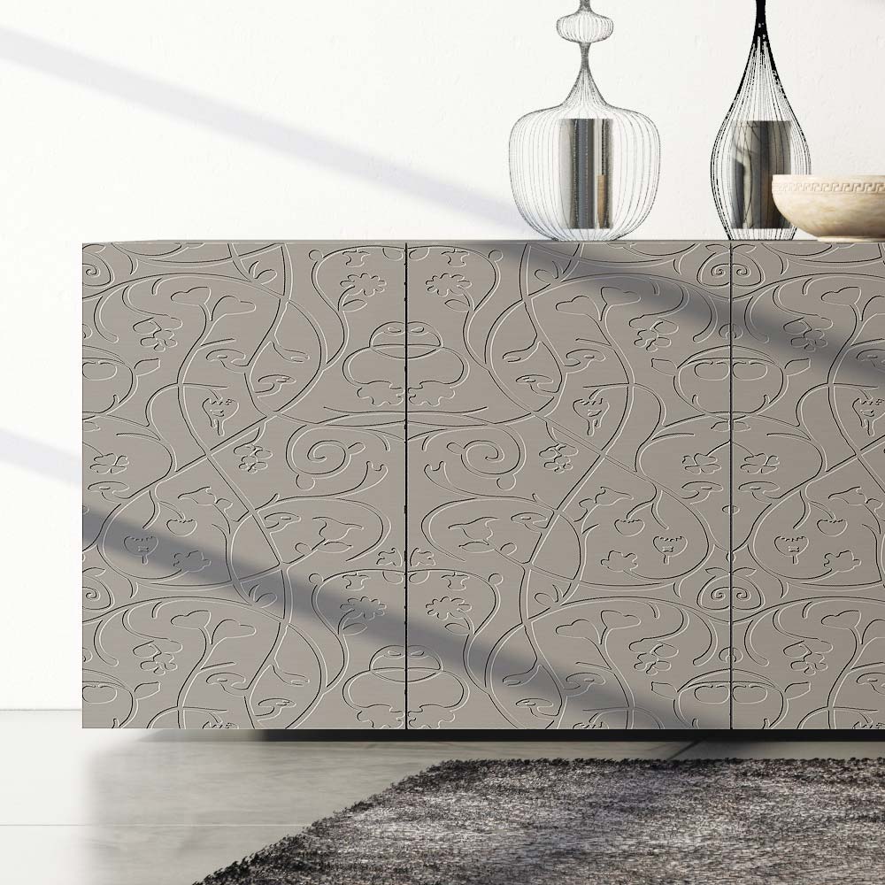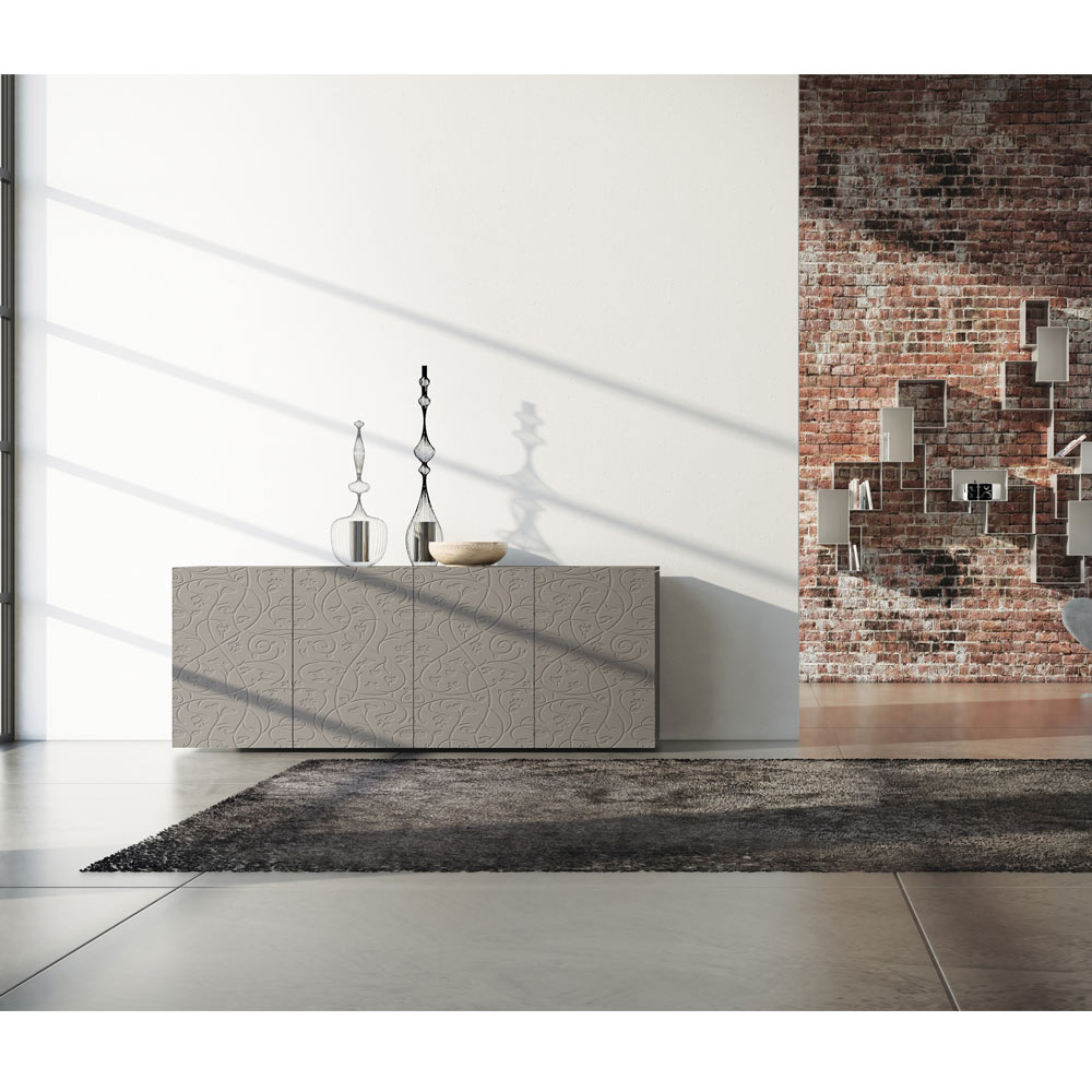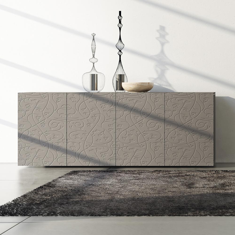 Vardagsrumsskänk med lermattlackad MDF -struktur bestående av 4 gångjärnsdörrar som garanterar stor funktionalitet och funktionalitet . Denna produkt är full av smak och design tack vare dess eleganta och raffinerade finish och basreliefdekorationen på dörrarna som gör dem unika i sitt slag. De olika materialen som används för konstruktionen erbjuder hög kvalitet och motstånd över tid, vilket ger produkten den unika och oförglömliga touchen.