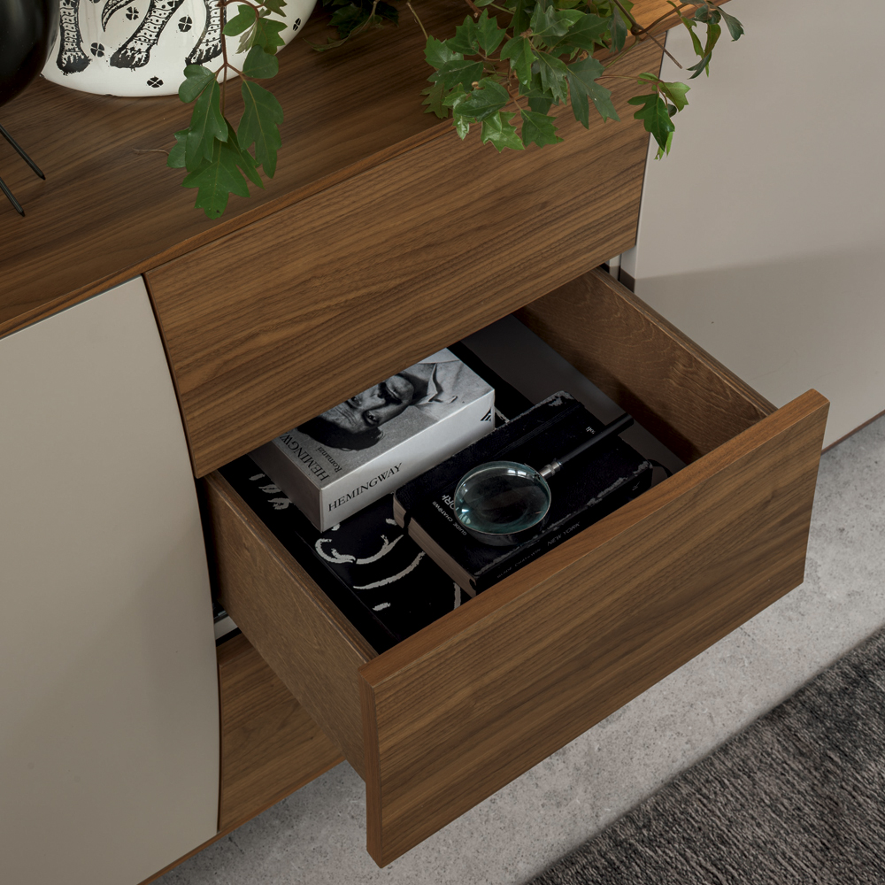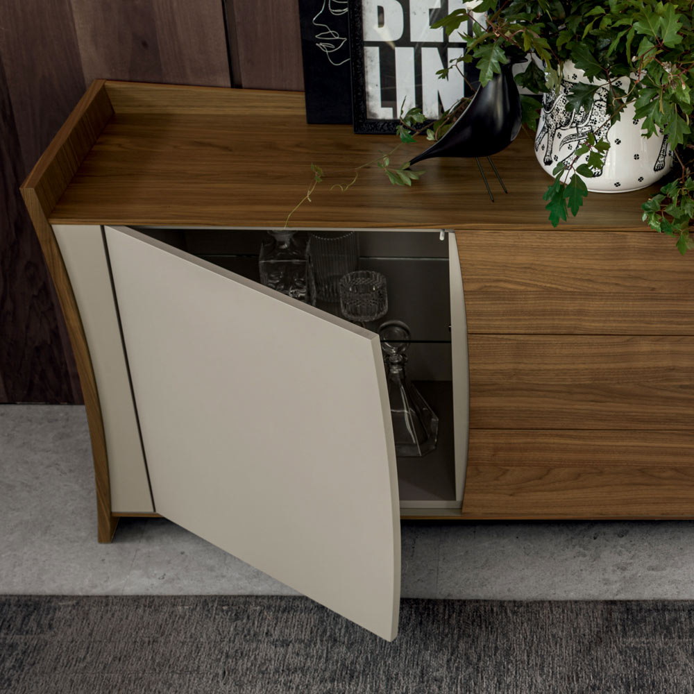 Skänk i fanerat och lackat trä med dörrar och lådor, svängd design tillverkad i Italien.