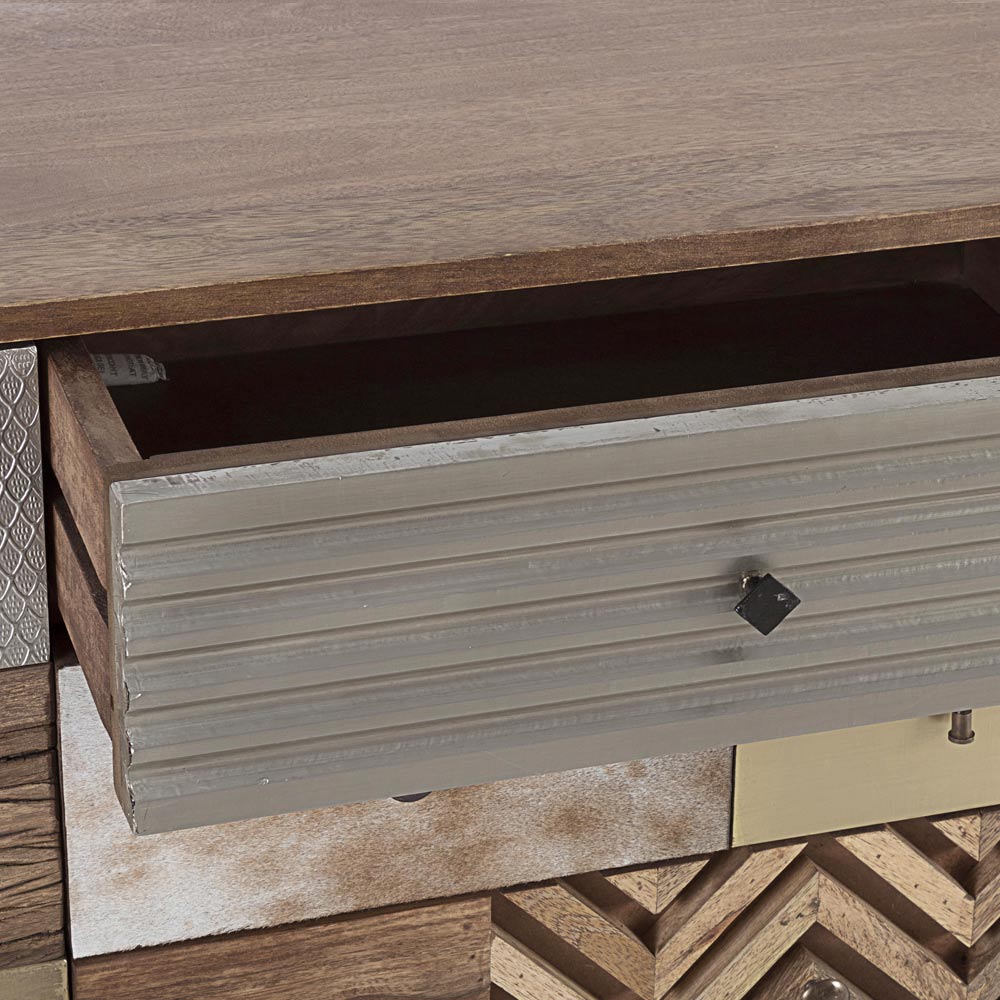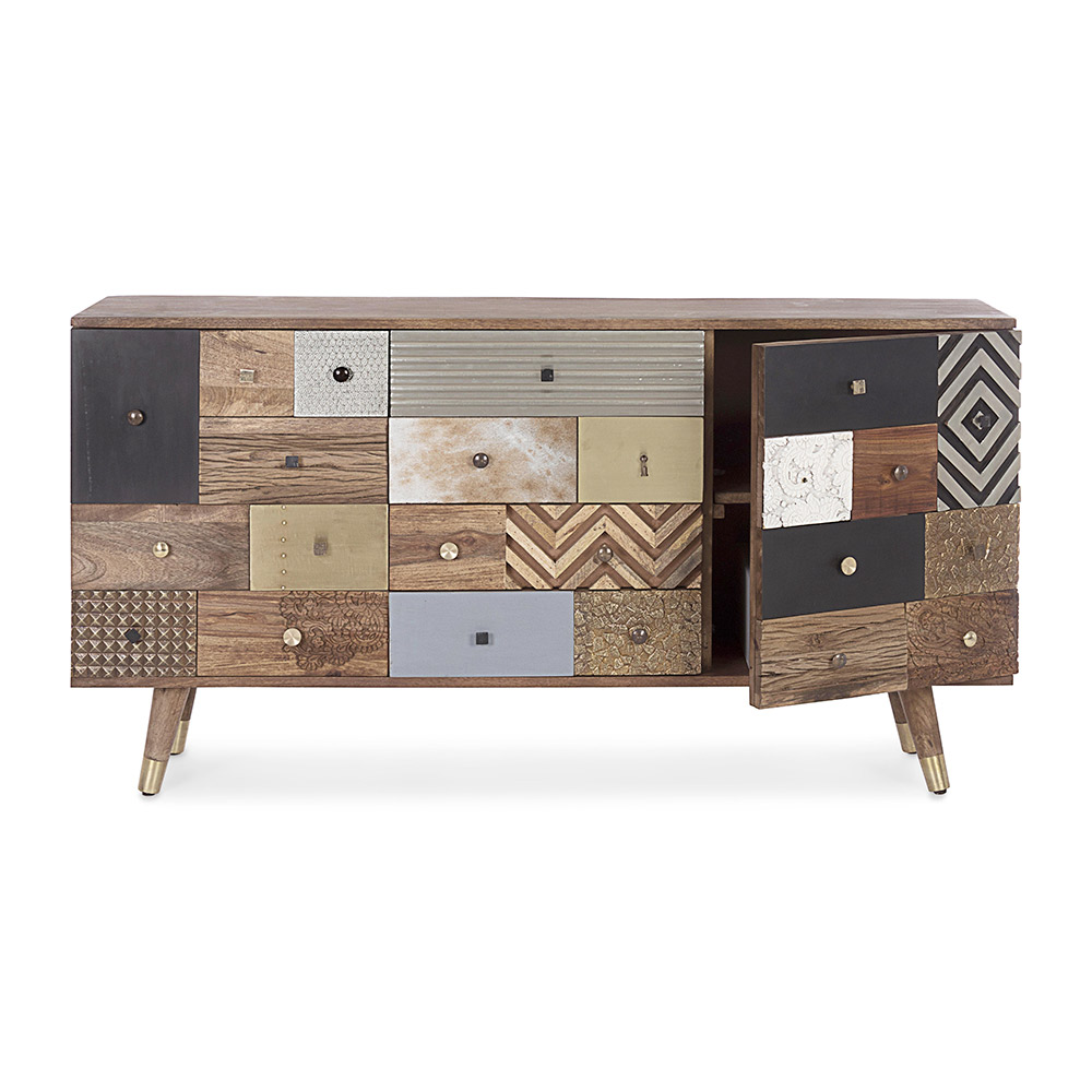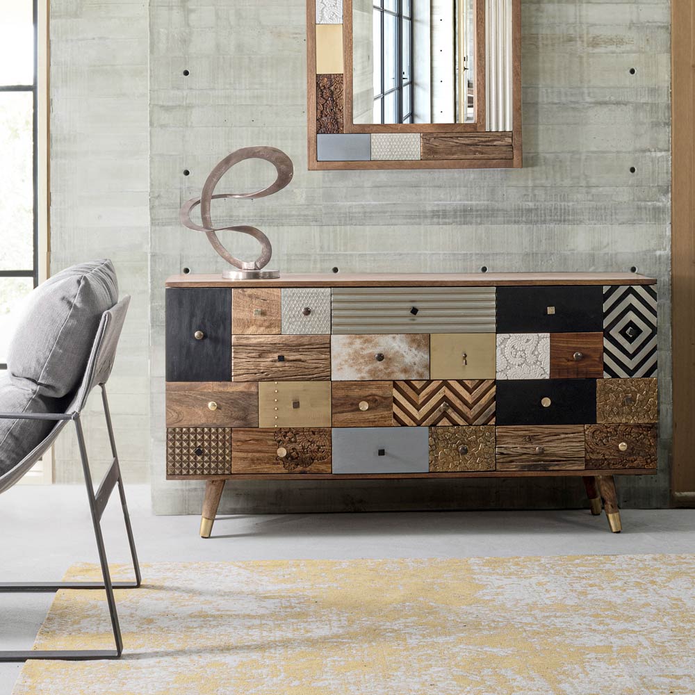 Skänk i mangoträ med 2 luckor och 4 lådor i etnisk stil.