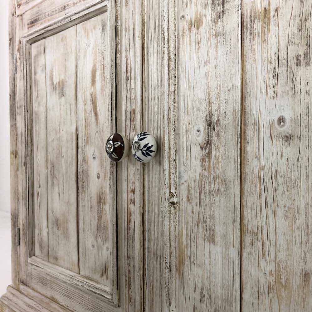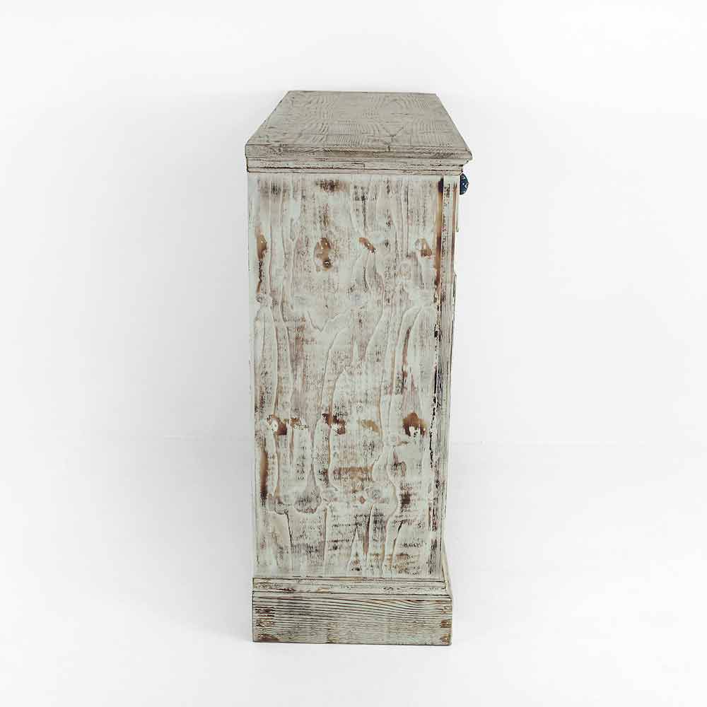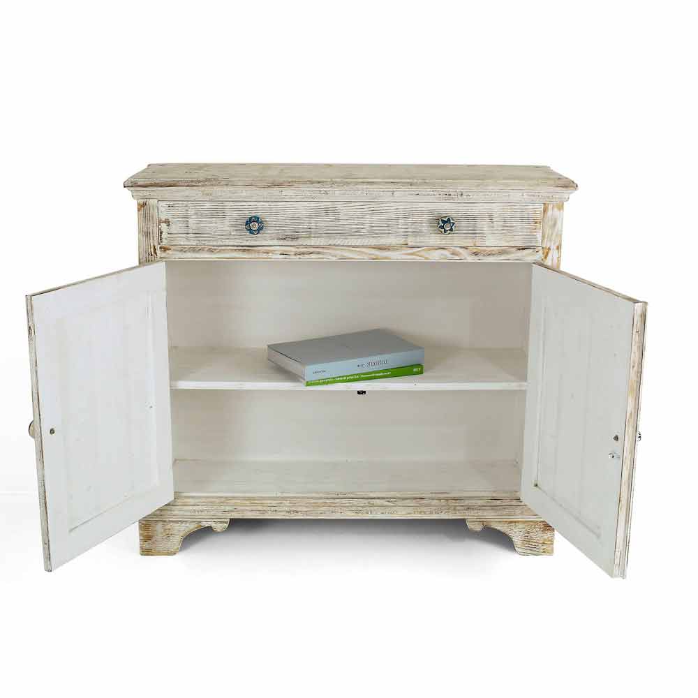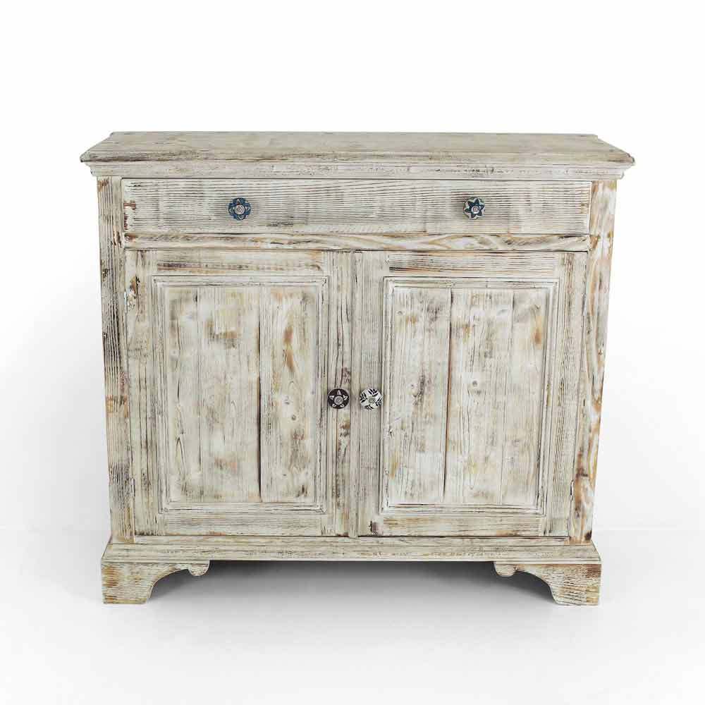 Skänk i massivt granved helt handgjord i Italien och kännetecknas av den underbara flammbrända flayed finishen som framhäver det specifika träkornet som gör produkten unik. Sidobänken är sedan avslutad med en åldrad vit färg och kompletteras med den genomskinliga ytan som gör den vattenavvisande och fixerar färgerna för att göra dem oföränderliga över tiden. Dess struktur har två dörrar med invändig hylla och 1 låda med poppelplywoodbotten som kompletteras med speciella handmålade keramiska knoppar så att du kan ha perfekt organiserade utrymmen.