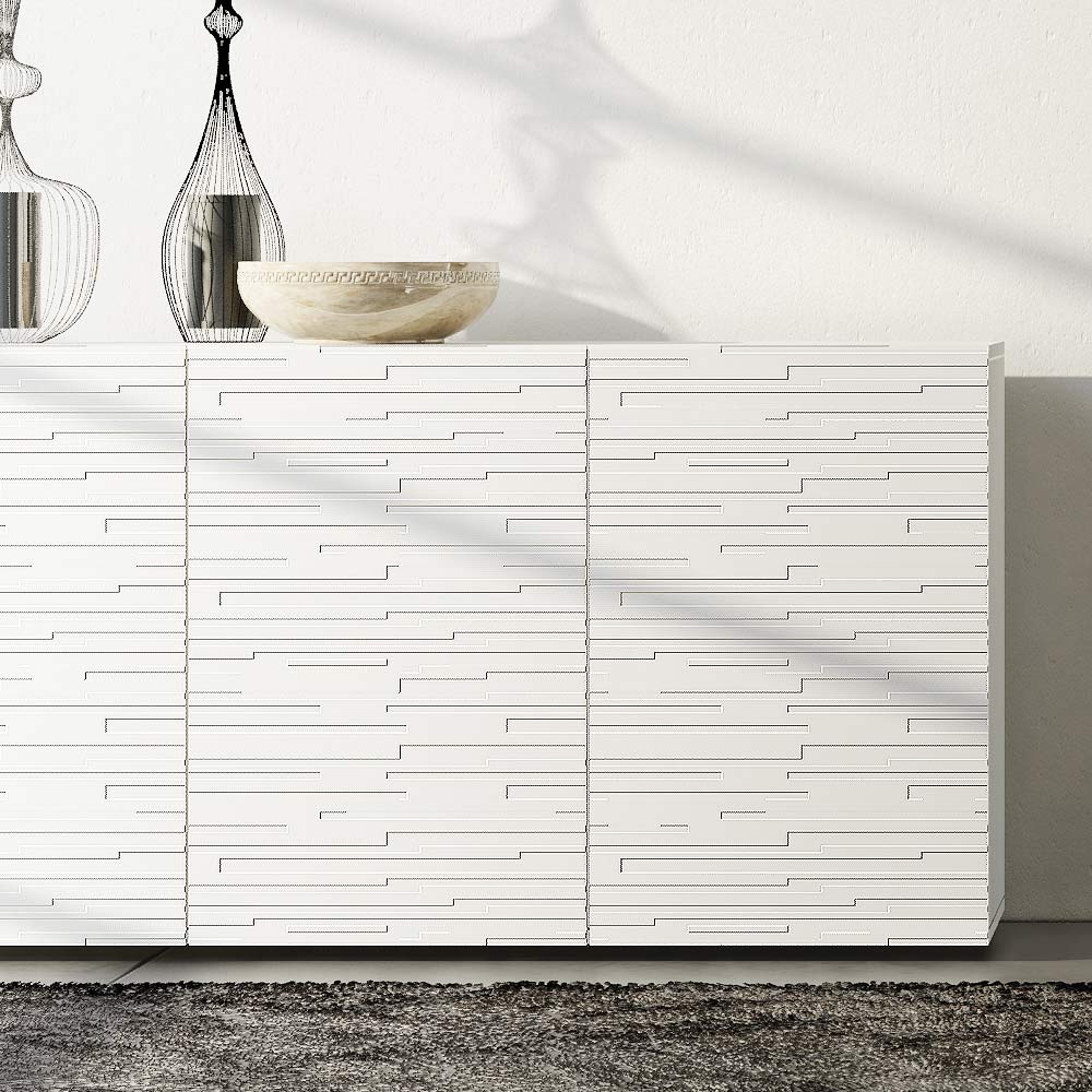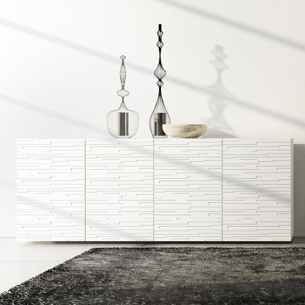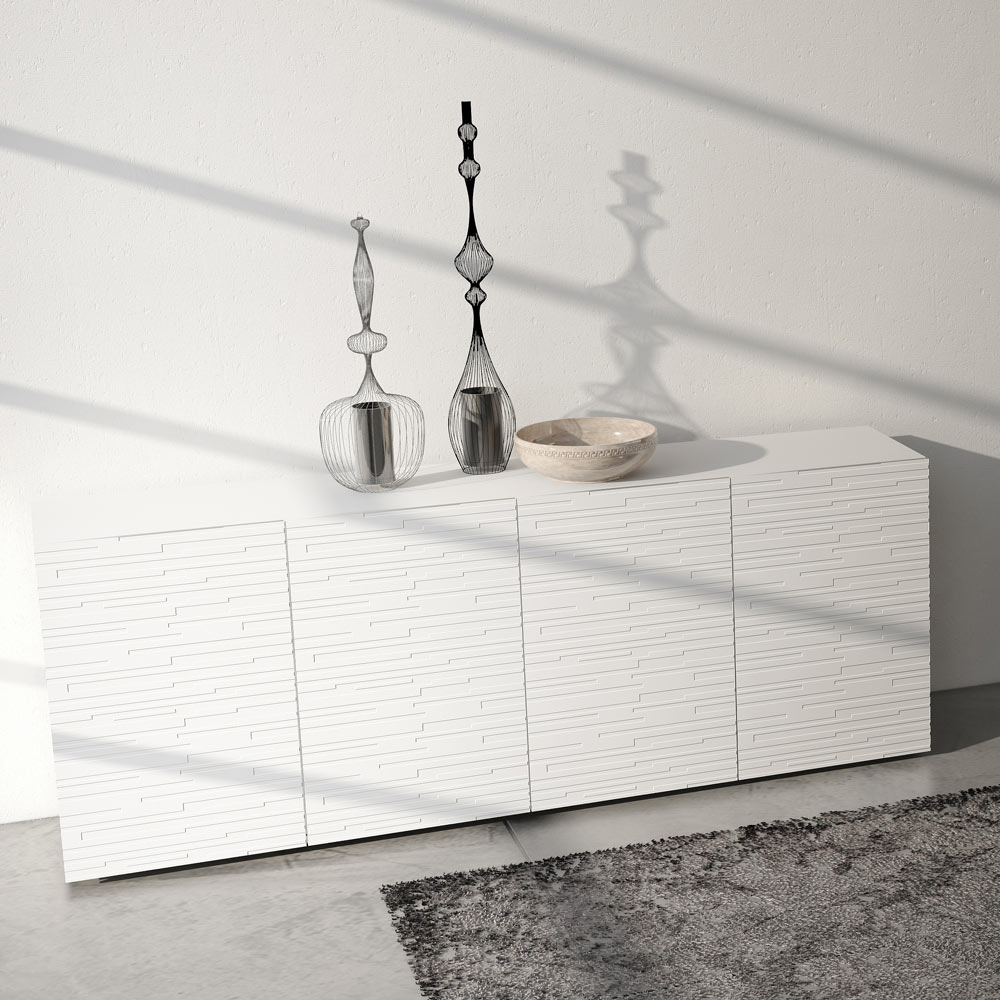 Vardagsrumsskänk med mattlackerad MDF- struktur och med öppningssystem med 4 st vit mattlackerade gångjärnsdörrar med basreliefdekor. Denna produkt kännetecknas av funktionalitet och design tack vare dess eleganta och raffinerade ytbehandlingar och de olika materialen som används för dess konstruktion som erbjuder hög kvalitet och motståndskraft över tiden , vilket ger produkten den unika och oförglömliga touchen.