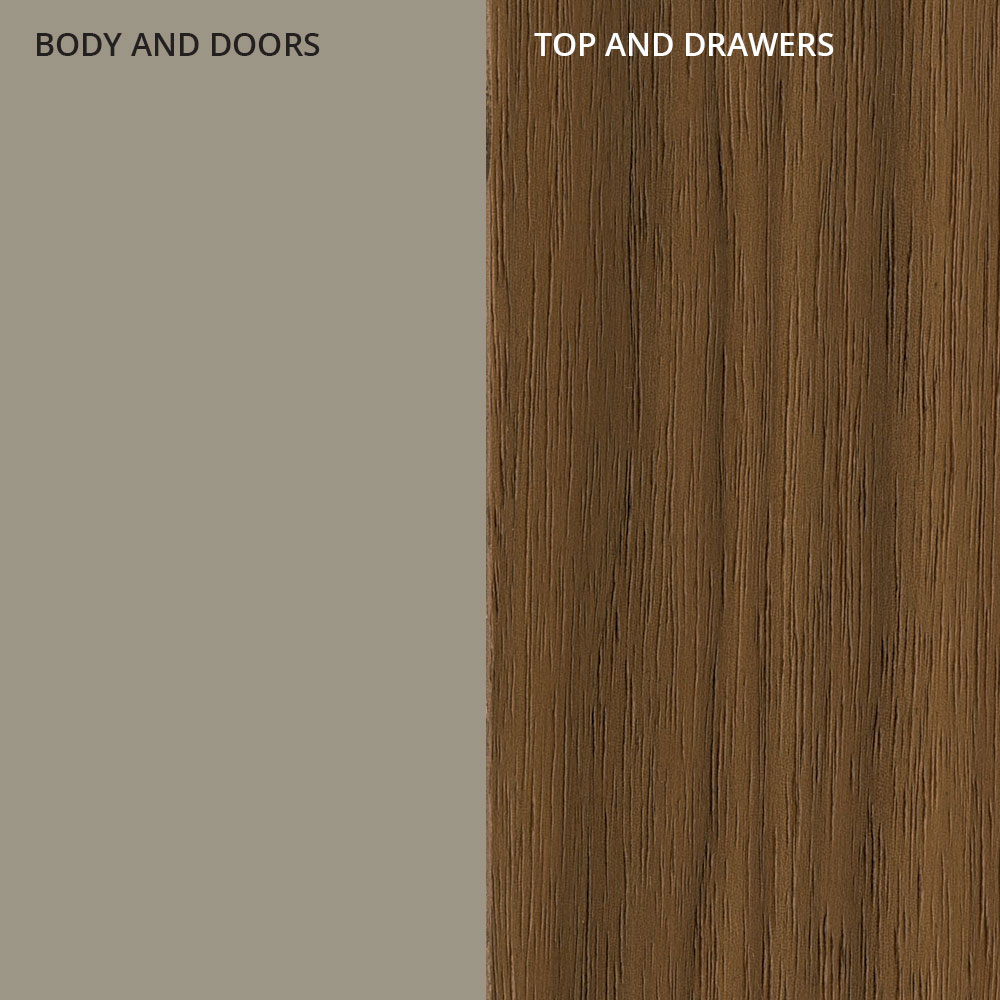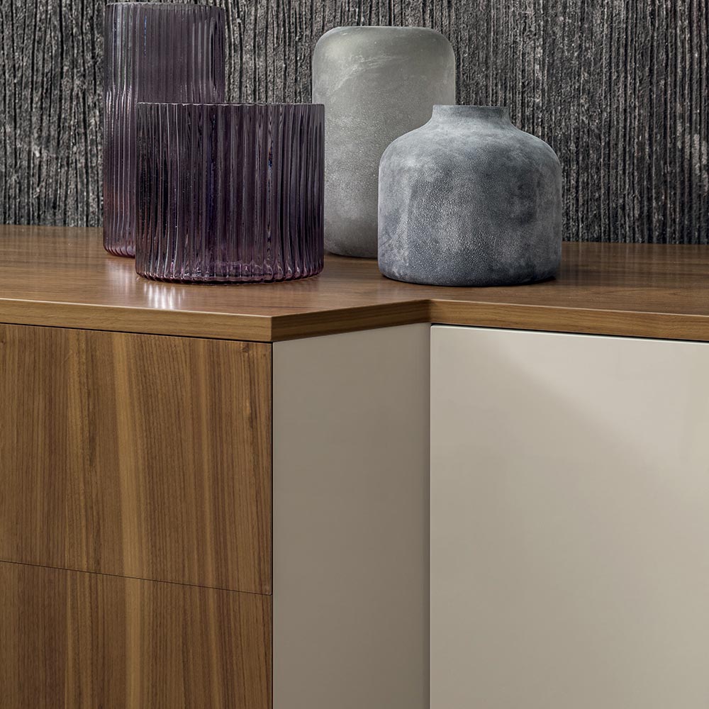Denna skänk för vardagsrummet har en struktur helt gjord av lackad MDF i sandfinish och topp samt 2 lådor i fanerat trä i Canaletto valnötsfinish.