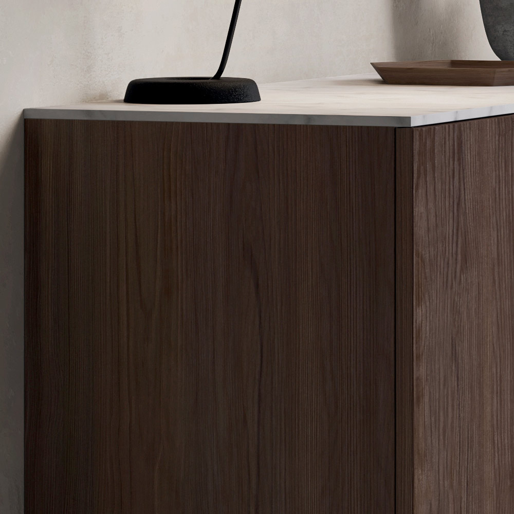 skänk för vardagsrummet har en struktur av terrakottaaska och en elegant topp i Carrara Venatino -marmor med en tjocklek av 12 mm.