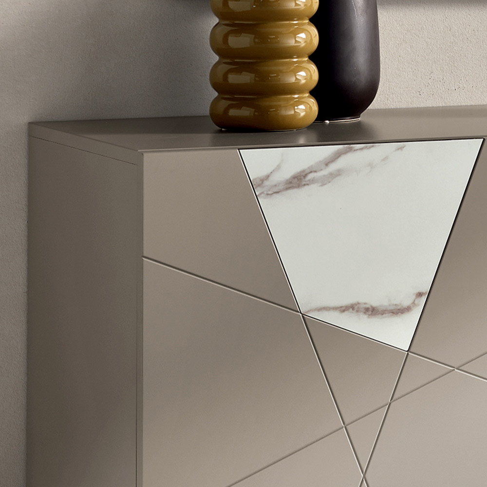 Strukturen är tillverkad av en melaminbelagd träram och pantograferade MDF-dörrar med dekorativa gravyrer som möts i en elegant geometrisk design. Glasinsatserna med marmoreffekt berikar ytan och skapar ett sofistikerat samspel mellan grafik och material.