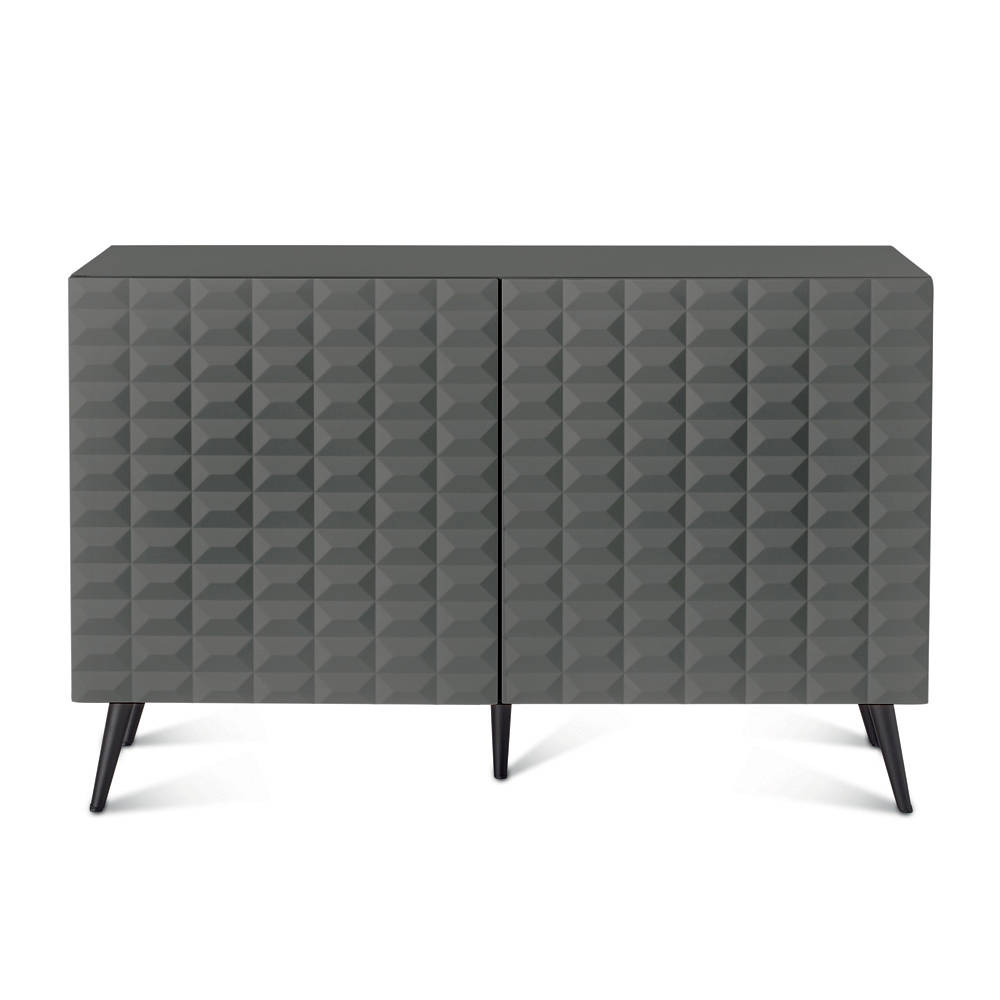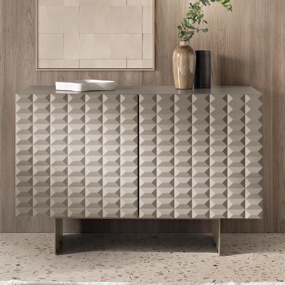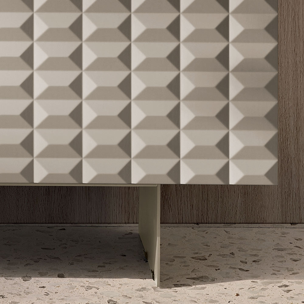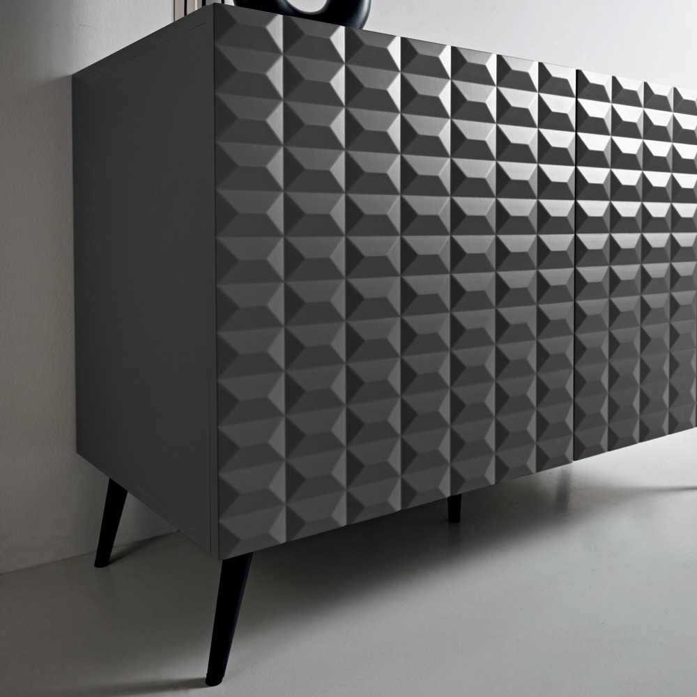 De PVC-belagda MDF-dörrarna har en tredimensionell geometrisk struktur som påminner om de berömda diamantformade relieferna, vilket skapar ett fascinerande samspel mellan ljus och skugga. Denna detalj ger visuellt djup och gör skänken till en sann mittpunkt i rummet.