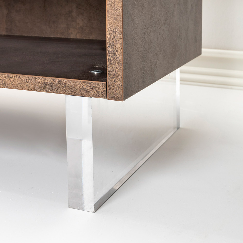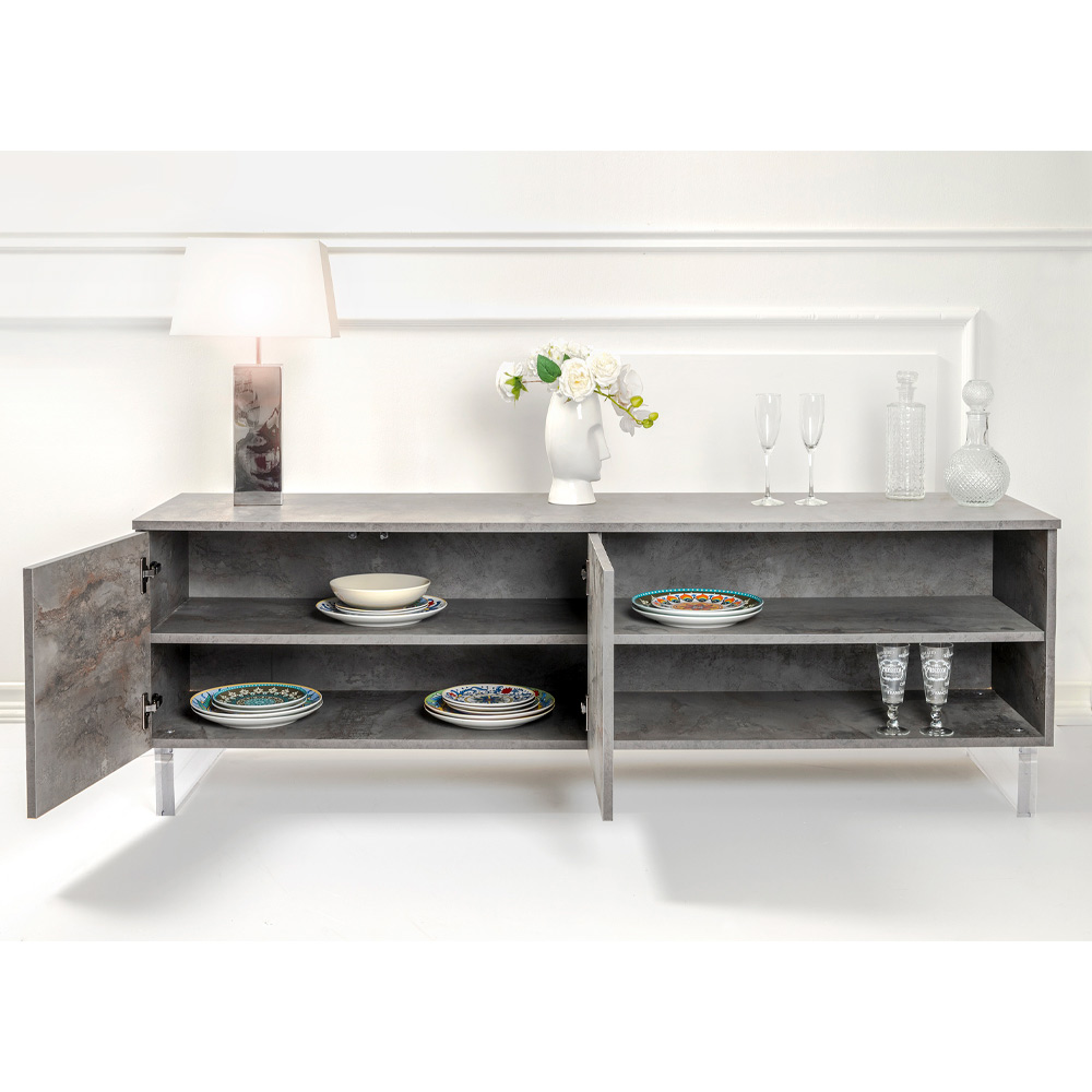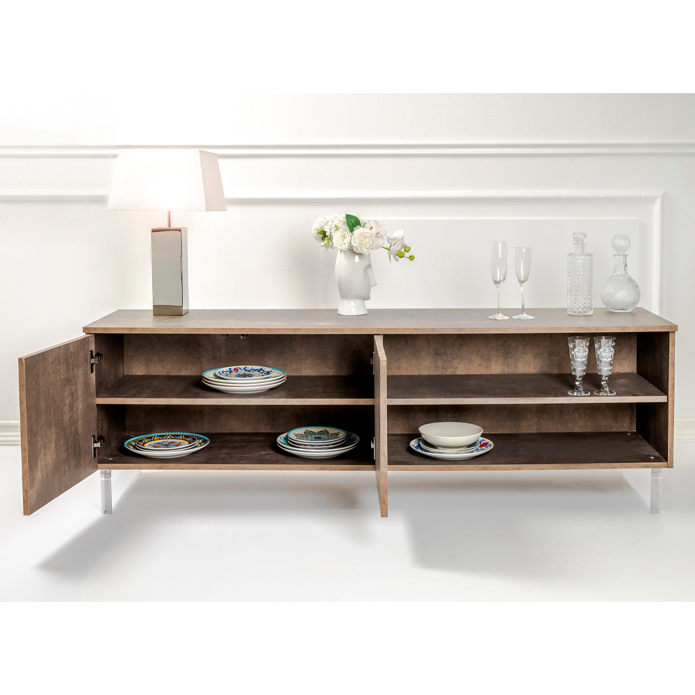 Skänken, med sina fötter i plexiglas, verkar vidröra marken, en designdetalj som ger en touch av modernitet och lätthet . Inuti väntar snygga hyllor för att rymma allt du älskar, från böcker till vardagliga föremål, och erbjuder en elegant lösning på behovet av organisation.