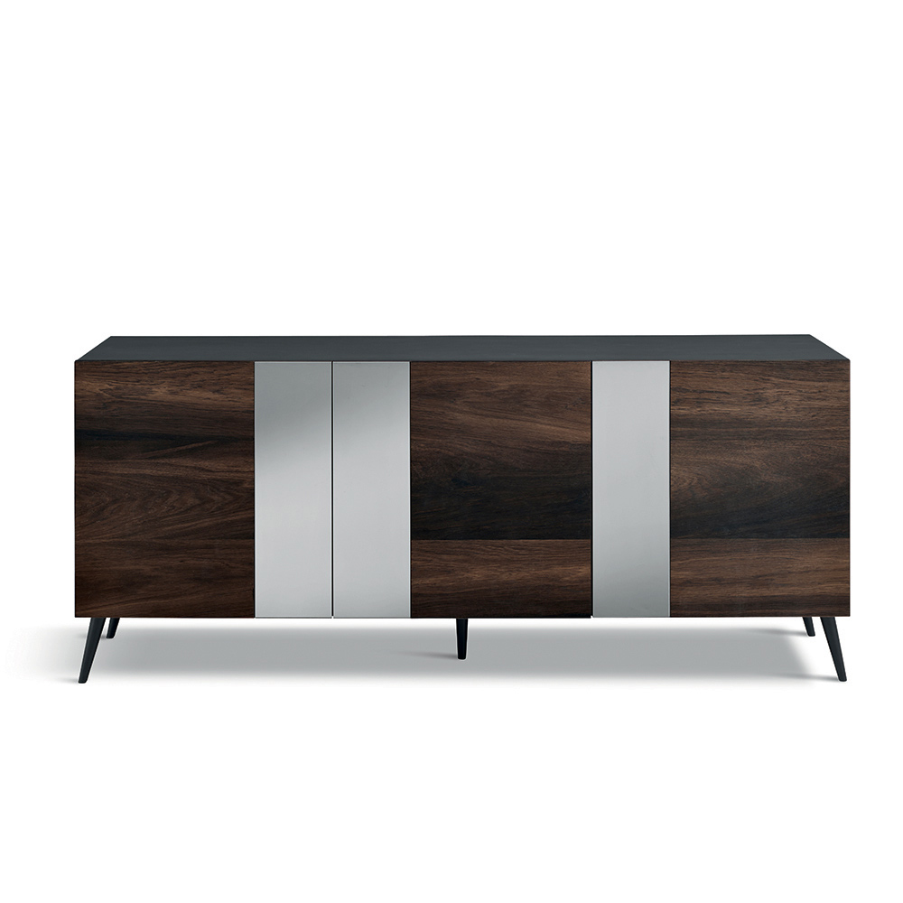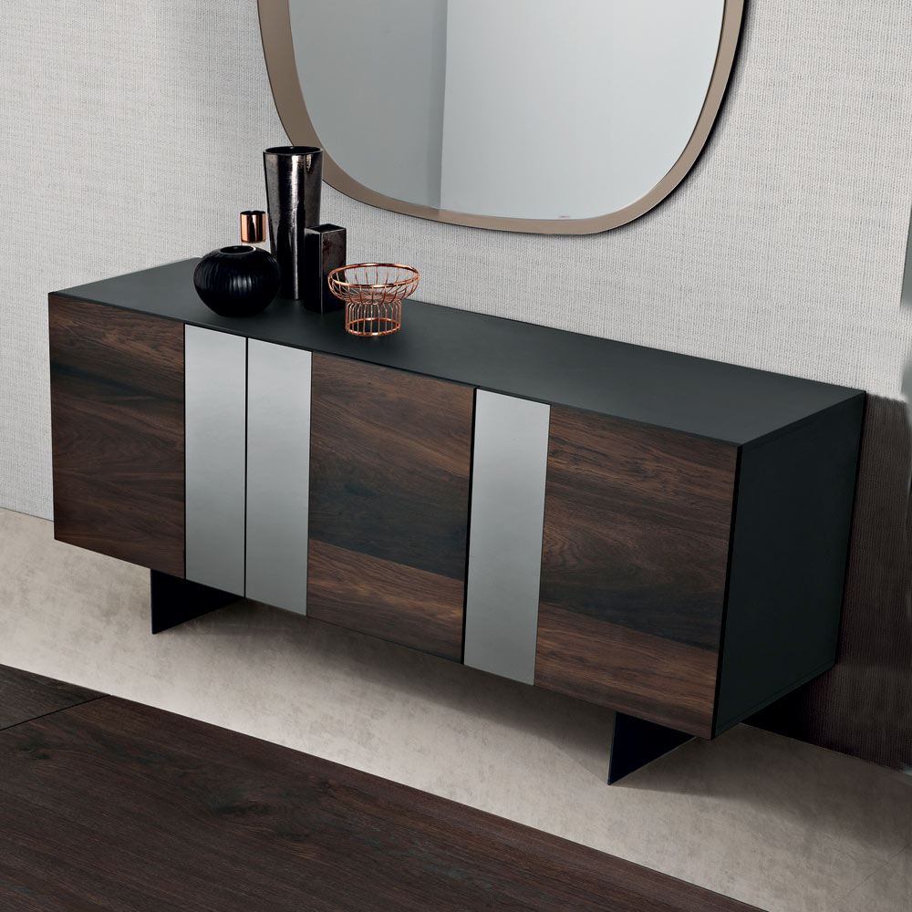Den antracitfärgade melaminbeklädda stommen har dörrar i ekfaner , avbrutna av vertikala speglade glasinsatser som visuellt effektiviserar kompositionen. Denna kontrast mellan det texturerade träet och spegelns reflektioner ger djup och rörelse, vilket gör skänken elegant och dynamisk.