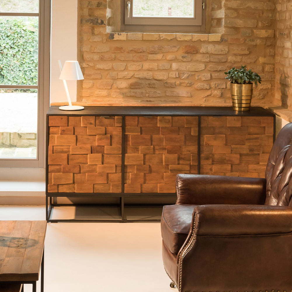 Inomhusskänk av naturligt kaffefärgat återvunnet trä med 3 ytterdörrar i lappträ och stomme i borstad svart metall.