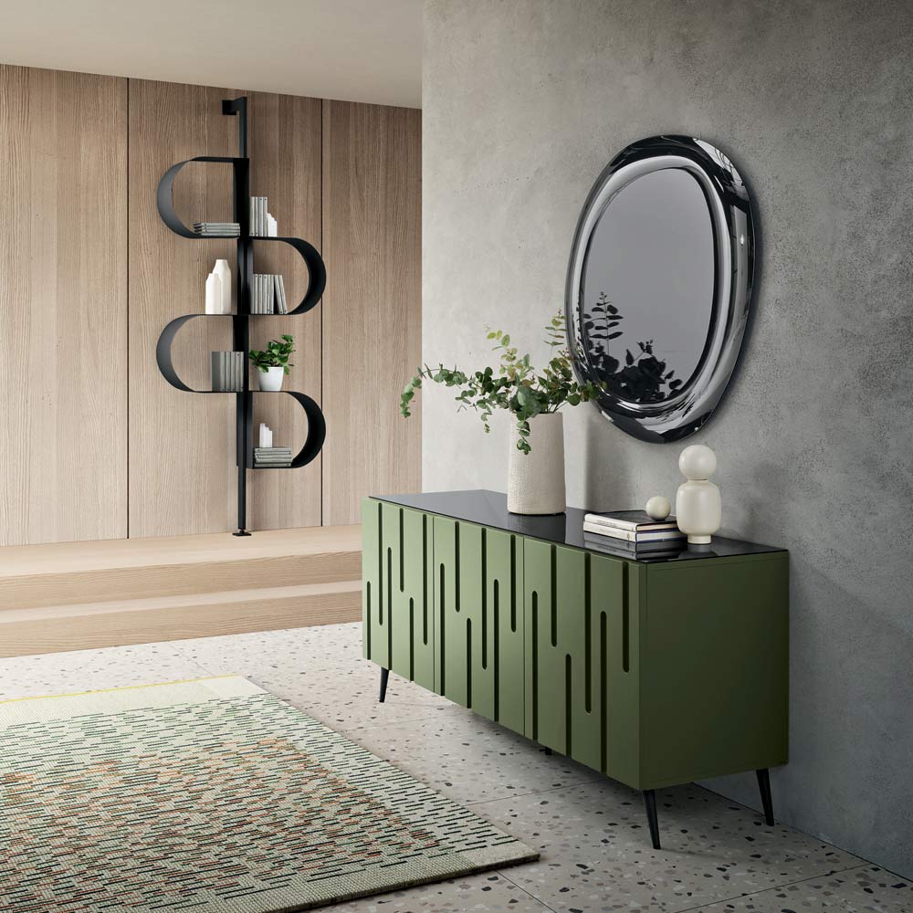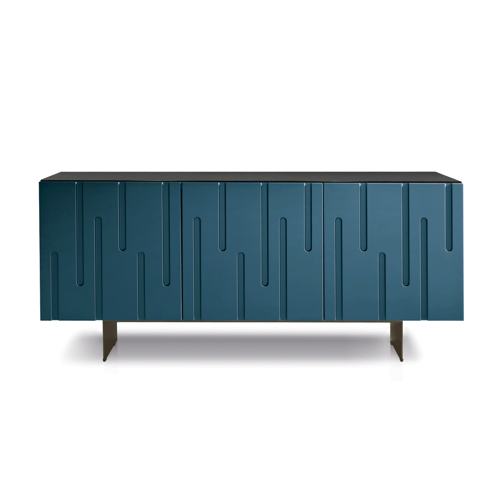 Ett elegant designerskänk tillverkat i Italien , perfekt för att stilfullt inreda ditt vardagsrum eller matplats . Dess moderna design utmärker sig genom sin starka skulpturala karaktär, som förvandlar förvaringsenheten till ett visuellt slående dekorativt element.