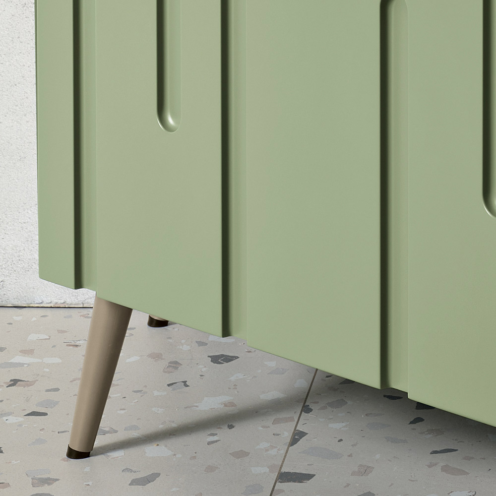 De PVC-belagda MDF-dörrarna har oregelbundna vertikala snitt som påminner om det naturliga flödet av stalaktiter och stalagmiter , vilket skapar en raffinerad, texturerad och dynamisk effekt. Detta samspel av reliefer ger djup och rörelse åt ytan, vilket förstärker ljuset och gör skänken till rummets mittpunkt.