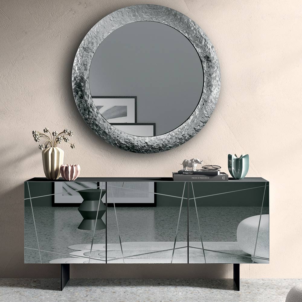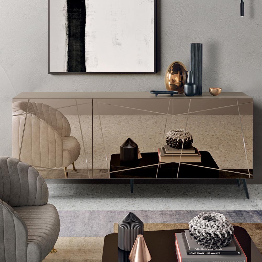 Melaminstommen har dörrar täckta med bronsfärgat eller rökfärgat spegelglas , utsmyckade med dekorativa gravyrer som flätas samman i en elegant grafisk design. Denna detalj förstärker den reflekterande ytan och skapar ett raffinerat samspel mellan ljus och djup.