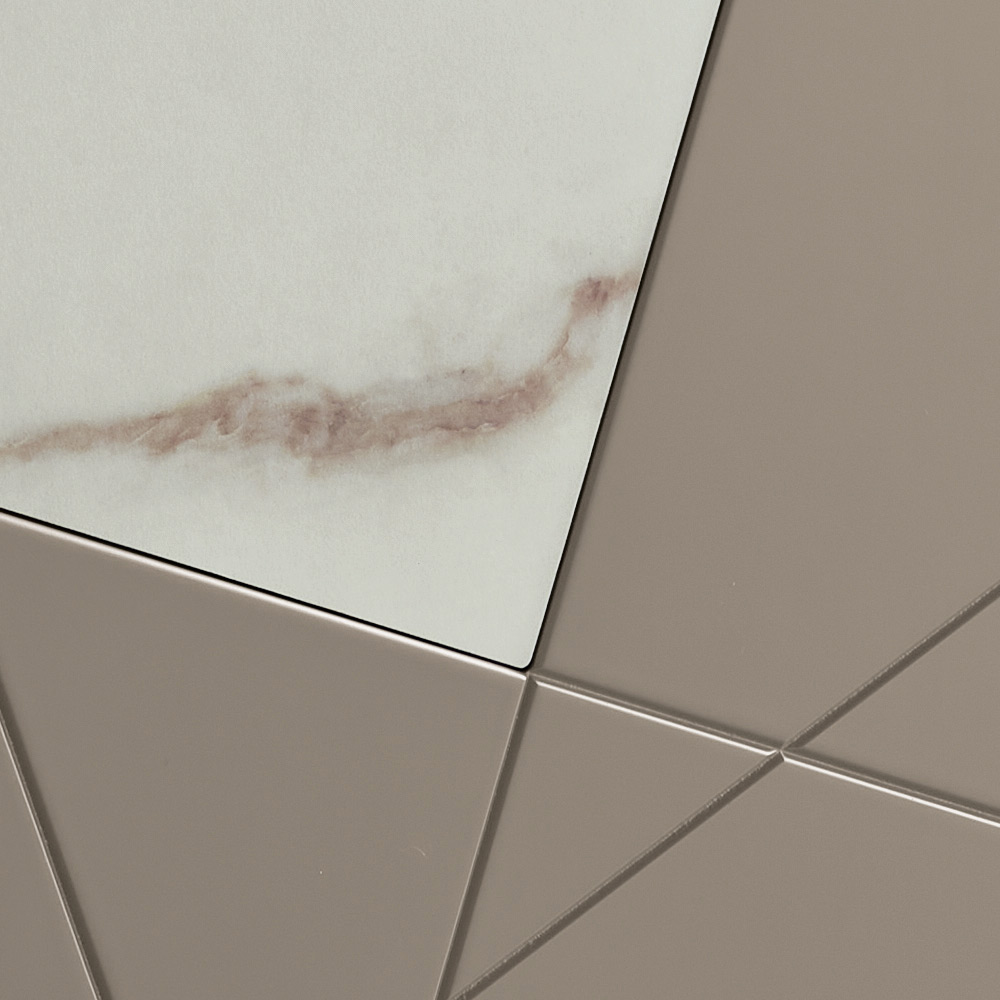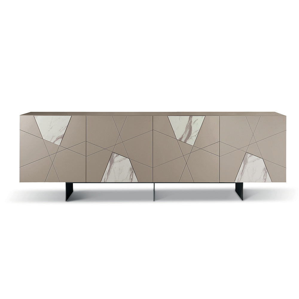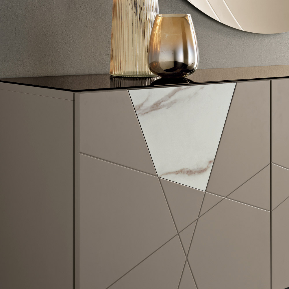 Strukturen är tillverkad av ett melaminbelagt träskal, en spegelglasskiva och pantograferade MDF-dörrar med dekorativa gravyrer som flätas samman i en elegant geometrisk design. Glasinsatser med marmoreffekt berikar ytan och skapar ett sofistikerat samspel mellan grafik och material.
