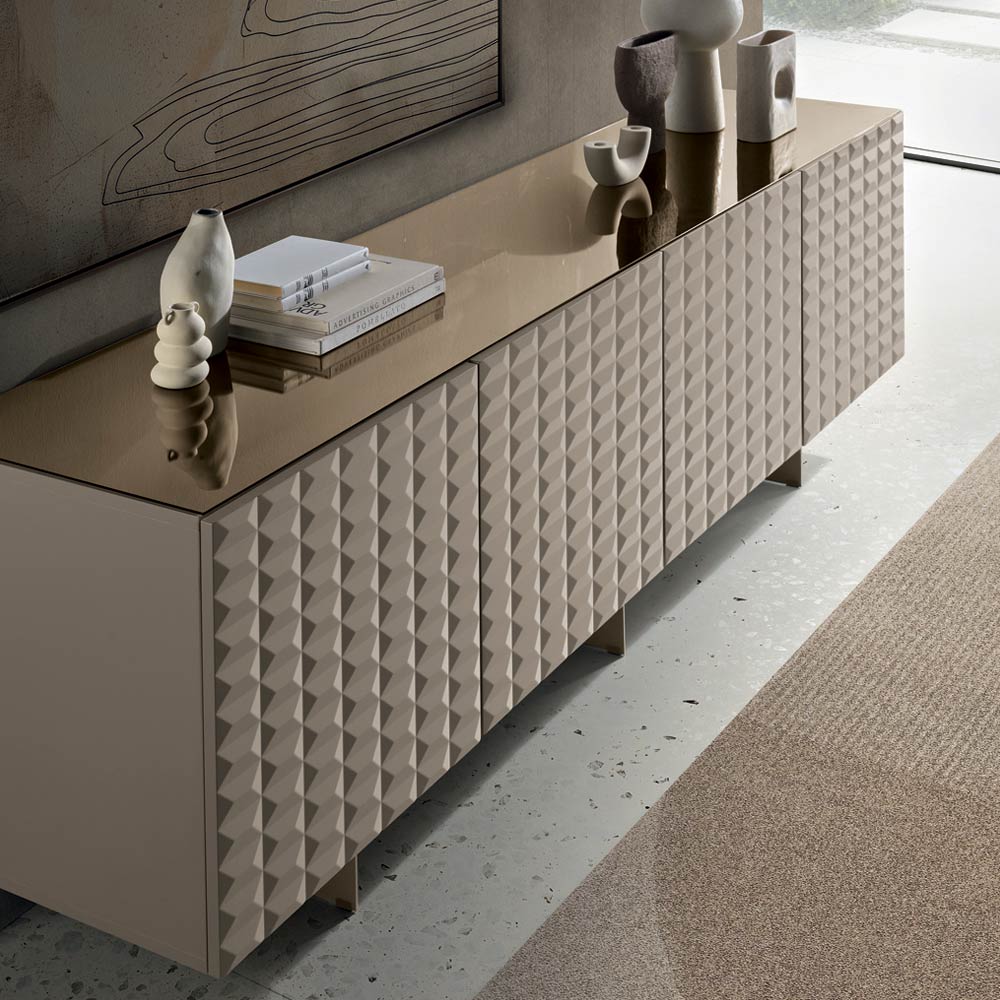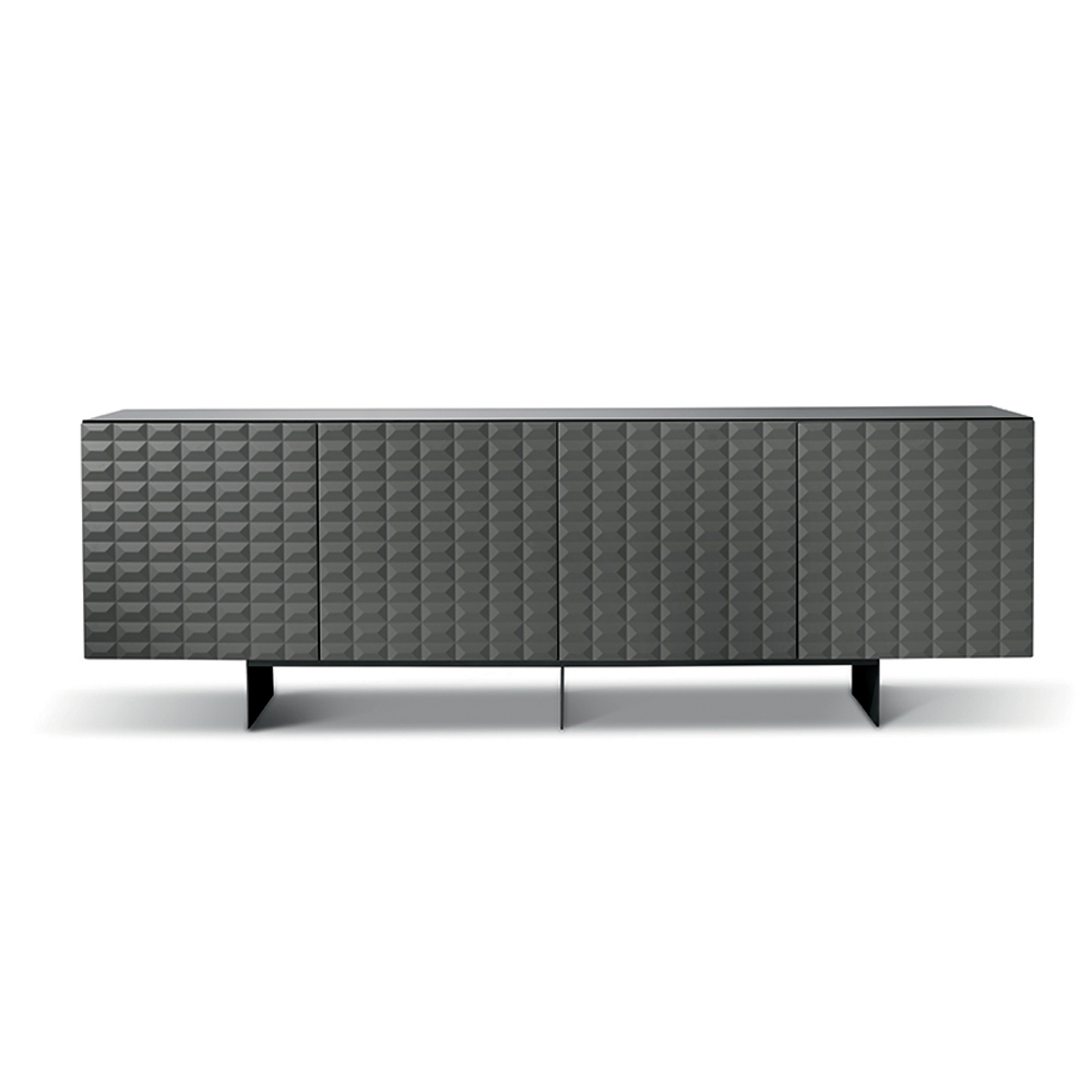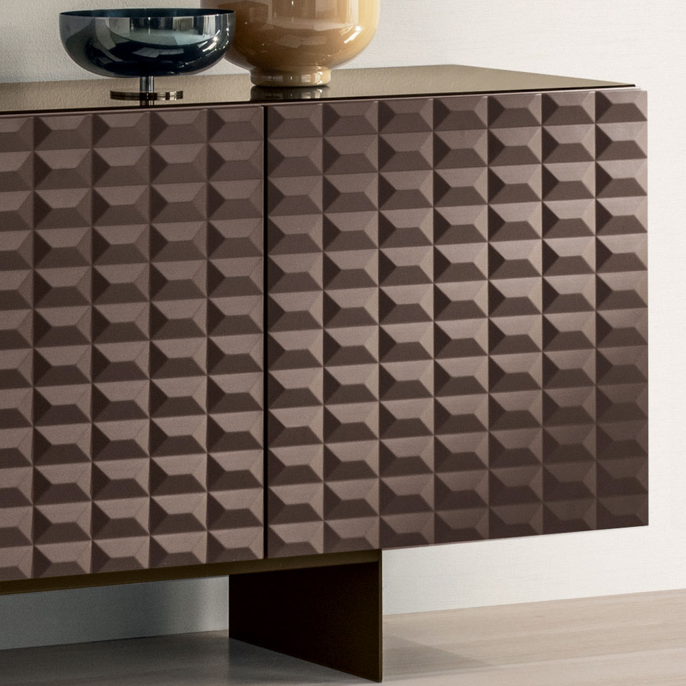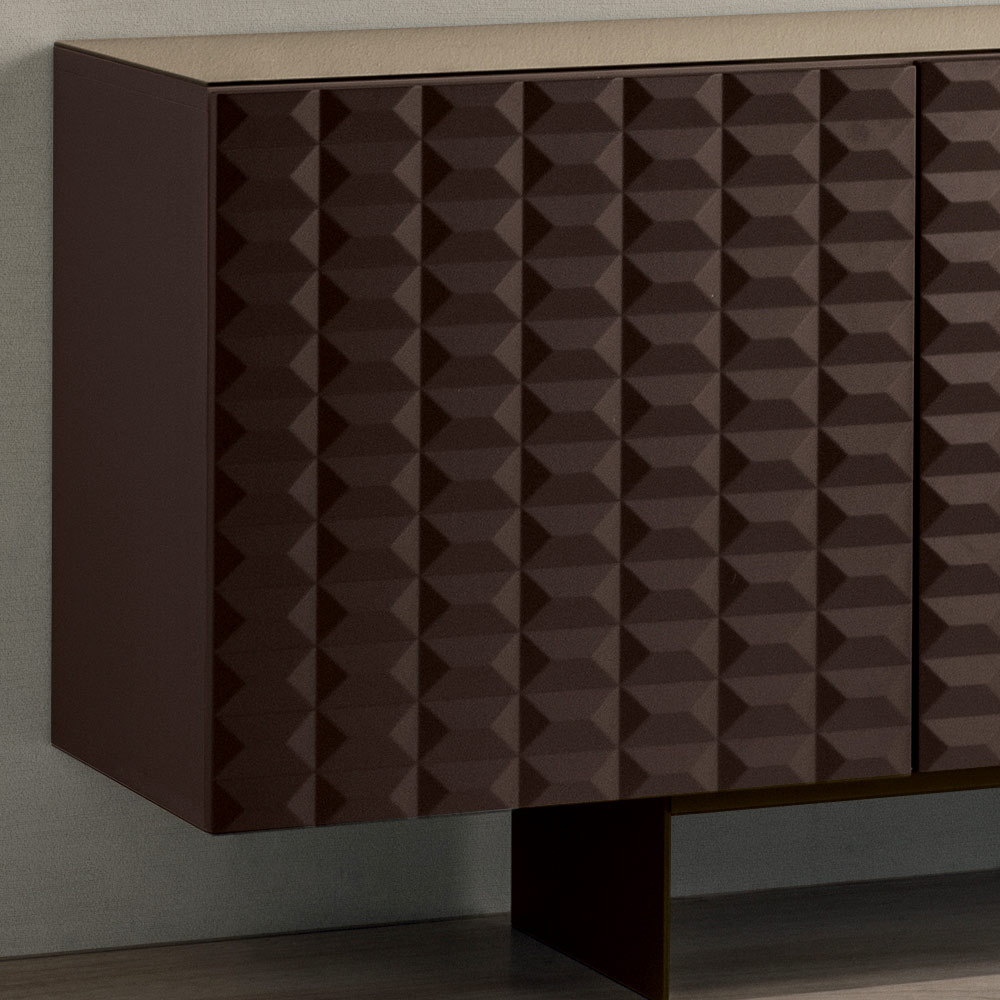 De PVC-belagda MDF-dörrarna har en tredimensionell geometrisk struktur som påminner om de berömda diamantformade relieferna, vilket skapar ett fascinerande samspel mellan ljus och skugga. Denna detalj ger visuellt djup och gör skänken till en sann mittpunkt i rummet.