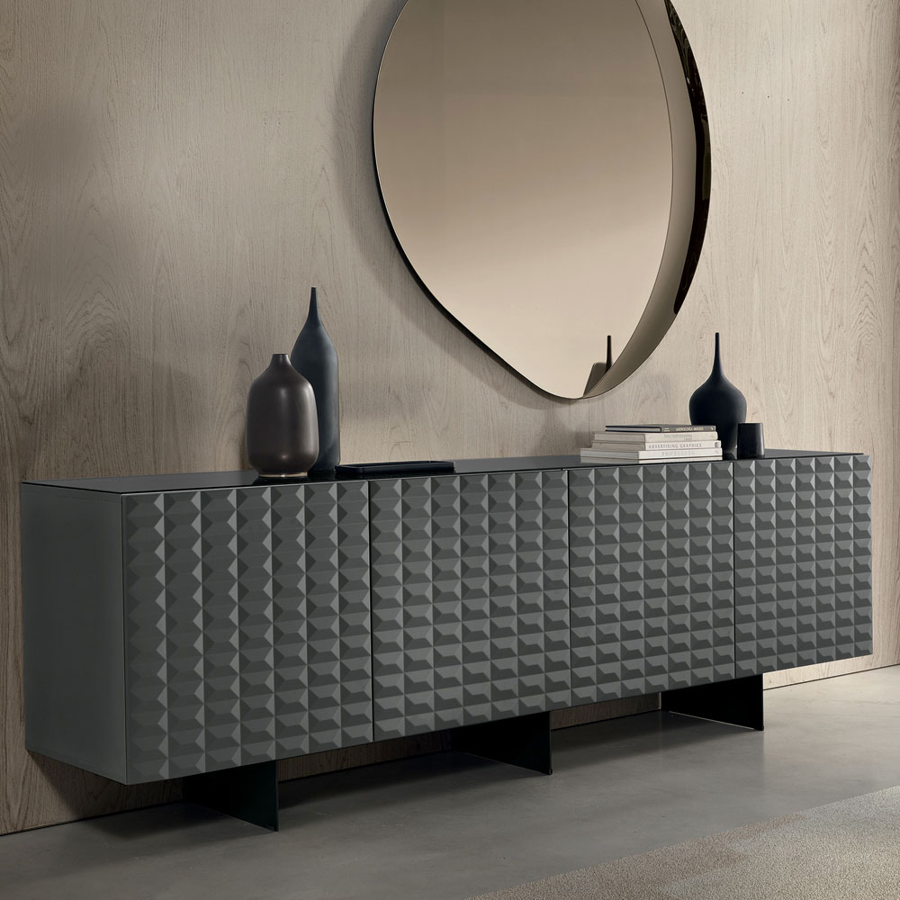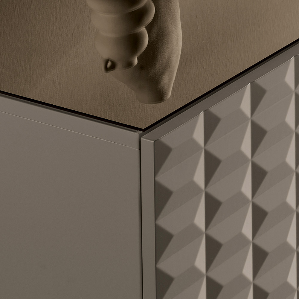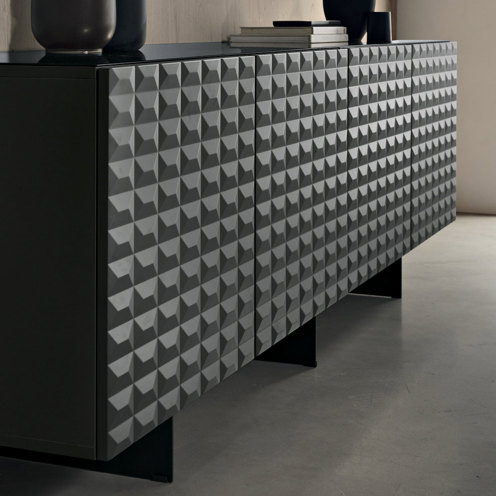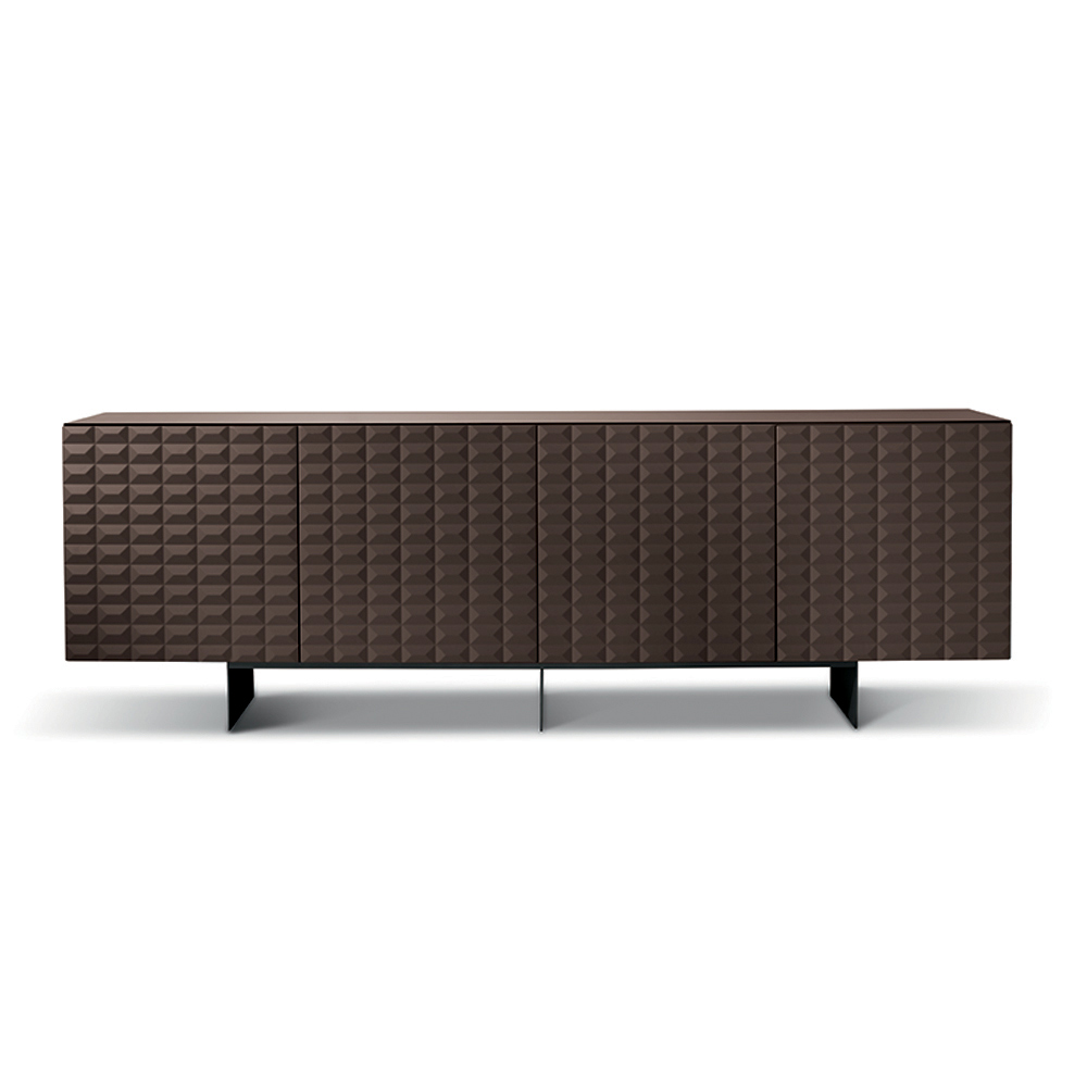 De PVC-belagda MDF-dörrarna har en tredimensionell geometrisk struktur som påminner om de berömda diamantformade relieferna, vilket skapar ett fascinerande samspel mellan ljus och skugga. Denna detalj ger visuellt djup och gör skänken till en sann mittpunkt i rummet.