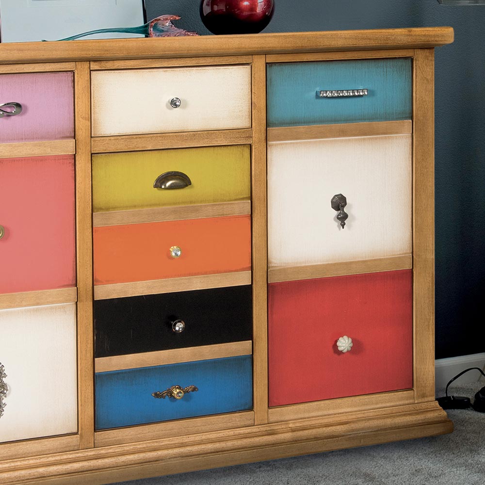 Made in Italy. Glädje och lekfullhet är egenskaperna som beskriver detta element med starka ljusa färger och handtagens speciella former. En original omtolkning av en möbel med stor