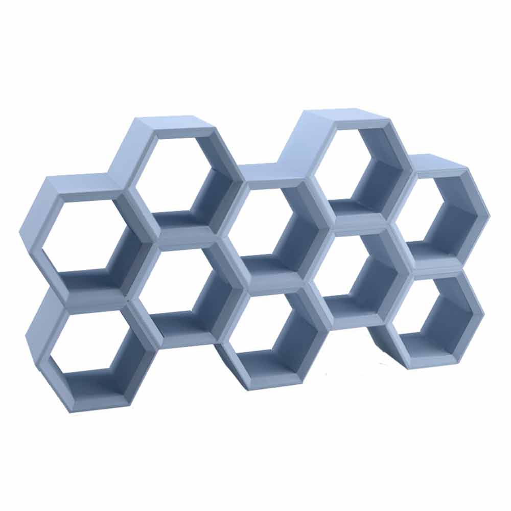 Hexa är en bokhylla i polyeten vars form är inspirerad av naturen. De sammankopplade cellerna som den består av bildar en mångsidig möbel som lämpar sig för både hushålls- och icke-hembruk. Den geometriska formen är elegant och med sina sex sidor tillåter den minst två stödsidor för varje utrymme.