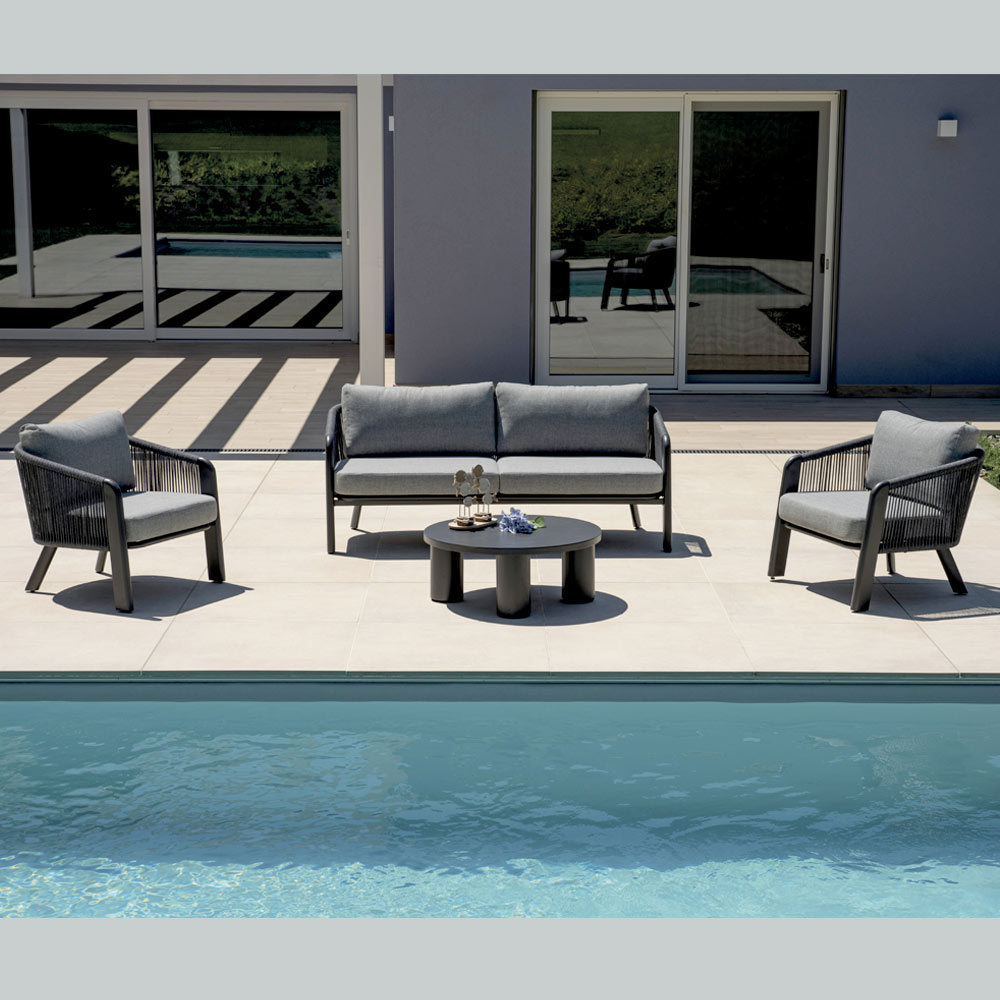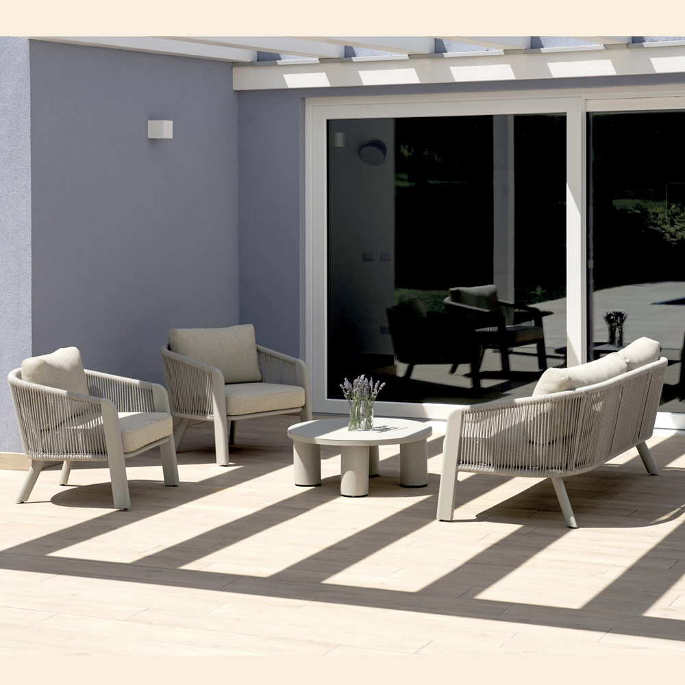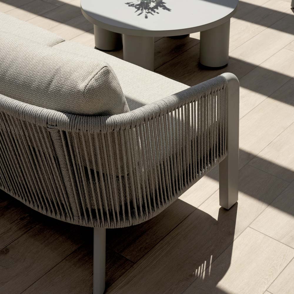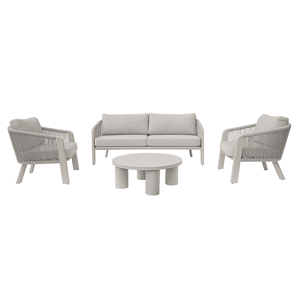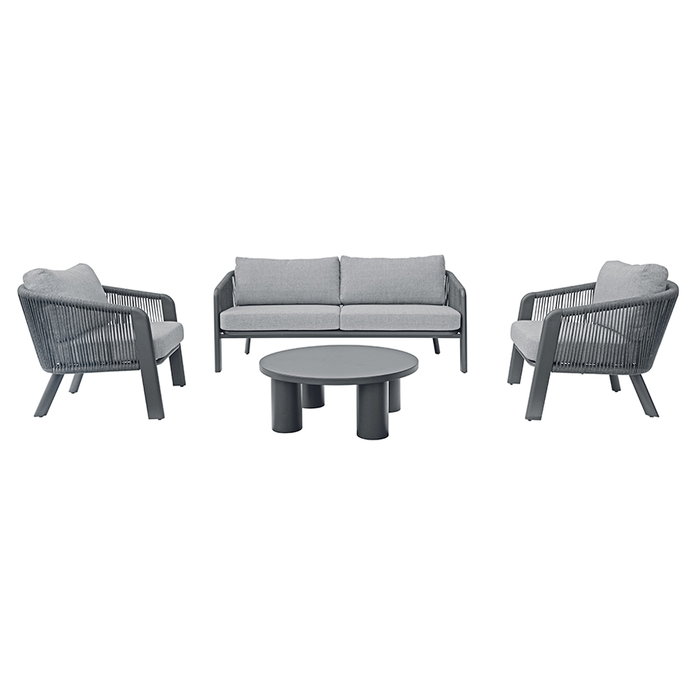 Aluminiumramen säkerställer lätthet, soliditet och hållbarhet, medan det vävda repet elegant omsluter sitsar och ryggstöd, vilket skapar en modern men ändå naturlig visuell effekt. De avtagbara kuddöverdragen säkerställer maximal komfort och enkelt underhåll, vilket bibehåller vardagsrummets prydliga och raffinerade utseende över tid.